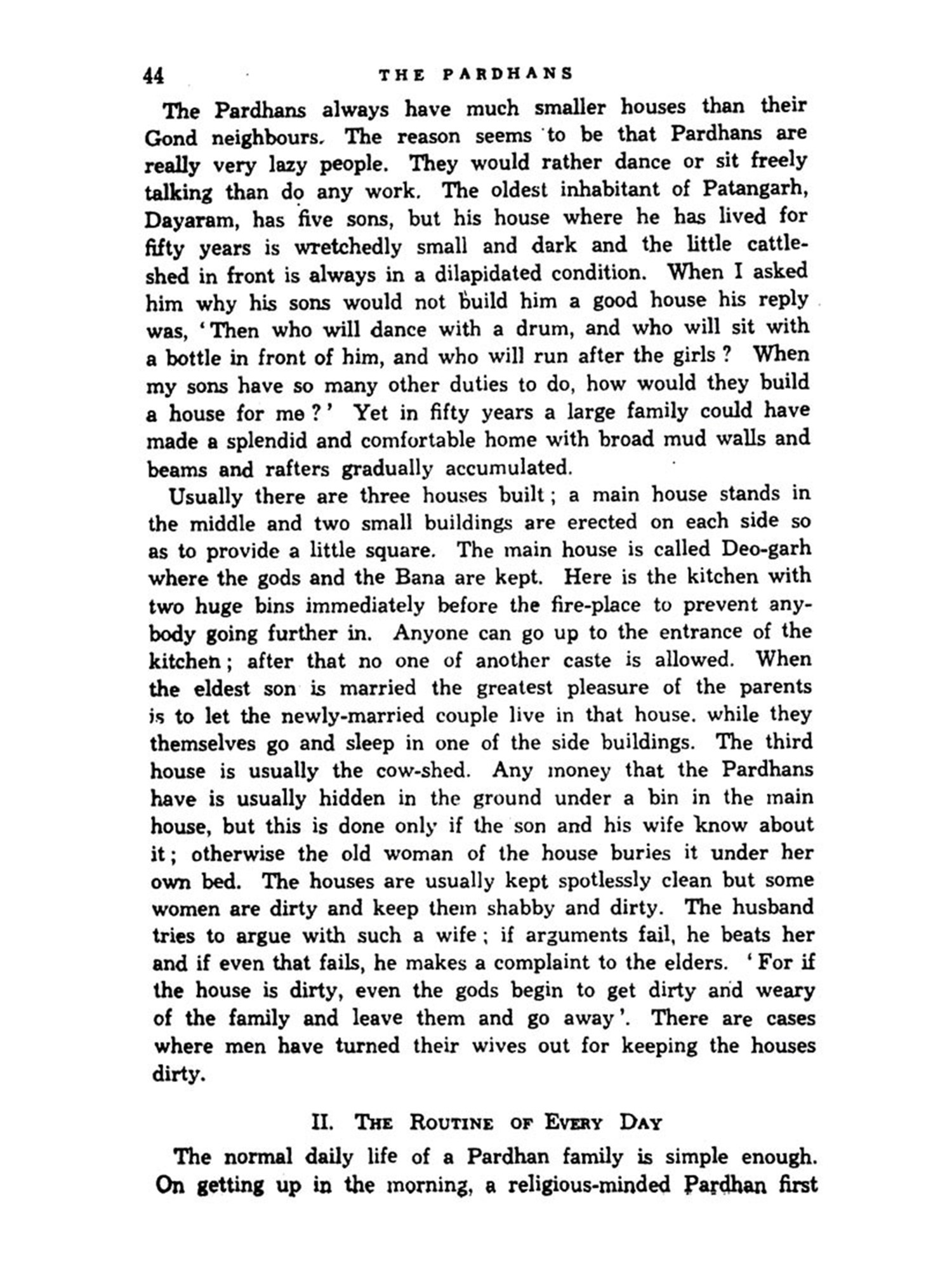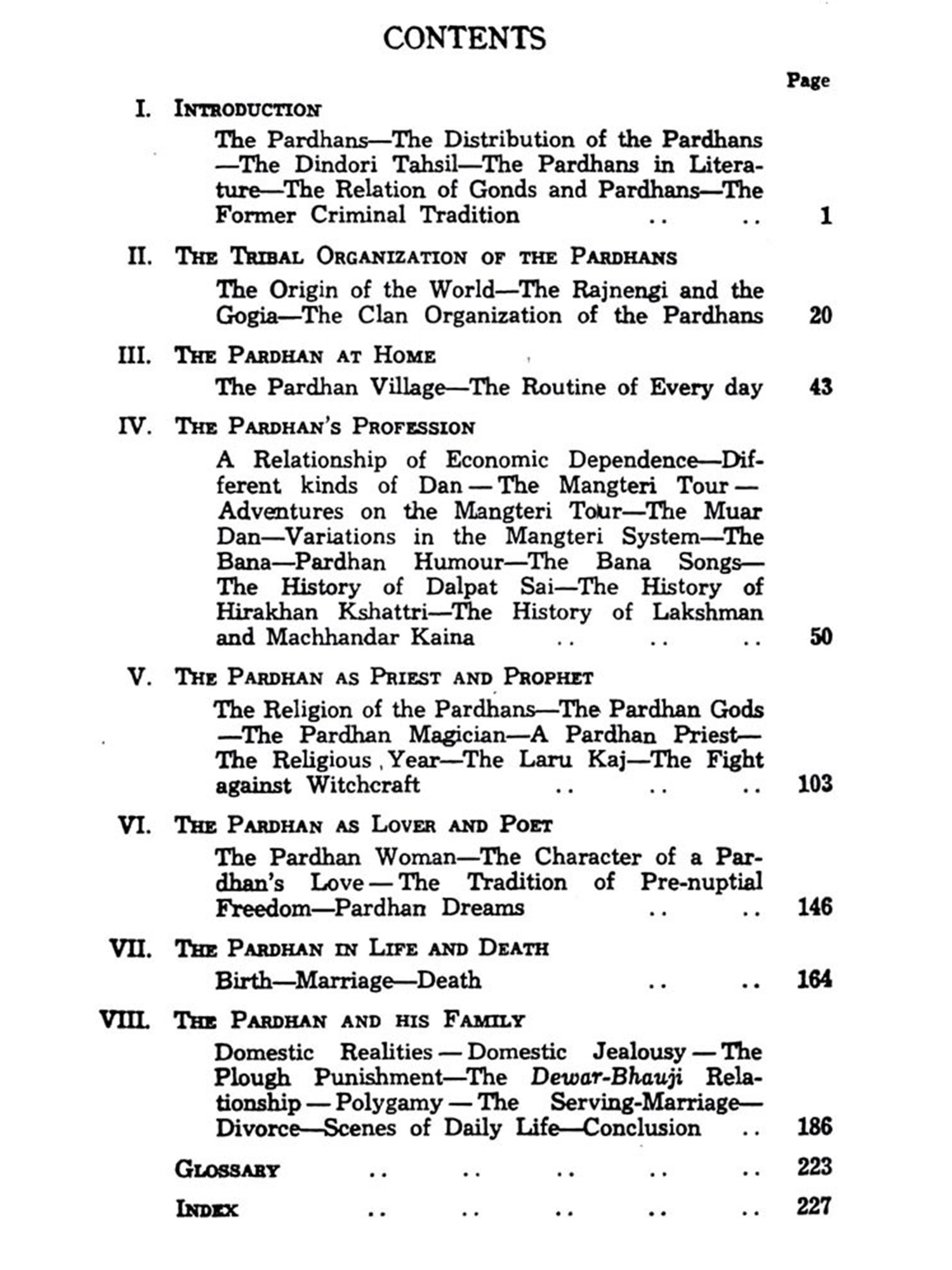 In the present monograph Shamrao Hivale has given us the fruit of many years of study. It is over a decade since I suggested to him that the Pardhans among whom we lived were worthy of investigation. On this book therefore he has spent nearly twelve years and what years! Shamrao Hivale is not, it is true, a Pardhan, but he is an Indian. There are no artificial barriers of colour, language or manners to divide him from the people. He has been able to spend his whole time among them and give them his entire attention. Wisely he has not hurried. He has approached his task with the most becoming humility. He is not a trained anthropologist; he lays no claim to extensive reading (though he has had access all these years to an excellent library and has made good use of it); he has no theories to exploit. He has lived with the people as their doctor, teacher, magistrate, champion, above all as their friend. They love him. He is their Chhota Bhai (little brother). His house is always thronged with visitors. Villagers sometimes come a hundred miles for his advice. When he goes out he finds it hard to get along the road, so many people want to see him. He has always had a special relationship with the Pardhans, of whom he is very fond. He has thus had a unique opportunity to obtain the facts about them. I will not say that nothing is hidden from him but I do say that few investi-gators have entered more fully into the life of their people.