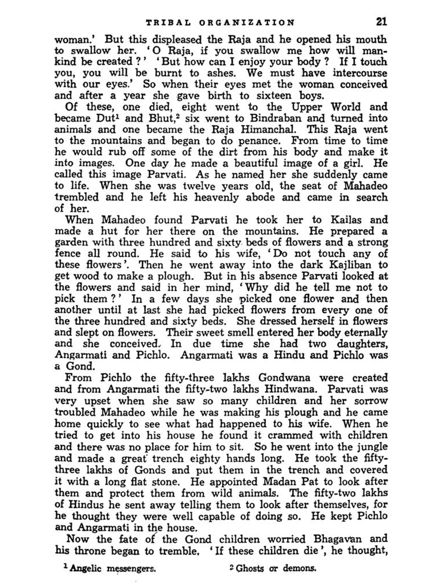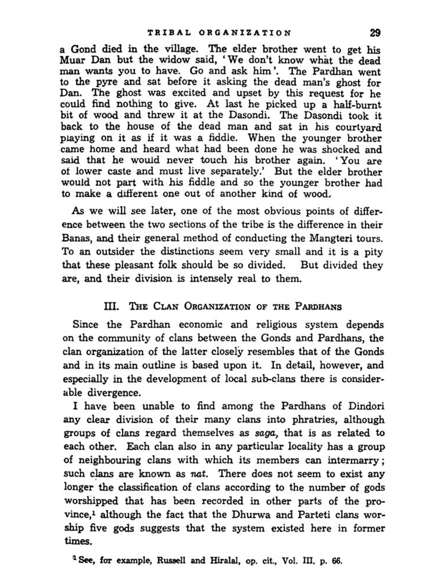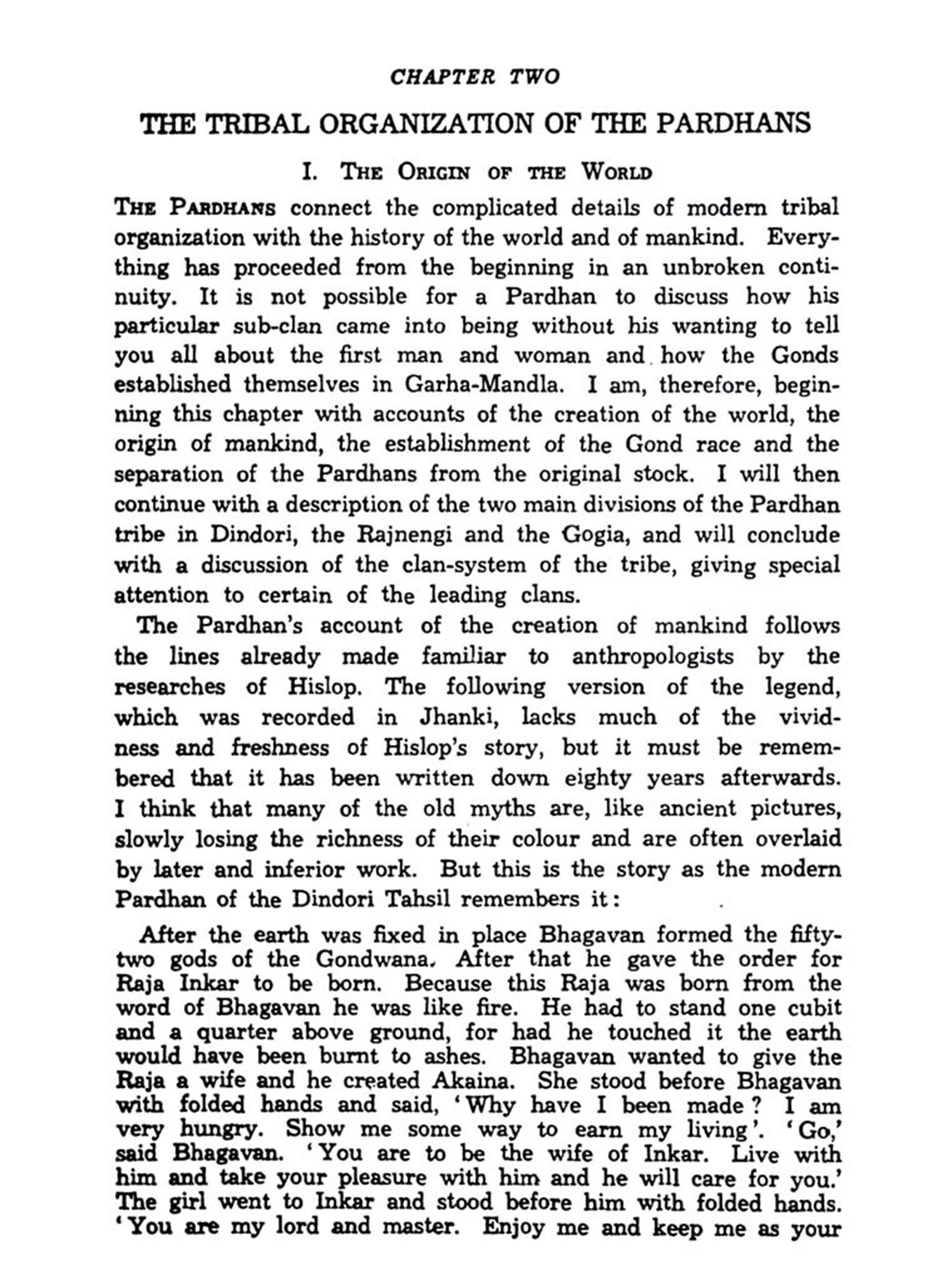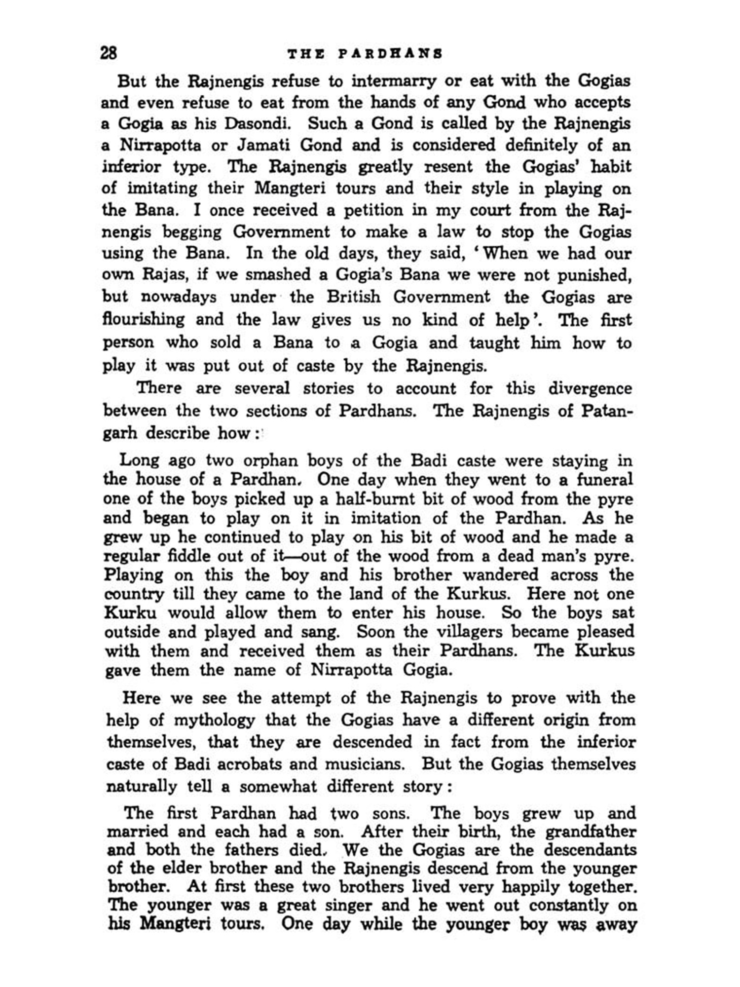 THE PARDHANS are a branch of the great Gond tribe now some three million in number, and although they are only four per cent in numerical strength of the whole tribe, they have always made an important contribution to its life. In the old days they were probably the official genealogists of the Gond courts. They acted as priests and diviners. They were the musicians of the tribe, retaining in their memories and constantly recounting the glorious history of the ancient Gond kingdoms. Their women acted as midwives to the Gonds, and tattooed Gond girls. With the collapse of the Gond kingdoms, the Pardhans shared the failing fortunes of the race. Always dependent on the senior tribe, they now found the Gonds unable to support them properly. They were driven to crime and sank in the social scale. Later they recovered themselves and today the Pardhans remain, what apparently they always have been, a tribe of witty, charming, intelligent people, whose fundamental interest is in music and song. Their connection with the Gonds, which I study in a later chapter, is of an intimate and peculiar kind. Through their relation as ritual beggars, they stand in a position of economic dependence upon them. It is unthinkable that the Pardhans should exist apart from the Gonds. It is equally impossible for Gond life and culture to find its full expression without the Pardhans. The Pardhans are known by a number of different names. The word Pardhan itself comes from the Sanskrit and means a Minis-ter, sometimes a Prime Minister. The Gondi word seems to be Pana. A very common name, but one which the Pardhans them-selves sometimes resent, is Pathari. They are also called Desai, a relic from Maratha days, and Parganiha. In Balaghat they are called Mokasi or Bhau. For all these words the Pardhans have fantastic derivations. Pana is traced to pahuna, a visitor. Pardhan is said to mean 'one who eats other people's rice para: others' and dhan: 'rice'. Another derivation is from par: embankment' and dhan: 'rice', and refers to a tradition that the first Pardhan was born on the embankment of a rice-field.
