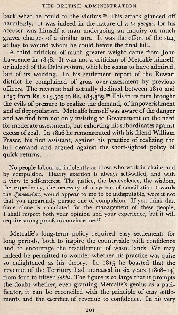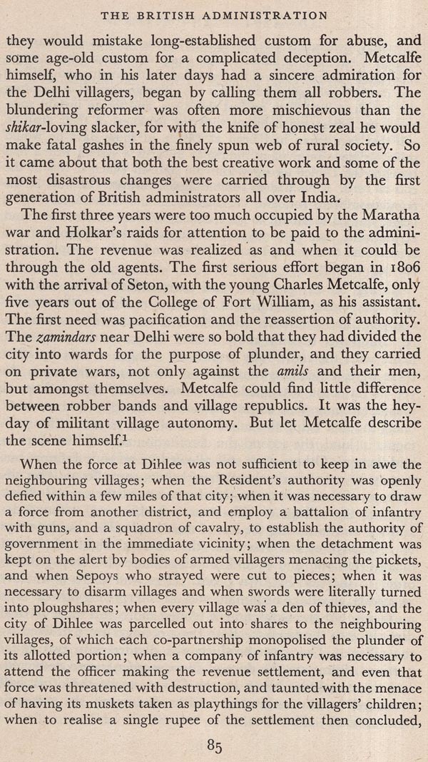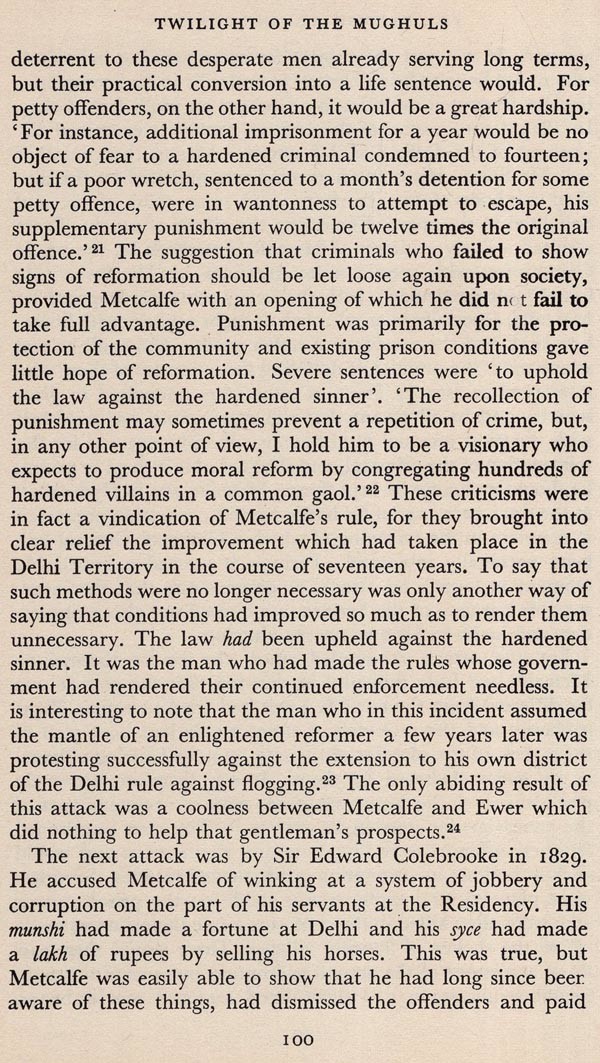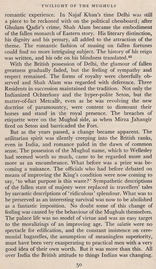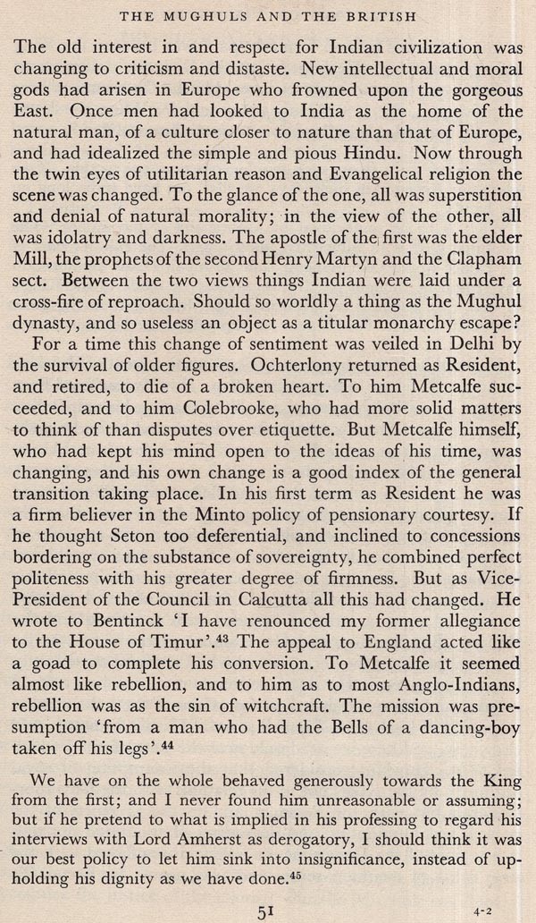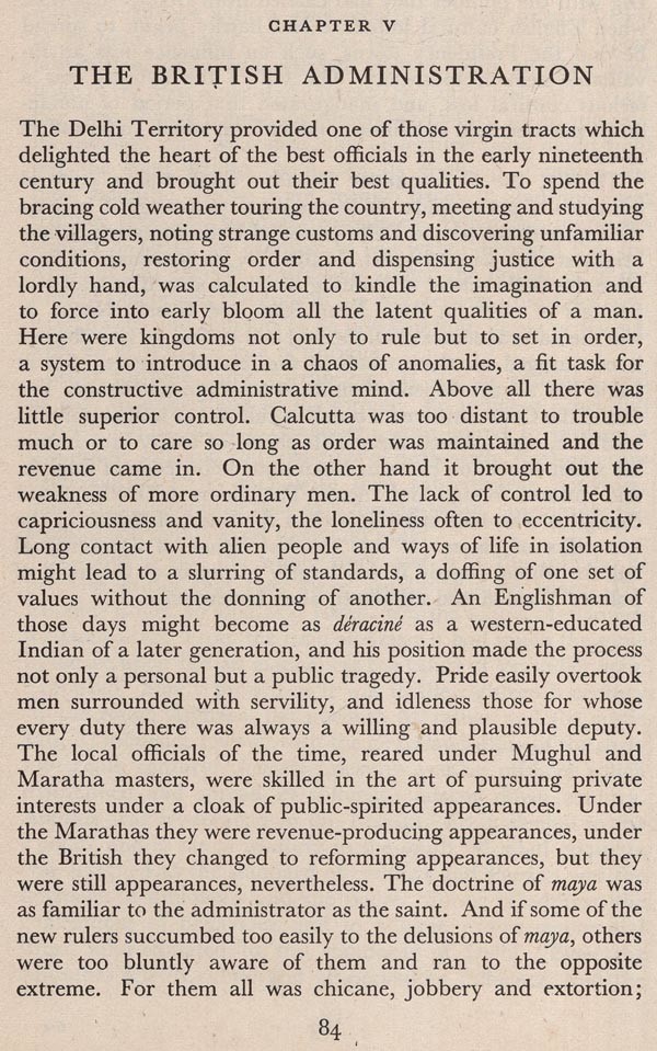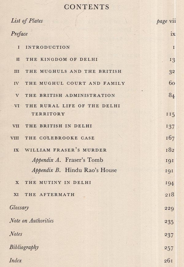 The second part of the book consists of a series of studies of the Delhi city and Territory under British administration from 1803-57. This part falls into three sections. The first deals with the relations of the British with the Mughul emperors or 'Kings of Delhi' and the internal life of the Mughul family. The second is a study of the British administration of the Delhi Territory and specially of the 'Metcalfe system'. This has been dealt with by Kaye and Thompson in their lives of Charles Metcalfe, but from a different point of view. The third deals with a number of separate topics-British life in Delhi, the Colebrooke case, the Fraser murder and finally the Mutiny and its aftermath in Delhi mainly from the Indian point of view.