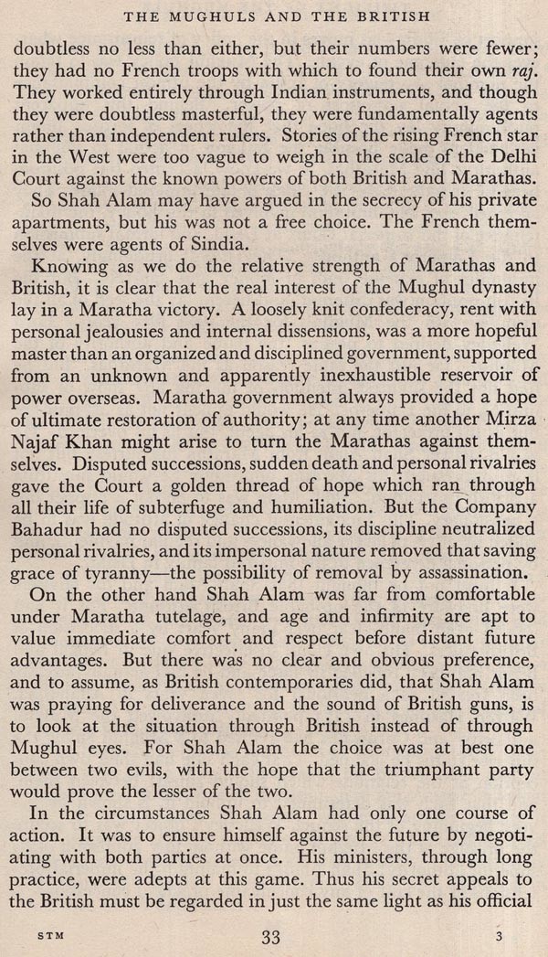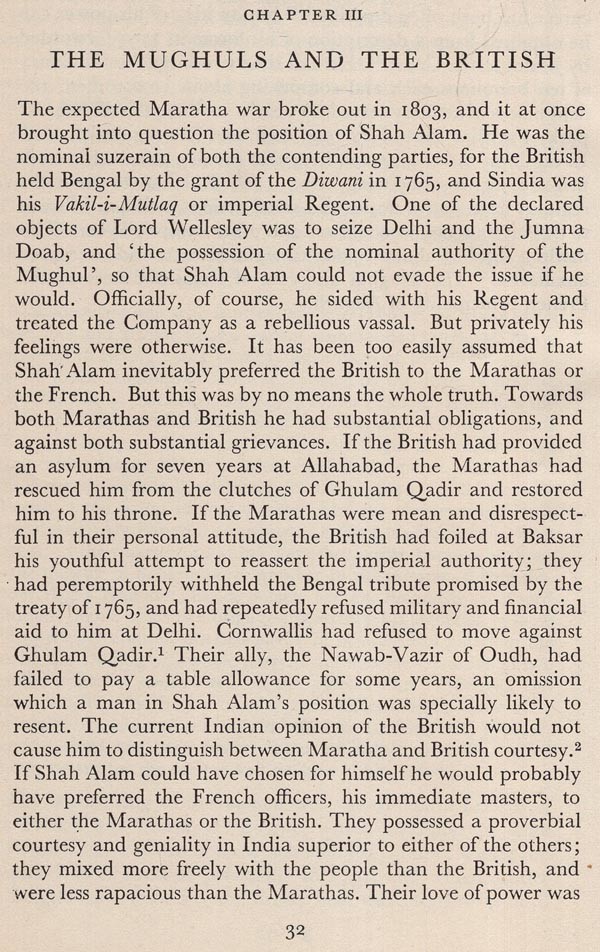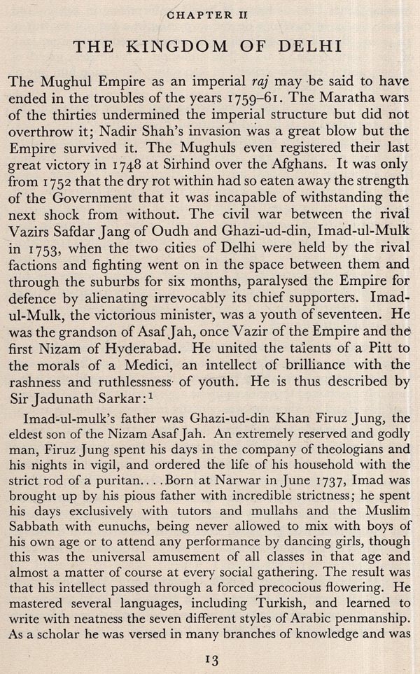 The first section of the book is a sketch of the Kingdom of Delhi until the British conquest in 1803, special attention being paid to the period 1782-8 when the kingdom passed from a precarious independence to Maratha control. While secondary authorities have been largely used for this period, the object being to analyse and co-ordinate already available material, original sources have been used for the vital years 1782-88.