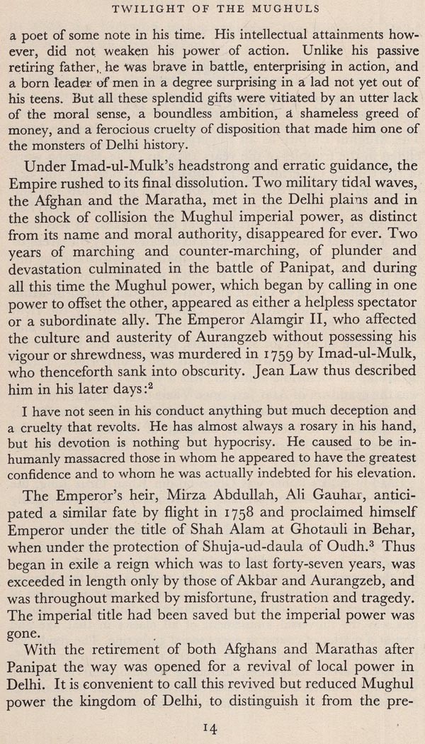 Two hundred years ago Delhi had been a great and imperial city for a century, with anything between one and two million inhabitants. It was the largest and most renowned city, not only of India, but of all the East from Constantinople to Canton. Its Court was brilliant, its mosques and colleges numerous, and its literary and artistic fame as high as its political renown. Within fifty years its provinces vanished, its wealth was plundered, its Emperor was blinded, and the city shrank to be a provincial capital of less than two hundred thousand people. The greatness of the change is not appreciated because the magnitude of Mughul Delhi is not realized. The main steps in the decline, the sacks of Nadir Shah and Ahmad Shah Abdali, the civil wars of the 'omrahs' or nobles, the atrocities of Ghulam Qadir Khan, are well known. But the drama which accompanied these events, the ebb and flow of changing fortune, the alternating hopes and deepening gloom, are too often disregarded in the facile terms 'decadence', 'effete glory' and 'inevitable decline'. Because Delhi is great now, with its new-planned capital city, it is forgotten that it was ever great before; because the disorders which now occur are within the city itself the days are forgotten when every village was a walled fortress, when no one could travel without an escort, and when robbers picked off unwary travellers from behind the walls of decaying monuments. The Mutiny is commonly the only dramatic event connected with the history of Delhi; to the Delhi-wallah it is an isolated catastrophe not comparable to the disasters of the previous century.