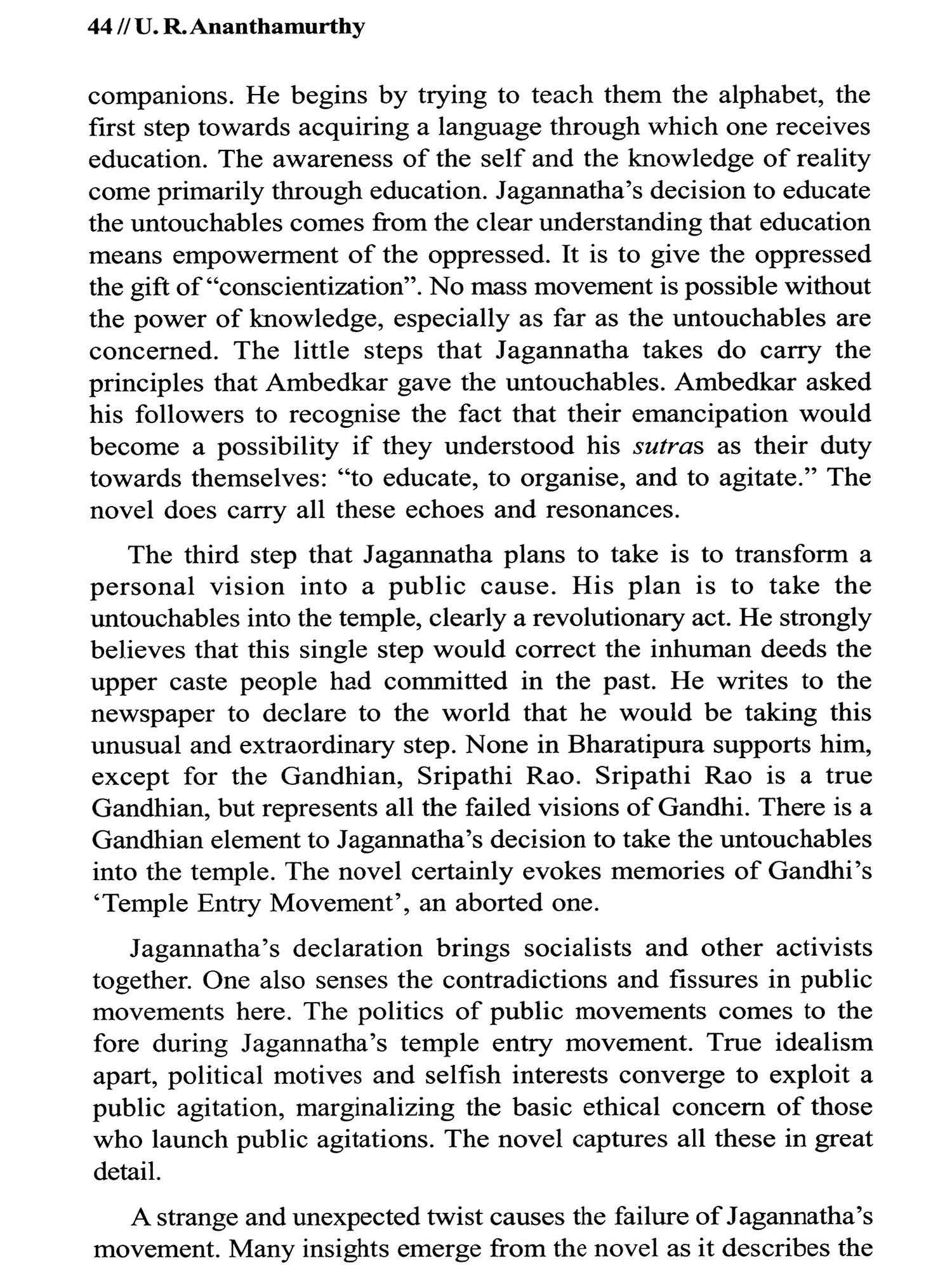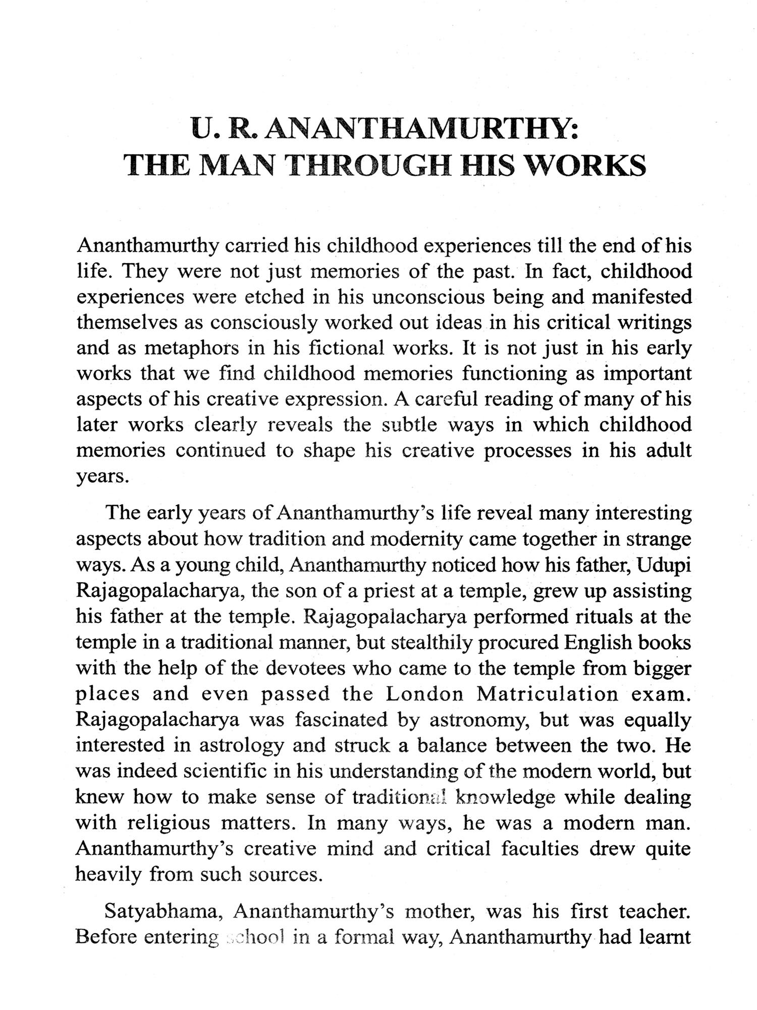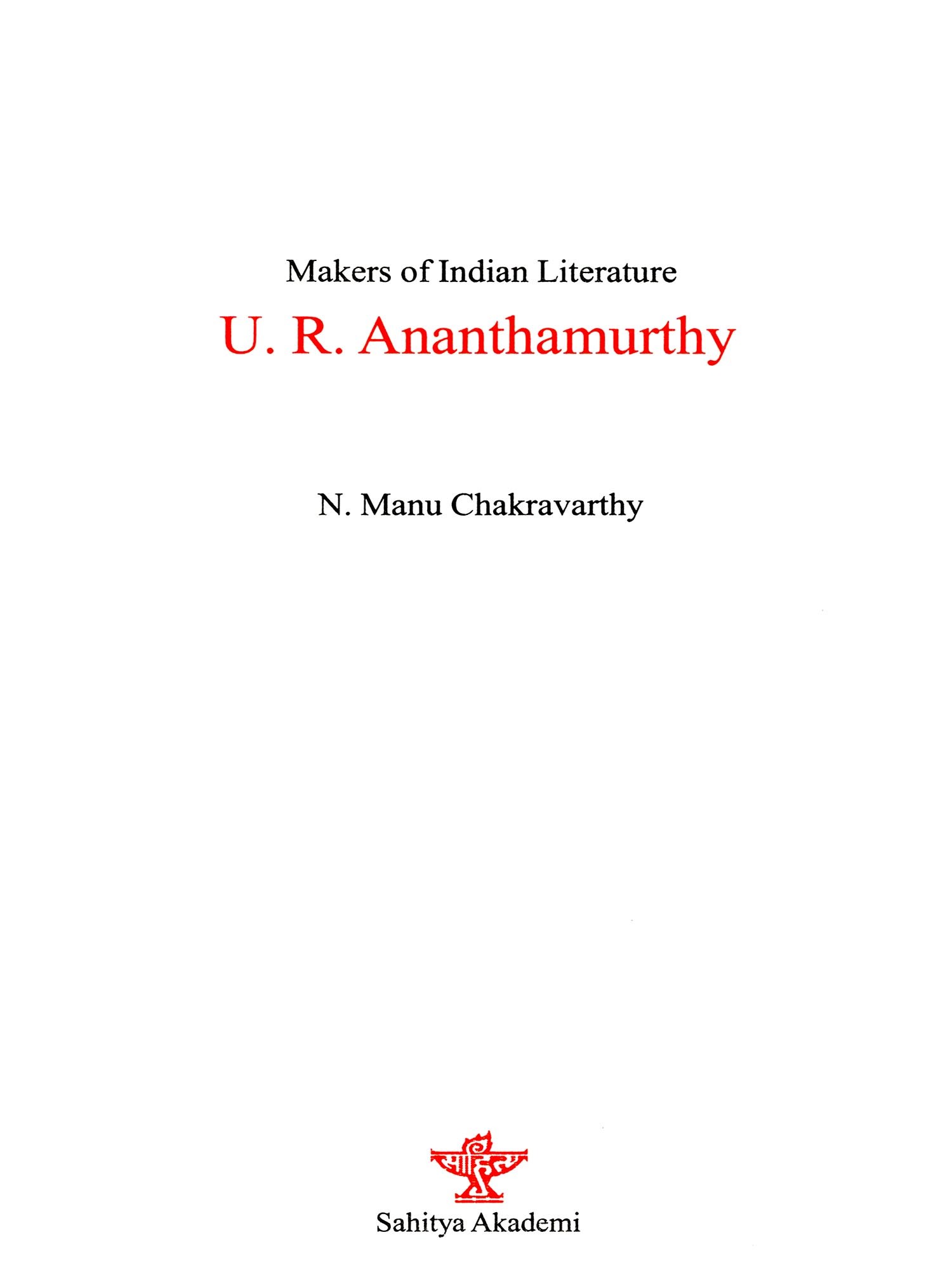 This short study of the works of U.R. Ananthamurthy, one of the significant writers of modern Indian literature, attempts to engage with the complex experiences that constitute the multiple layers of his creative and intellectual writings. Ananthamurthy emerged as a very important voice of the Kannada modernist phase, known as the "Navya", that initially seemed to subvert the idealism of the preceding period recognised as the "Renaissance movement", called "Navodaya". The Navya writers also contested the ideology of a group of writers who preceded them and were identified as "progressive", the "pragatisheela" writers.