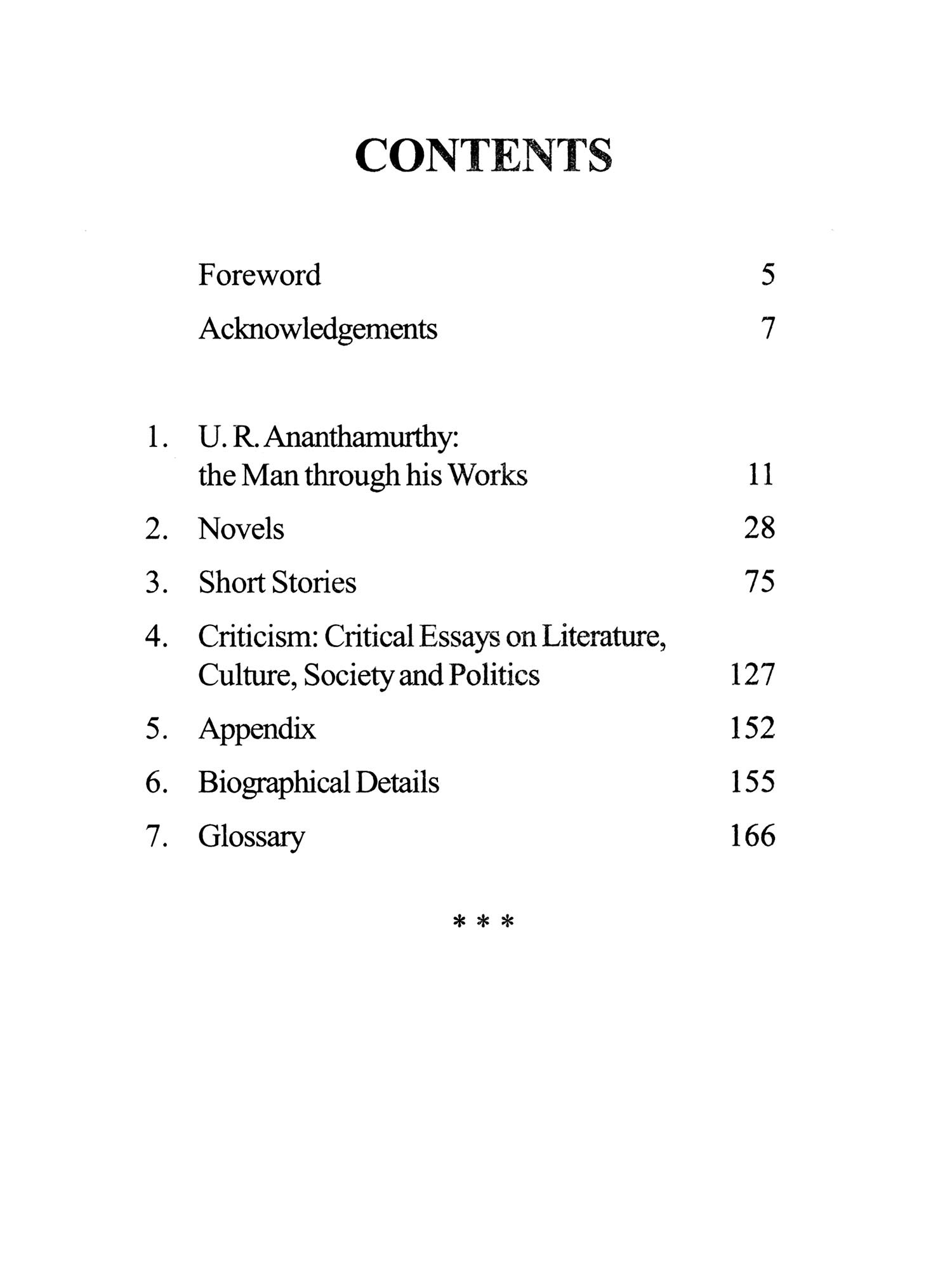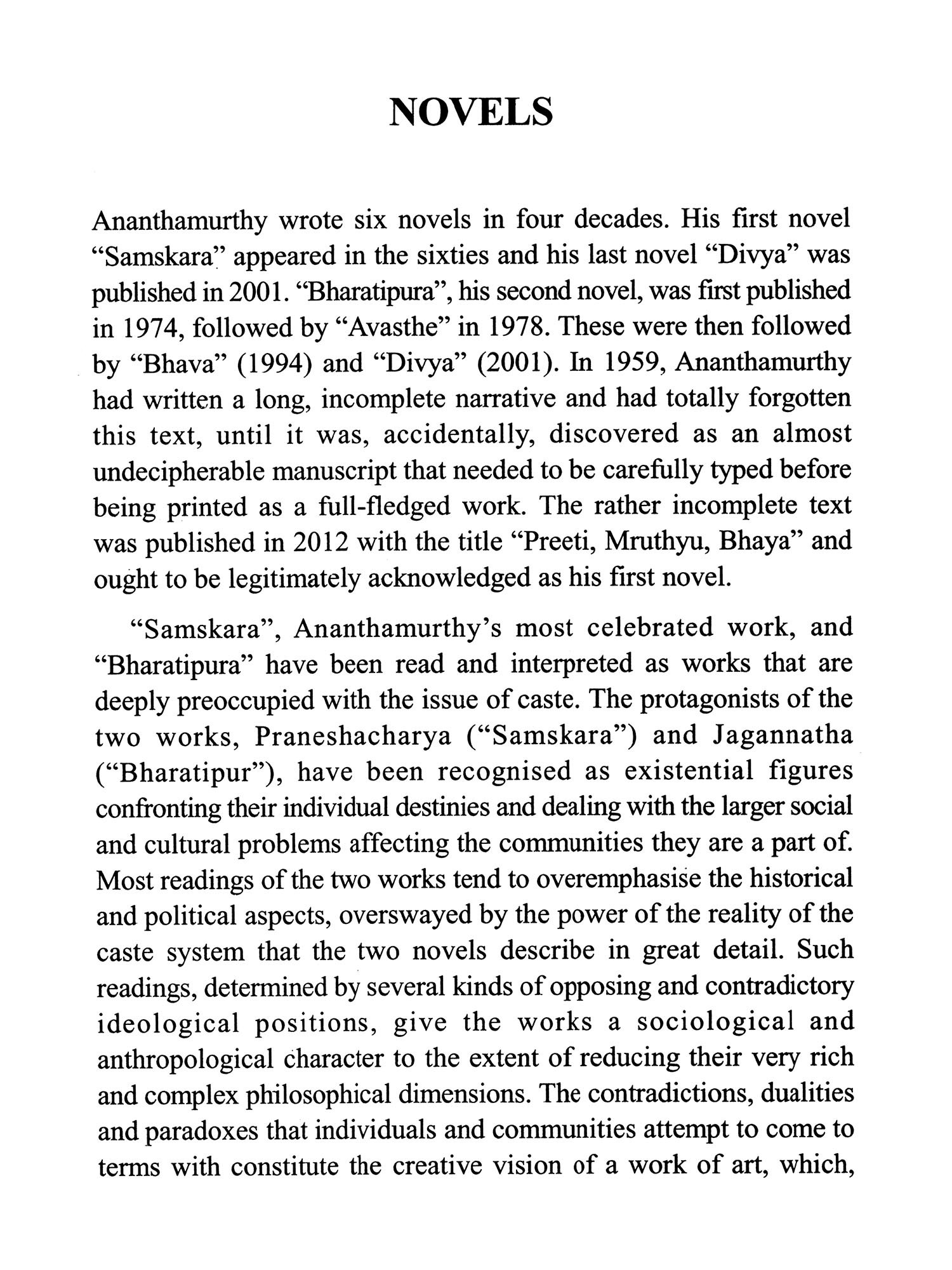 It would certainly require an exhaustive and full-length thesis to foreground the wide range of concerns that Ananthamurthy's works unfold before us. This book is only an introduction to the intricacies of his creative and intellectual explorations and is as exhaustive as possible given the framework within which it had to be written.