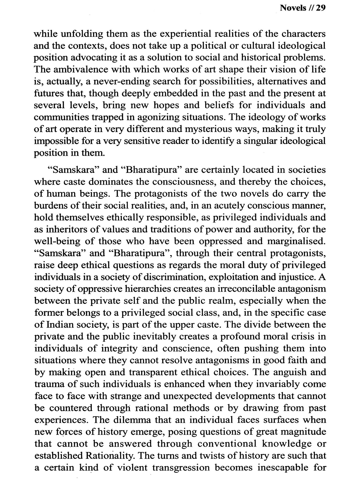 Ananthamurthy's inclusive analyses of various civilisational issues, especially in relation to the Indian caste system, were constantly misunderstood and misrepresented by activists and fellow writers who swore by their particular ideological stances and mistook his openness of understanding as a negative ambiguity that lacked conviction and commitment as far as fundamental principles of equality and justice were concerned. Consequently, Ananthamurthy was labelled in different ways, but the irony of it all was that each label was in contradiction with the other, thereby......king it impossible to locate him in any single ideological space.