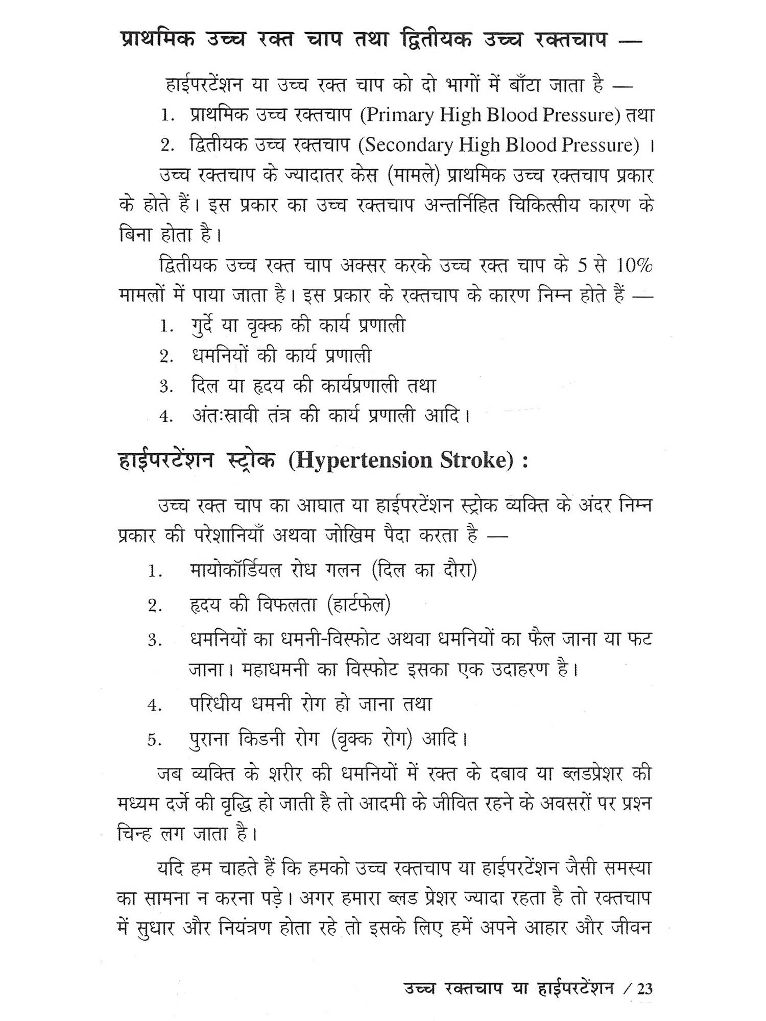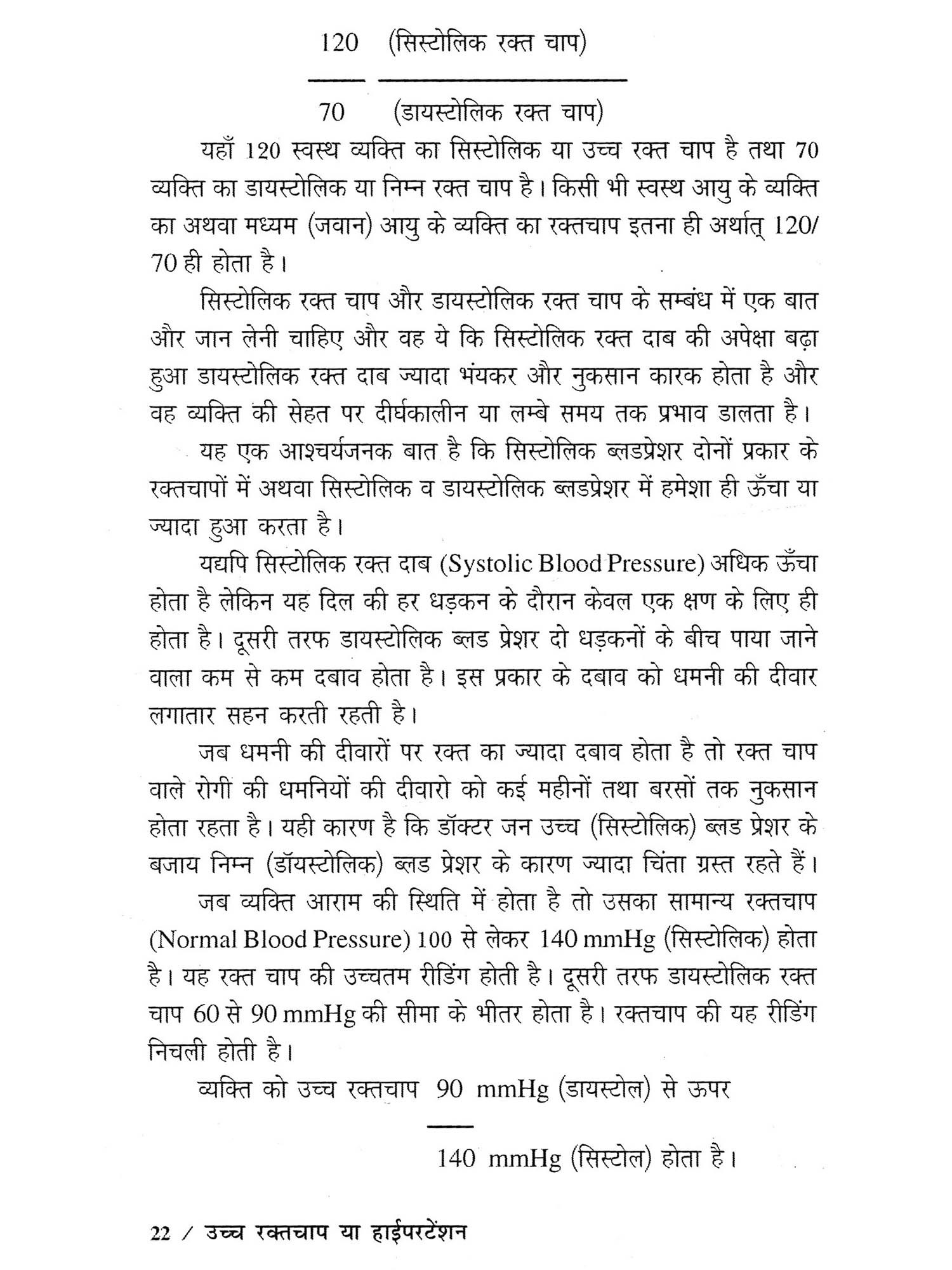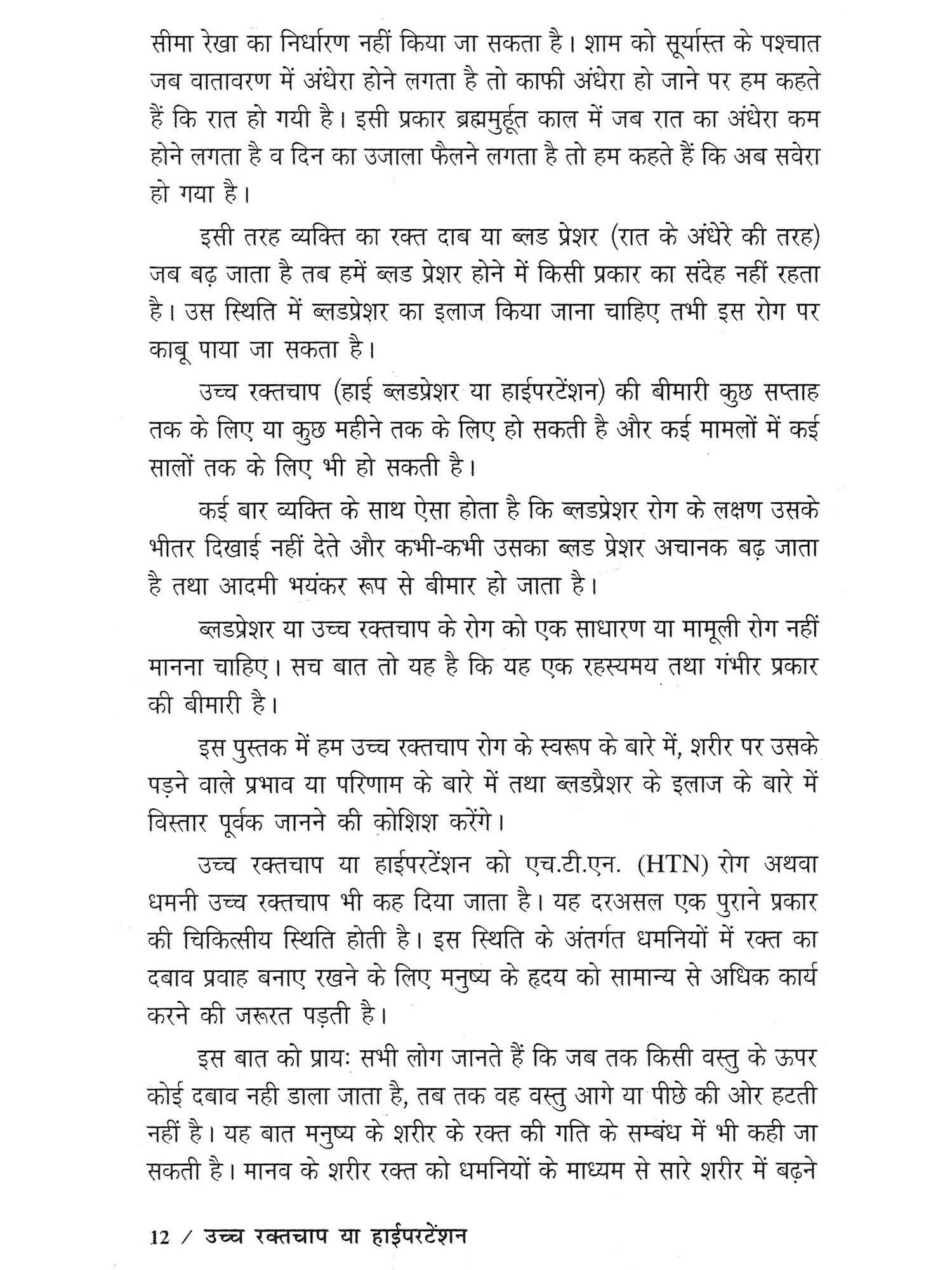 वर्तमान समय में दुनिया के लाखों करोड़ों लोग सैकड़ों प्रकार की बीमारियों से ग्रसित हैं। दुनिया में जितने लोग अनेक बीमारियों का कष्ट झेल रहे हैं, उच्च रक्तचाप या हाईपरटेंशन की बीमारी उन रोगों में सबसे ज्यादा इंसान को कष्ट दे रही है। ऐसा माना जाता है कि सारे संसार में 50% से भी ज्यादा लोग उच्च रक्तचाप की बीमारी से पीड़ित हैं। इनमें कई तो अपने रोग की स्थिति से अनजान भी हैं। जब तक हमें अपने रोग के बारे में पता न चलेगा, तब तक हम उसके इलाज के लिए अस्पताल या डॉक्टर के पास जाने के लिए भी प्रेरित नही होंगे। किसी भी रोग का पता तभी हम लगा सकते हैं, जब हमको उस रोग के लक्षणों के बारे में पता हो। इस पुस्तक में उच्च रक्तचाप रोग उत्पन्न होने पर व्यक्ति के अंदर दिखाई देने वाले या महसूस किए जाने वाले विभिन्न रोग लक्षणों के बारे में विस्तार से बताया गया है। इन रोग लक्षणों के प्रकट होने पर हम यह निश्चित कर सकते हैं कि उच्च रक्तचाप के हम शिकार हो चुके हैं तथा हमें डॉक्टर के पास जाकर अपना इलाज शुरू करवाना चाहिए। प्रस्तुत पुस्तक के प्रथम अध्याय में उच्च रक्तचाप या हाईपरटेंशन के बारे में सामान्य बातें बताई गयी हैं। दूसरा अध्याय उच्च रक्तचाप रोग के वर्गीकरण से सम्बंध रखता है। तीसरे अध्याय में रक्तचाप मापक यंत्रों के जरिए व्यक्ति के रक्तचाप को मापने की विधि समझाई गयी है। साथ ही विभिन्न रक्तचाप मापी यंत्रों के बारे में भी बताया गया है। इस पुस्तक का चौथा अध्याय रोग के विविध-कारणों से सम्बंधित है, जिनका पता होने पर हम यदि पहले से ही इन कारणों अथवा रोग के बीजों से अपना बचाव कर लें तो रोग के पैदा होने या रोग की गंभीर स्थिति आने से हम खुद को बचा सकते हैं। पुस्तक का पांचवाँ अध्याय रोग के लक्षणों की कहानी कहता है। उच्च रक्तचाप जब किसी व्यक्ति को अपना शिकार बनाता है तो उसके शरीर से, कार्य व्यवहार और आचरण से दुर्बलता के कई लक्षण प्रकट होने लगते हैं। इनमें से कुछ लक्षणों को देखकर हम कह सकते हैं कि इस व्यक्ति को उच्च रक्तचाप है अथवा इन लक्षणों की जानकारी होने पर तथा लक्षणों के प्रकट होने पर आदमी खुद भी समझ सकता है कि हाईपरटेंशन के रोग ने मुझको जकड़ लिया है। उच्च रक्तचाप व्यक्ति के शरीर और दिमाग पर किस प्रकार अपना प्रभाव डालता है तथा इससे और कौन-कौन से रोग तथा जटिलताएँ इंसान के अंदर पैदा हो जाती हैं- इस सबका वृतान्त पाठक गण इस पुस्तक के छंटवें अध्याय में पढ़ेंगें। इसके अलावा पुस्तक के सातवें अध्याय में रोग के निदान के तरीकों के बारे में समझाया गया है। उच्च रक्तचाप रोग के निदान में जिस प्रकार के टेस्ट या परीक्षणों को प्रयोग किया जाता है, वे सब इस अध्याय में समझाए गए हैं। पुस्तक का आठवाँ अध्याय उच्च रक्तचाप रोग की चिकित्सा अ