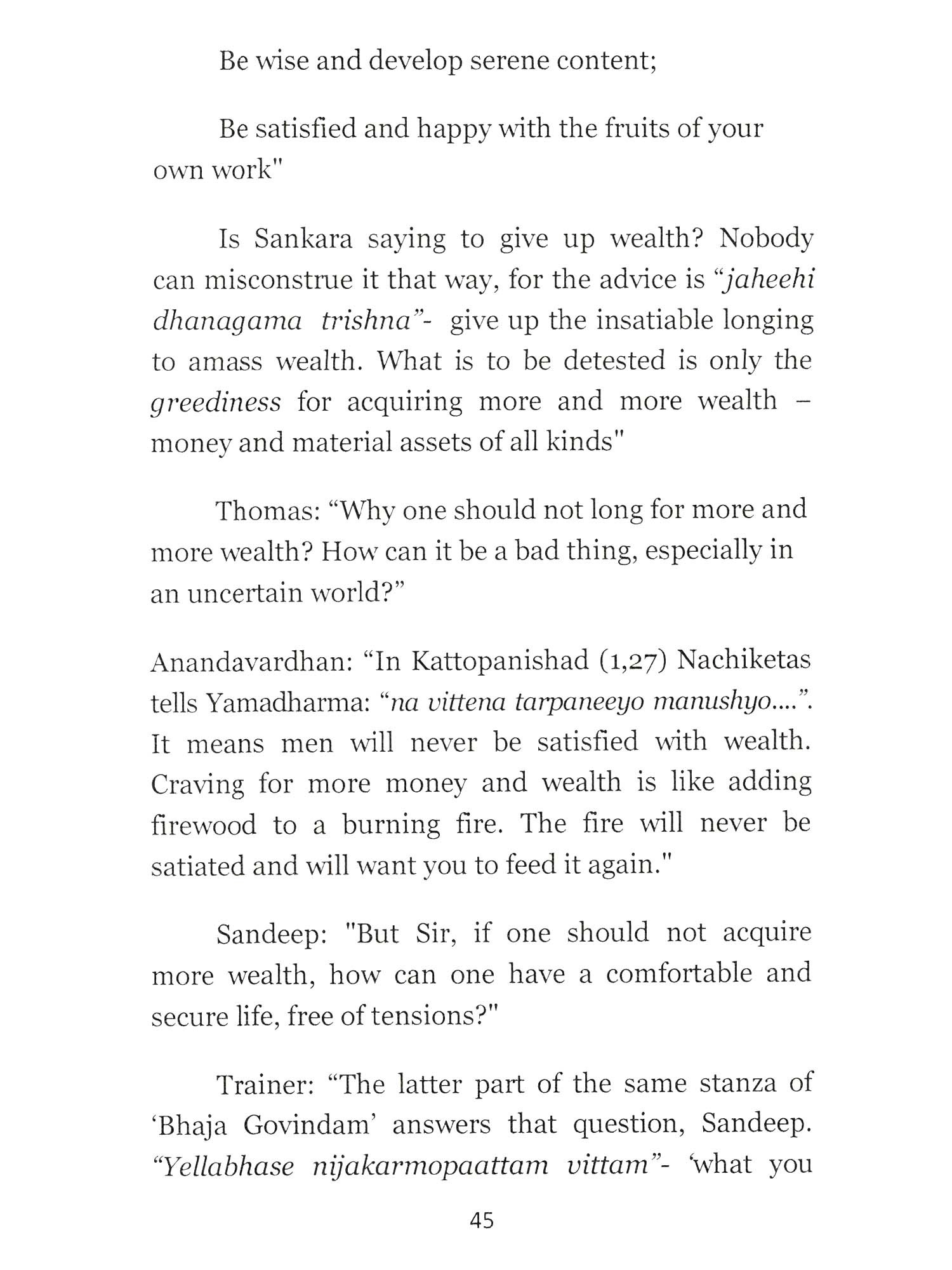 At the outset, let's understand that the theme of this book is not for the Hindus only. It holds a universal appeal, as it addresses everyone. The word "Govindam' stands for the Atman, which is the Truth behind the ever-changing flux of things that constitutes the universe of our experience. Govinda is the Brahman of the Upanishads and is the highest Reality. So, Bhaja Govindam means seek your identity with the creator, the Brahman, the Supreme. The text under review is an entry point into Vedanta, which also throws light on many teachings of the scriptures. In a highly simplified form, it distills the teachings of the fundamental texts of Vedanta, Bhagavad Gita, etc. Attempted here is a thorough study and understanding of the expositions on one of the most popular strotras composed by Sankara, which can remove all the delusions of the materialistic world. As C. Rajagopalachari said, "When intelligence matures and lodges securely in the heart, it becomes wisdom. When that wisdom is integrated with life and issues out in action, it becomes devotion. The knowledge that has become mature is devotion. If it does not transform into devotion, such knowledge is useless tinsel.