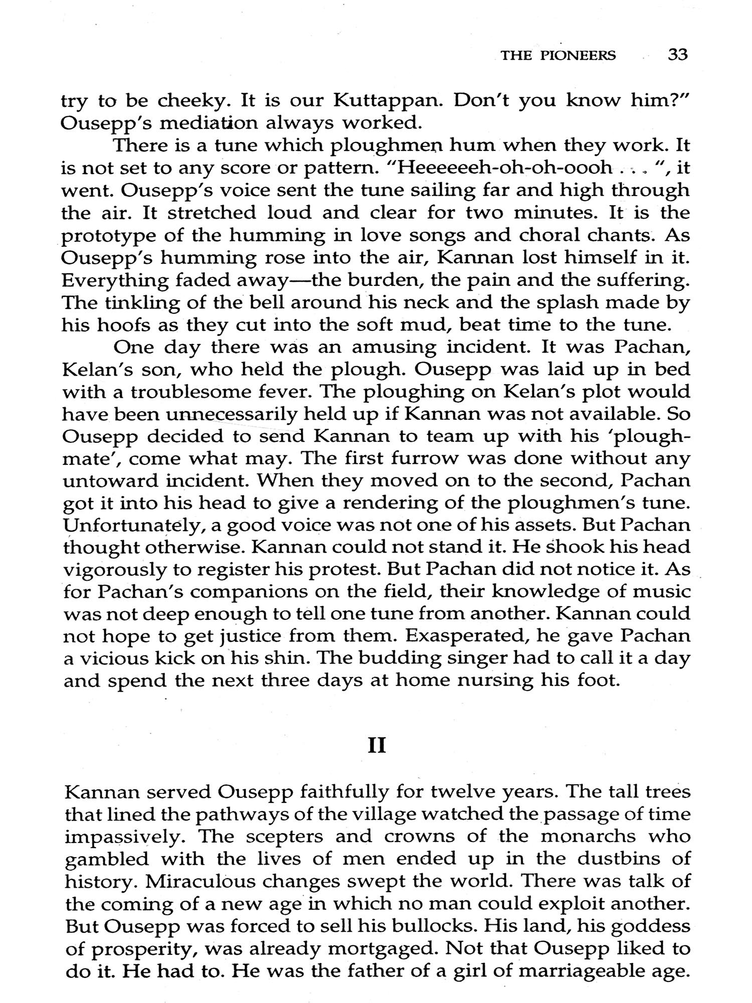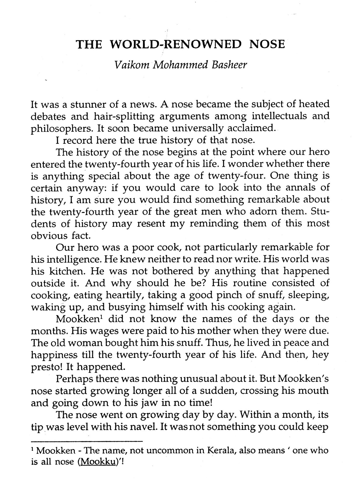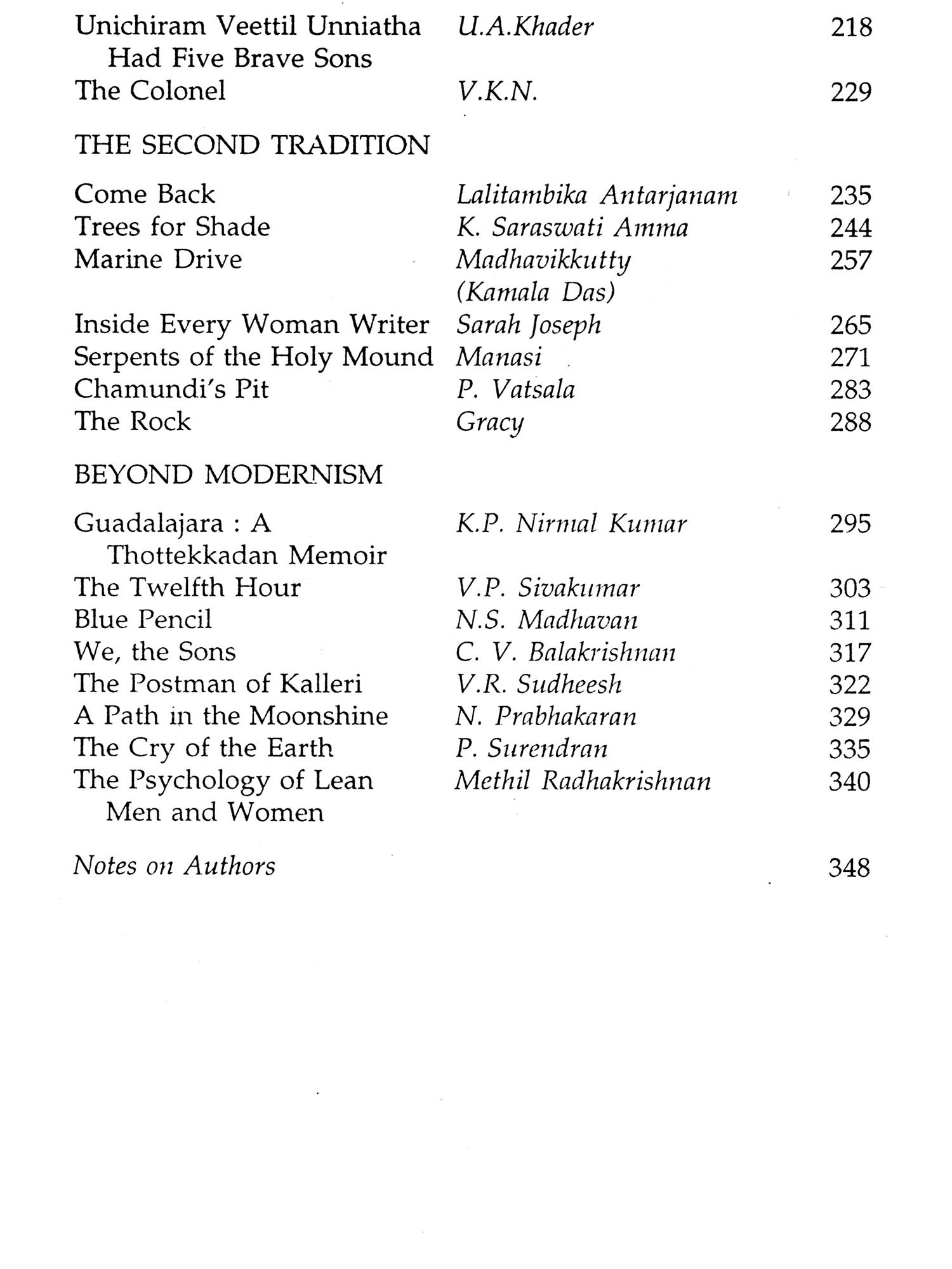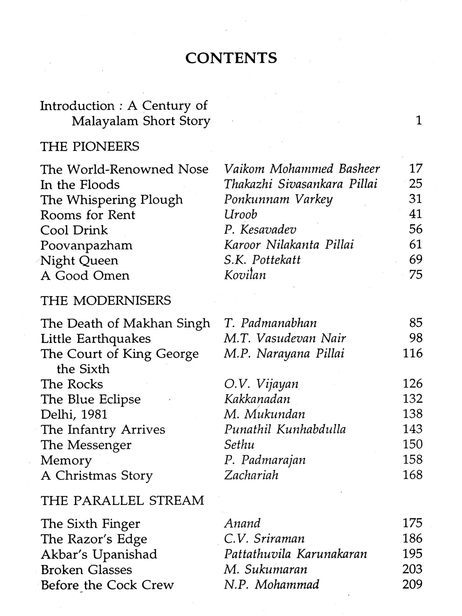 The Malayalam short story celebrated its centenary in 1991. During these hundred years of its dynamic and even turbulent existence, it has passed through several phases in terms of theme and idiom, structure and ideology; a history in which periods of gradual evolution alternate with periods of rupture, and syntheses are preceded by major aesthetic shifts and philosophic revolts.