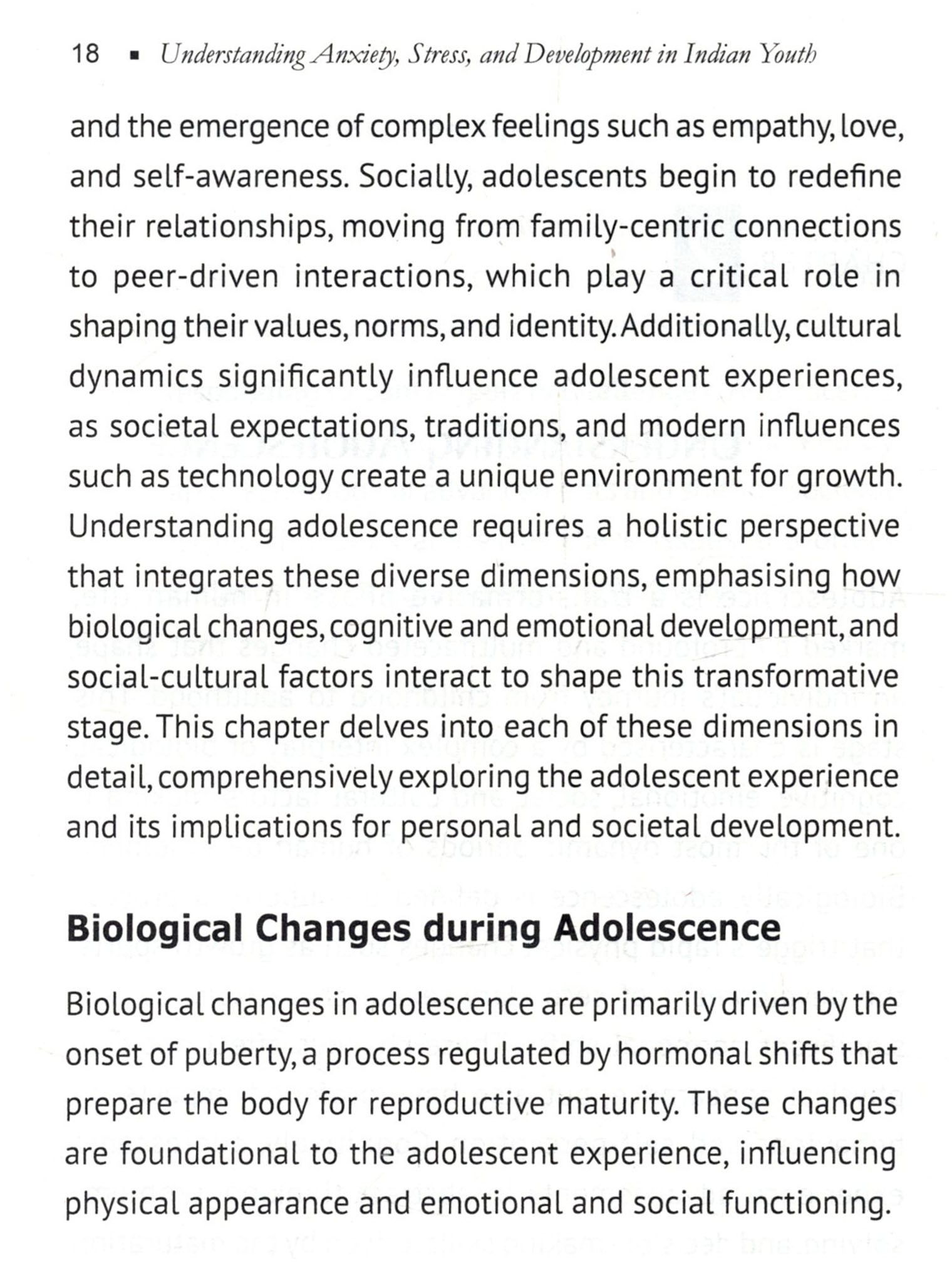 Understanding Anxiety, Stress, and Development in Indian Youth explores the multifaceted challenges faced by young people in India, with a special focus on the state of Tripura. The rising prevalence of anxiety and stress among Indian adolescents has become a critical concern. With academic pressure, social expectations, and rapid technological change, today's youth must navigate a delicate balance. This book examines the root causes of these challenges and the mental health issues that arise from them. Drawing on secondary data, existing research, and case studies, it offers a comprehensive overview of the adolescent experience in India. Structured for academicians, policy makers, mental health professionals, and parents, it covers key aspects of adolescence-including physical and cognitive development, emotional and social struggles, and the impact of modern influences such as social media. It provides practical insights into how various stakeholders can support adolescents in overcoming their unique difficulties while fostering resilience and well-being. By amplifying the voices and experiences of Indian youth, particularly from the lesser-studied region of Tripura, this book aims to contribute meaningfully to ongoing efforts toward their holistic development.