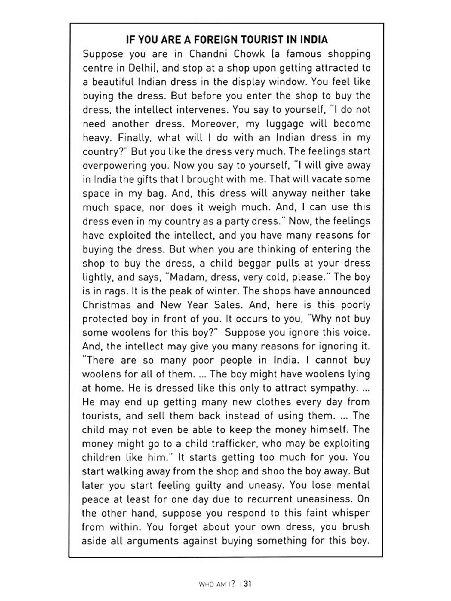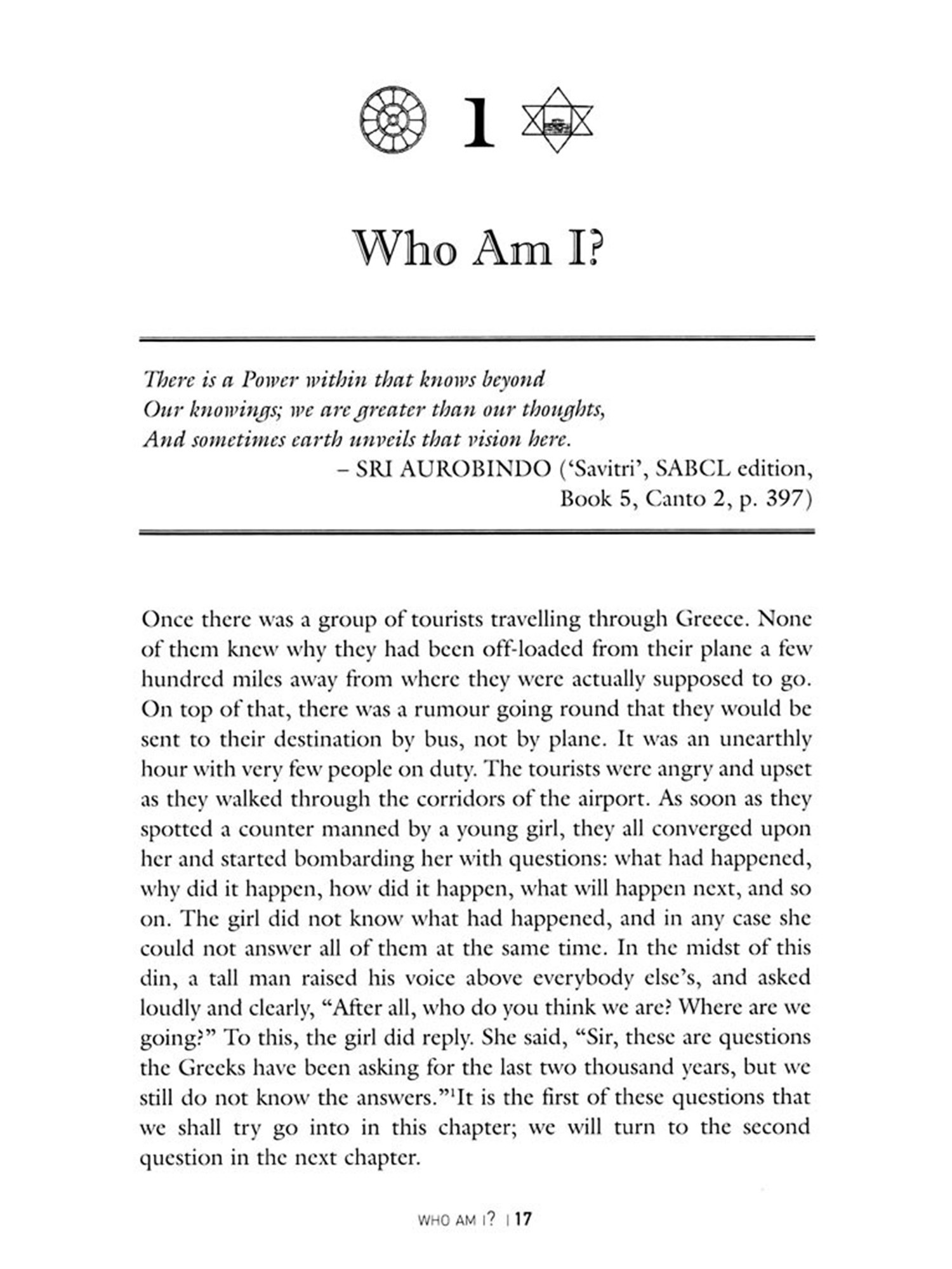 In the first chapter on Who Am I? the author outlines the multidimensional beings we are: a living body, a mind with feelings and thinking, and a soul and psychic being. Our psychic being is "an infallible guide" to right and wrong in every situation. Heeding that "still small voice" can put us on the right path. These dimensions of the person are explained in accessible language, telling examples and transformative stories.