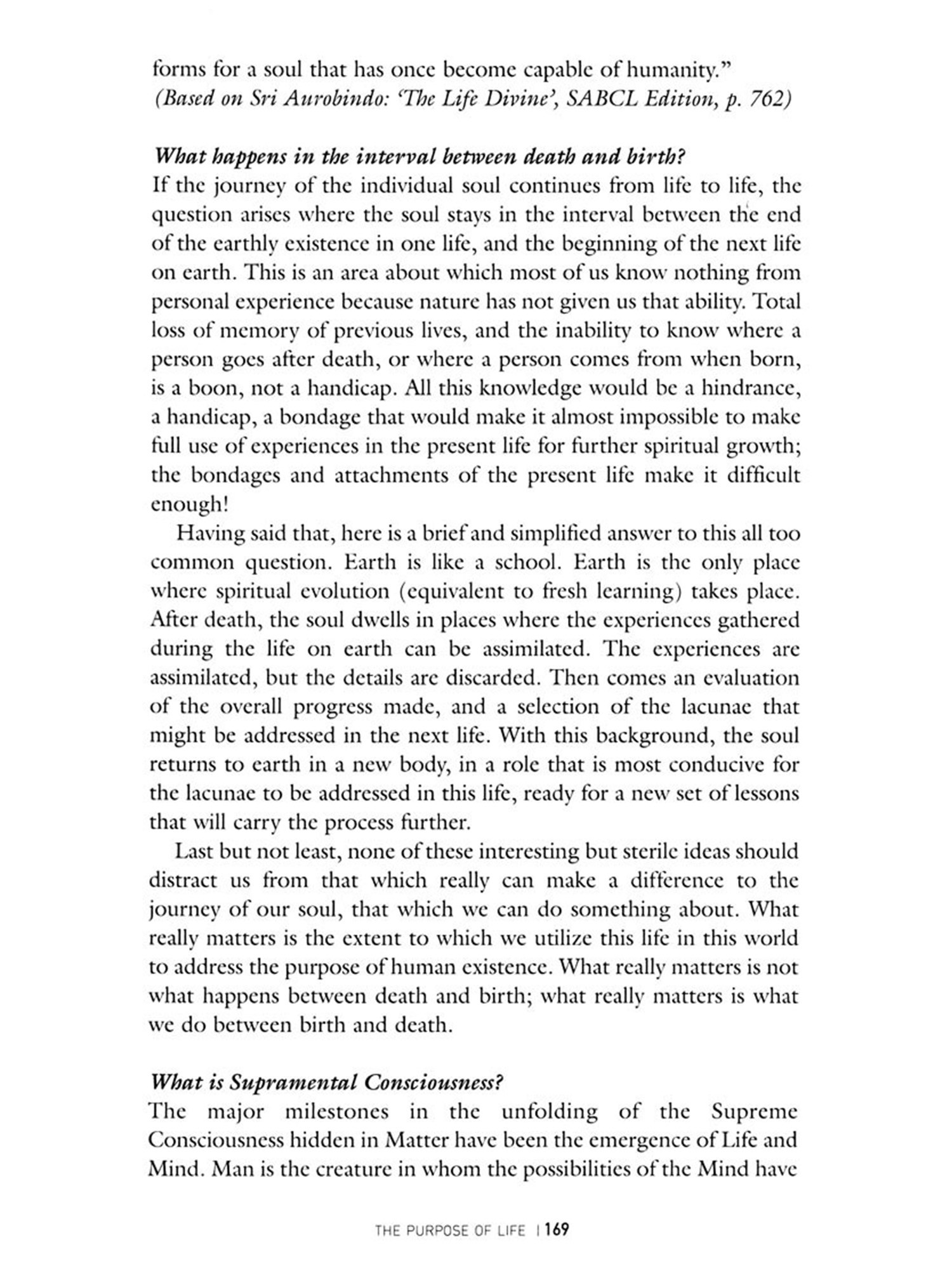 The next chapter on The Purpose of Life opens with the author distinguishing mental consciousness from mystic consciousness. While mental consciousness is consciousness of the sensory world, mystic consciousness sees a deeper or divine dimension that is present within, behind, and beyond all created things. If we heed the "voice of the soul" or "psychic being" then we begin to develop a consciousness that is rooted in the Divine. As we develop this deeper consciousness it brings joy, mental and physical well-being, and a sense of fulfillment. And in Sri Aurobindo's teaching this "approaching mystic consciousness or spiritual growth is the purpose of life." The author asserts that spirituality "enriches, enhances and ennobles worldly life. It brings joy, peace, and fulfillment to individuals as well as makes the world a better place..."