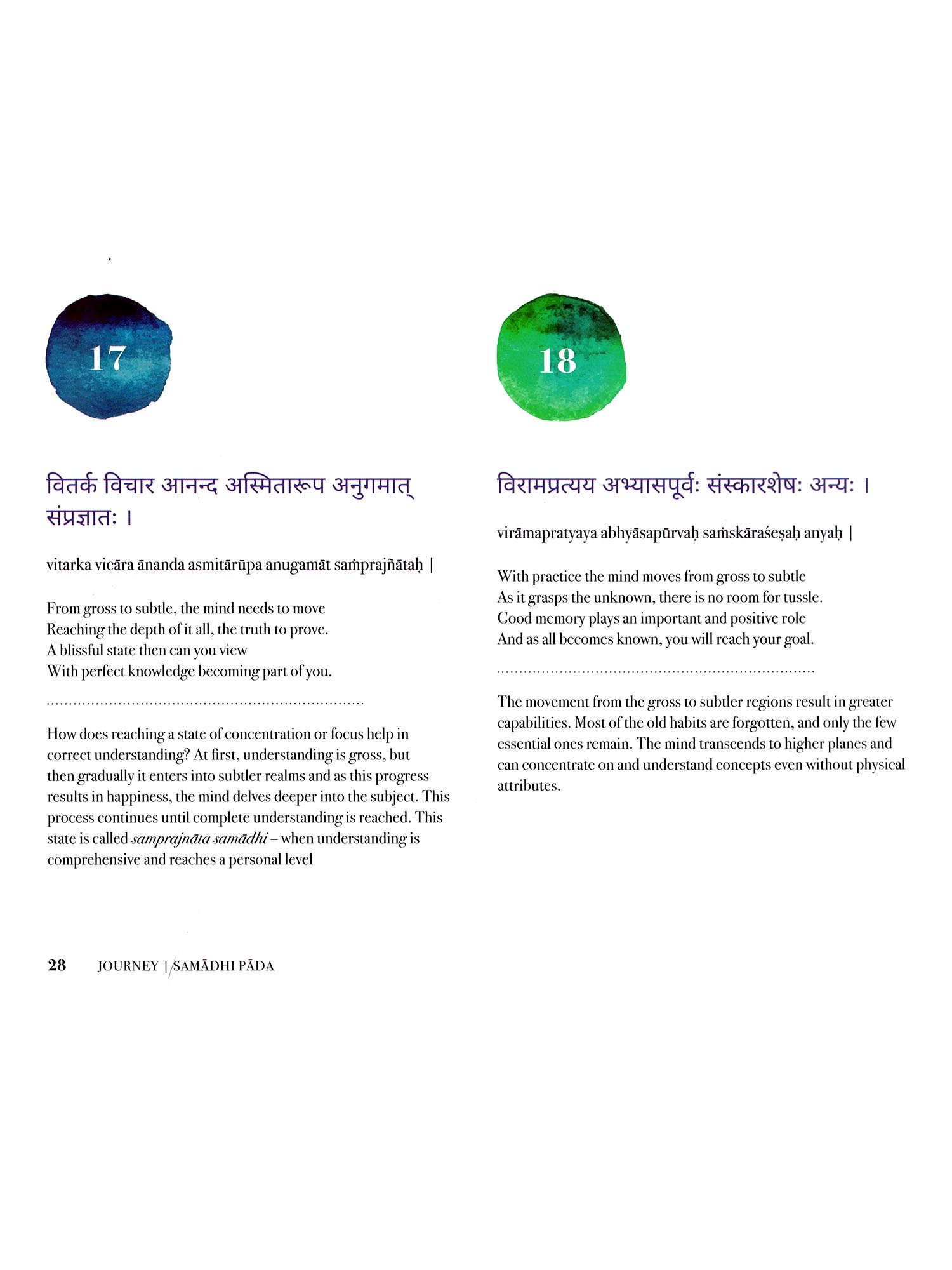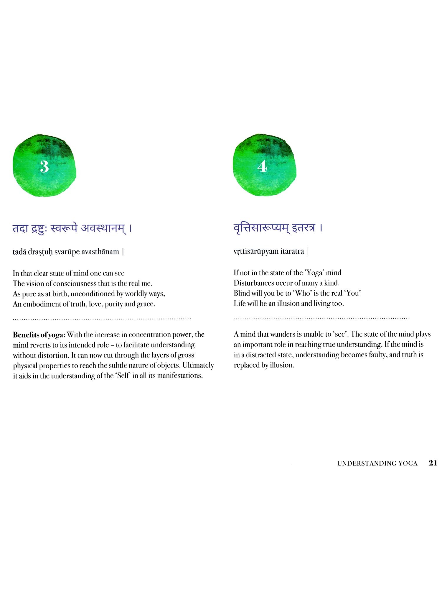The satras are steeped in wisdom and give meaningful direction. Having studied them, one realizes how essential a basic understanding of the Yogashtra is to bringing body, senses and mind under control, enabling us to live life in harmony with ourselves and all around us. The stitras are an amazing study of the mind and its workings, and detail how one can use the intellect to achieve one's goals, and in the context of yoga this is, overriding everything else, how one can achieve freedom from the burdens of life.