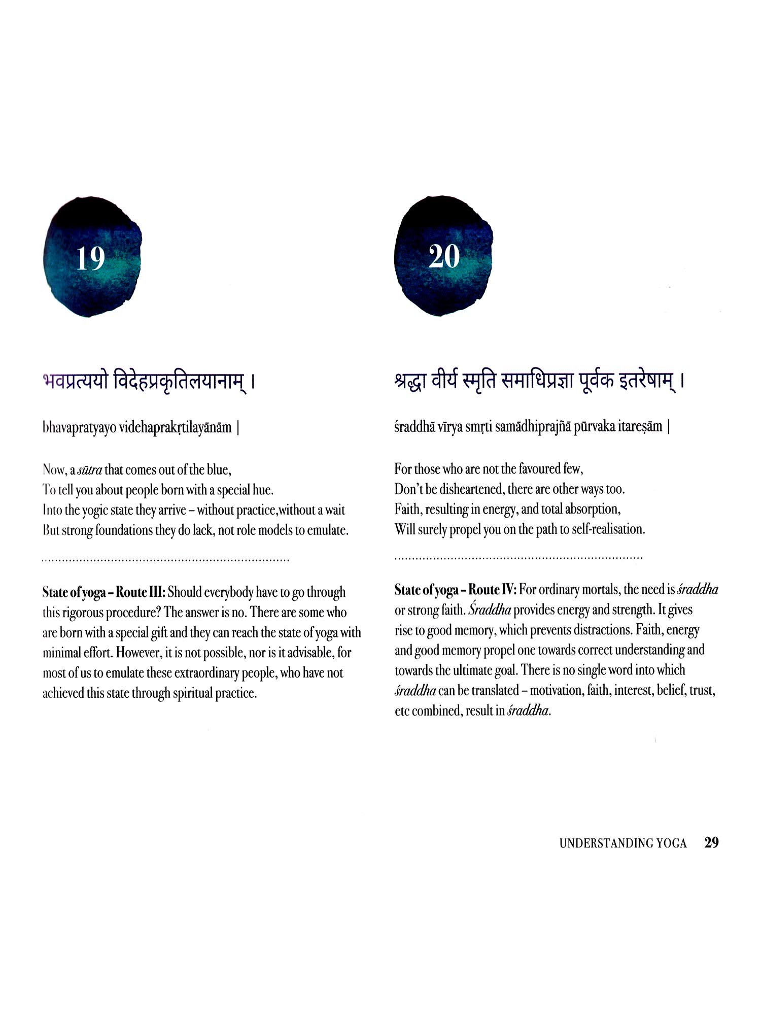 These verses came from the heart; they came from an understanding of the sutras as taught to me with rare lucidity by my teacher. Having understood and discovered the wisdom of the sutra-s. I felt a deep urge to share the knowledge of this very profound and practical teaching. The following book is therefore an expression of my understanding of the teacher's lessons and comes from a strong desire to make enthusiasts the world over, of those, who have taken to yoga in its current wave of popularity without perhaps realizing how much more there is to this science than mere physical exercise; if some of these people could perhaps take to reading the sutras, then my purpose will have been achieved and with this aim in mind the verses have been expressed in the simplest words in a lyrical manner. However many concepts of the satras are deep and require reflection. To read the verses aloud right through the chapter, experiencing the rhythm and then study the verse and the lesson, would perhaps bring out the best understanding and appreciation of this work.