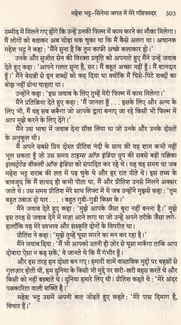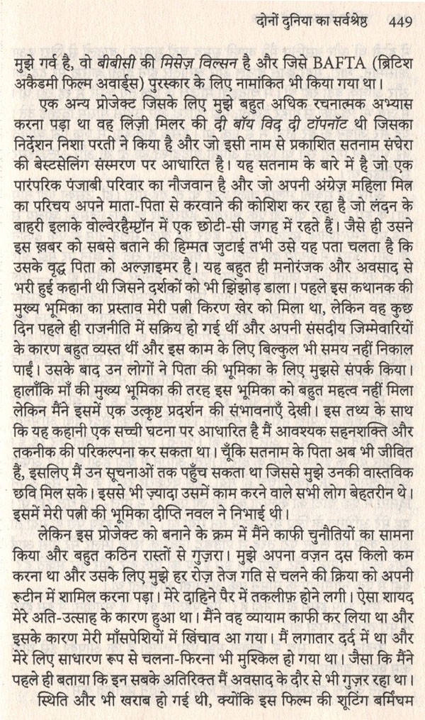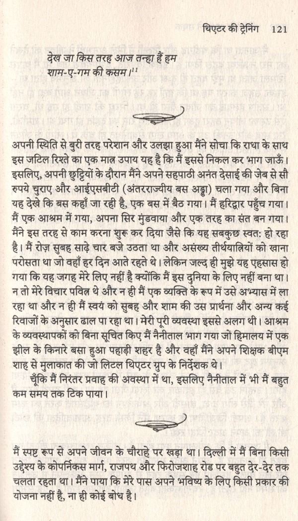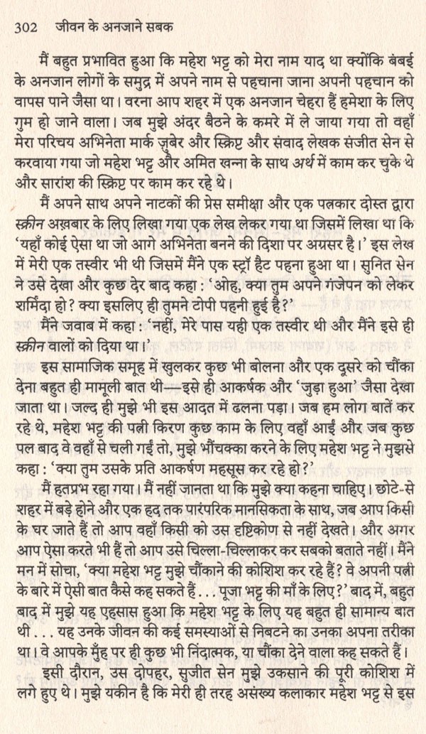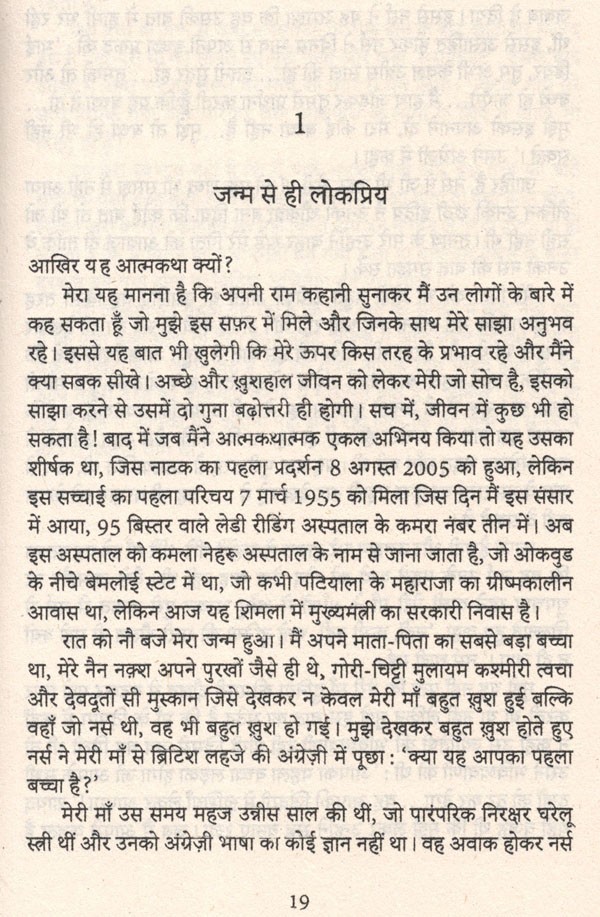 अपनी आत्मकथा लिखने की शुरुआत मैंने दस साल की उम्र में ही कर दी थी यह मेरे अभिनेता, फिल्म स्टार और पुरस्कार विजेता कलाकार बनने से बहुत पहले की बात है। मैं अवचेतन में अपने परिवार, अपने बचपन के दिनों और बाद के दिनों में दूसरे अदाकारों और निर्देशकों के साथ अपने मेलजोल की यादें अनुभवों से सराबोर होकर संजोता रहा। मैं जीने के जोखिमों को उठाता आगे बढ़ता रहा - अभिनय की बीहड़ ज़िंदगी में कभी ऊपर तो कभी नीचे जो आनंद और रचनात्मकता से भरपूर थी। चूँकि मैंने ज़िंदगी इतनी संपूर्णता में जी है कि मेरी स्मृति में अधिकतर घटनाएँ तस्वीर जैसी हैं- मुझे छोटी बड़ी सभी तरह की घटनाएँ, मुलाकातें, दृश्य, ध्वनियाँ और गंध याद आने लगती हैं। यह एक जादू ही है कि मेरी आत्मकथा अब व्यवस्थित तरीके से मुखर हो उठी है, इसमें उन लोगों के ऊपर रोशनी है जिन्होंने मेरे जीवन को प्रभावित किया और जिनके हाथ में मेरे वजूद का एक सिरा भी है- एक धड़कता हुआ सिरा जो आज भी मुझे उससे जोड़े हुए है जो तब का है जब मैं दस साल का था। कोलम्बिया के महान लेखक गाब्रियल गार्सिया मार्खेज़ ने अपनी आत्मकथा लिविंग टु टेल द टेल में इस बात को बहुत अच्छी तरह लिखा है कि 'ज़िंदगी वह नहीं होती है जो हम जीते हैं, बल्कि वह जो हम याद करते हैं और उसको जिस तरह से याद करते हैं।'