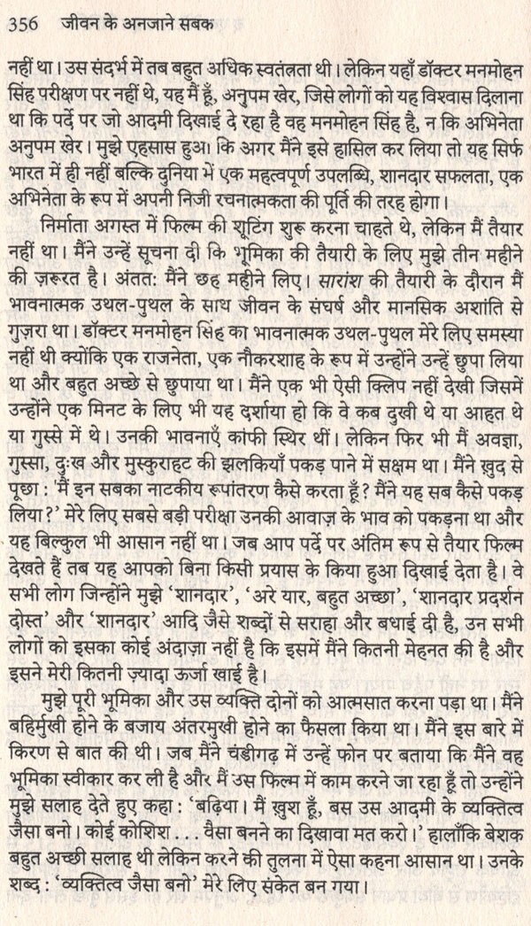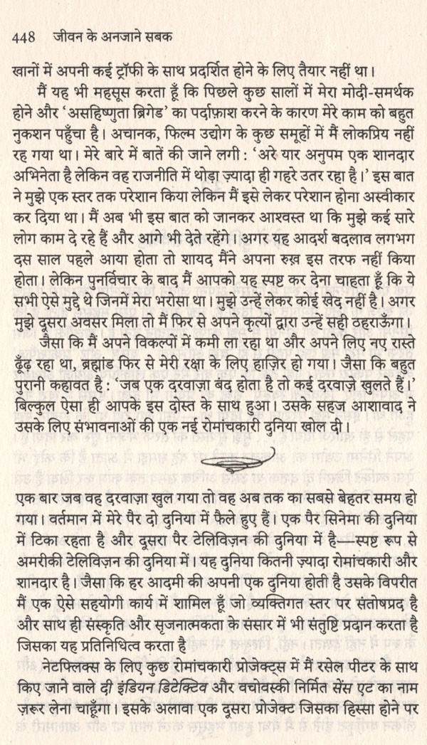 यह मेरी यात्रा का अंत नहीं है। अभी बहुत से मुकाम हासिल करने हैं! और वह भी इसी जीवन में। संभावनाएँ असीम हैं और मेरे भविष्य की पटकथा अभी तक लिखी नहीं गई है। मेरी ज़िंदगी बँधी हुई नहीं है, न ही यह सीमित है और न परिभाषित। एक लाजवाब, रोचक और बेबाक जीवनी जिसमें कई अनसुनी कहानियाँ, उदाहरण और सबक छुपे हैं। अनुपम खेर अपनी ऐसी आत्मकथा के हीरो हैं जिसमें नाटक, कॉमेडी, रोमांस और एक्शन सबकुछ है! किसे पता था कि शिमला जैसे छोटे शहर का एक लड़का किसी दिन दुनिया के सबसे प्रसिद्ध अभिनेताओं में गिना जाएगा जिसे कई राष्ट्रीय-अंतरराष्ट्रीय पुरस्कार मिलेंगे ! पाँच सौ से अधिक फिल्मों की वो अनवरत यात्रा अब भी जारी है और अनुपम खेर को सिर्फ उनके ख़ास 'बॉल्ड लुक' के लिए नहीं जाना जाता, बल्कि उन्हें अपने बेलौस और बेखौफ़ विचारों के लिए भी जाना जाता है, भले ही वे कितने ही विवादास्पद क्यों न हों। वे हमेशा से लीक से हटकर रहे हैं और उनकी आत्मकथा भी वैसी ही है। इसमें जीवन के अविश्वसनीय सबक भरे पड़े हैं जिससे हर भावी कलाकार और एक आम आदमी अपना अक्स देखेगा। यह एक सच्चे, ज़हीन और सदाबहार कलाकार के जीवन की पल-पल बदलने वाली कहानी है।