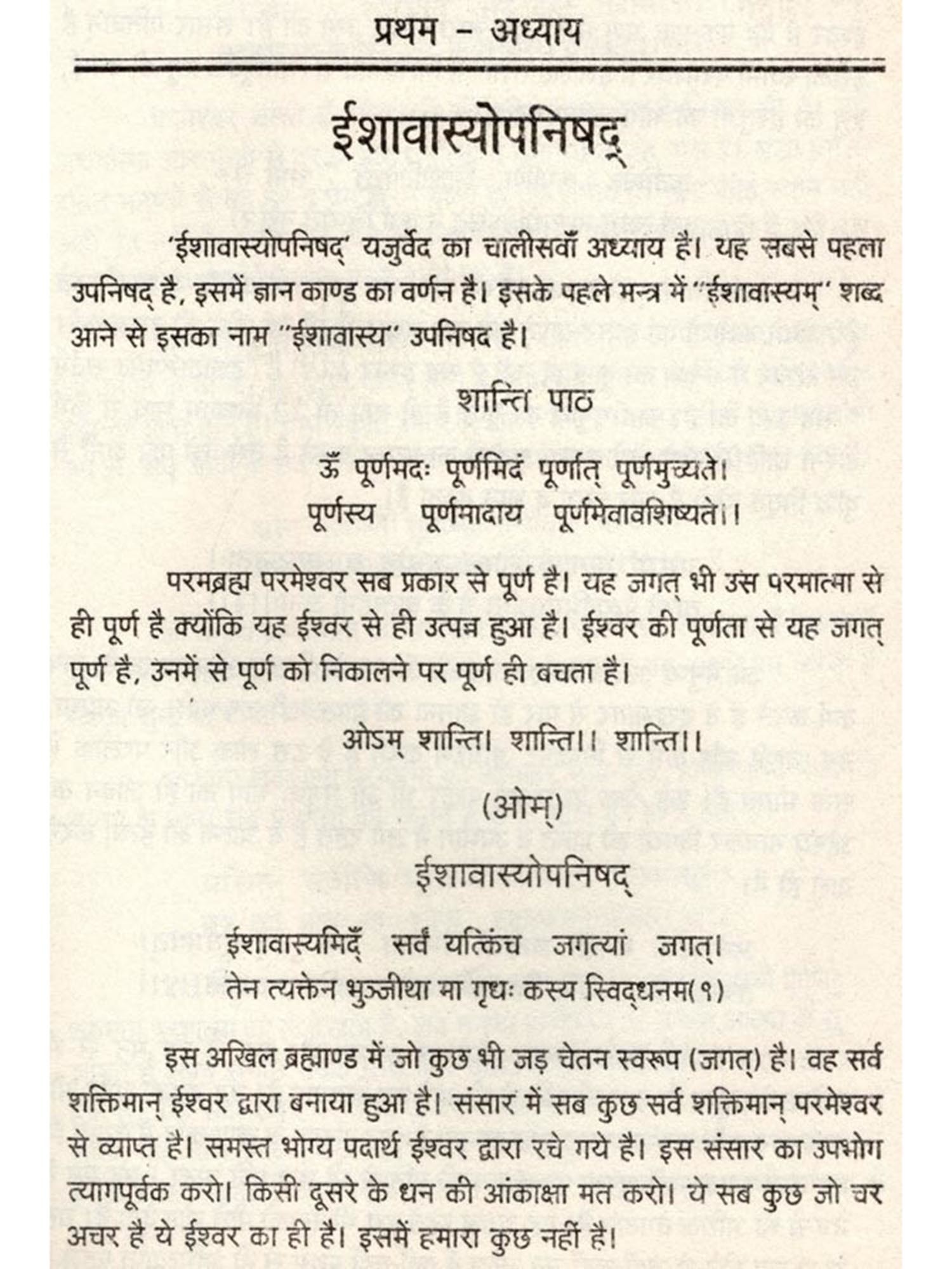 इस नश्वर संसार से पार होने का एक ही मार्ग है, वह है तम से परे उस महान् आदित्यज्योति का ज्ञान। परमात्मा का वह ज्ञान वेदों में निहित है। ईश्वर ने संसार को वेद और उपनिषदों का महान ज्ञान दिया है। आध्यात्मिक ऋषियों का निर्मल जीवन हमें बहुत कुछ प्रदान करता है। ईशावस्योंपनिषद्" यजुर्वेद का चालीसवाँ अध्याय है। उसका प्रथम मन्त्र सृष्टि के महान् रहस्य को उदघोषित करता है।