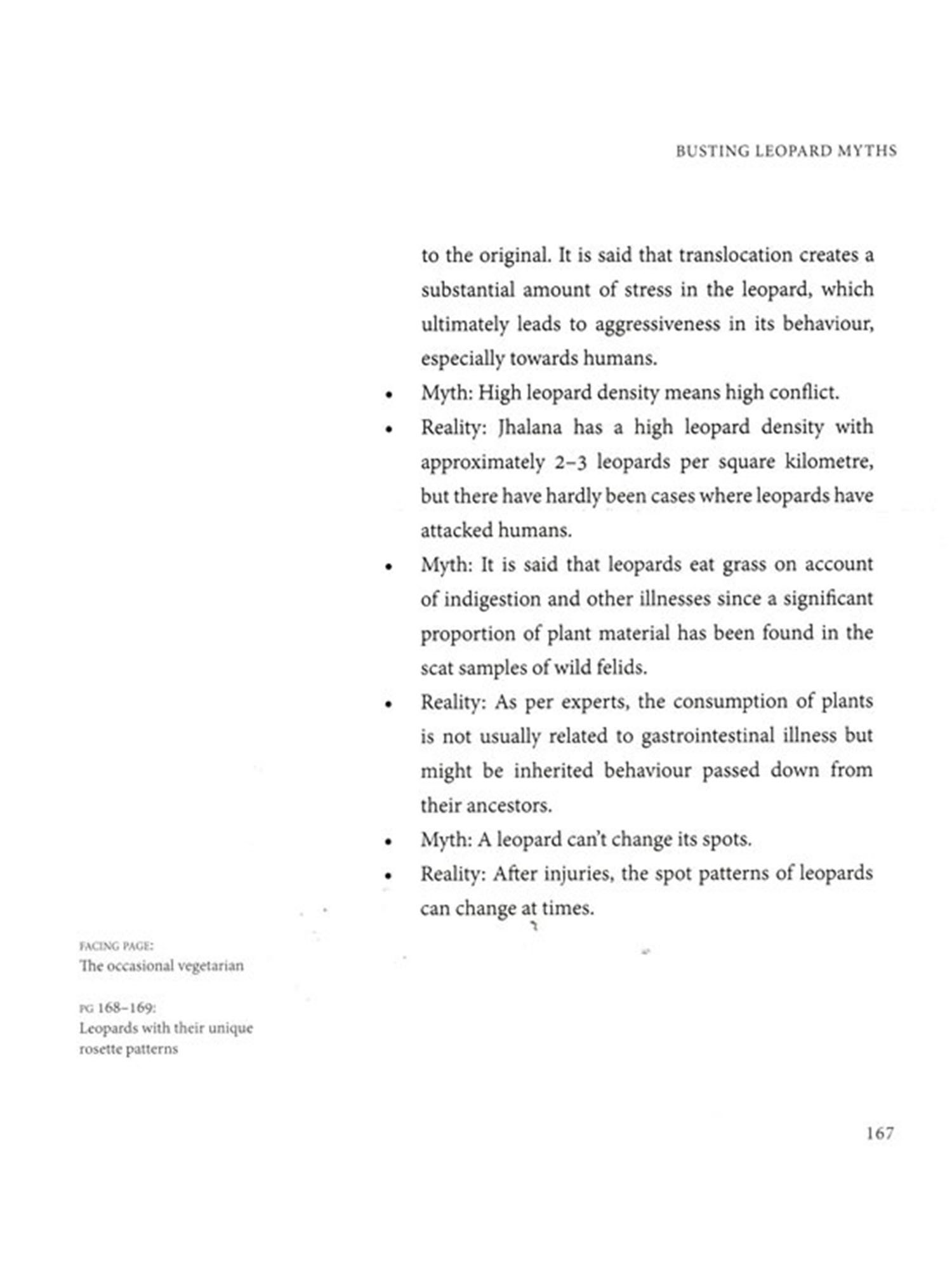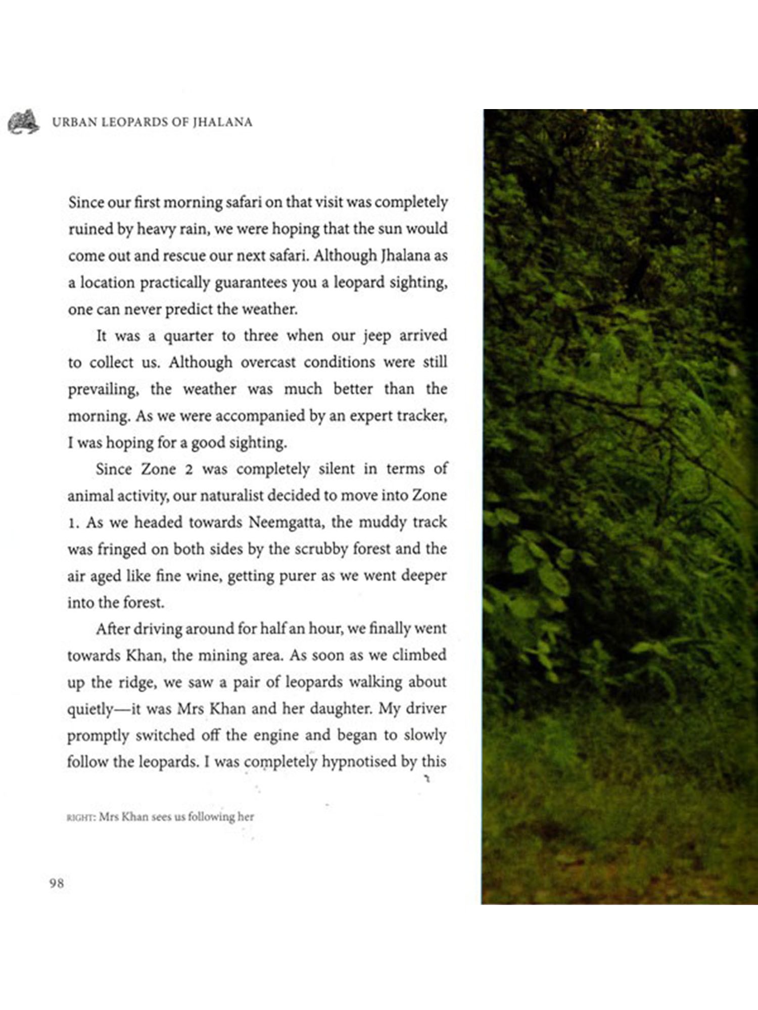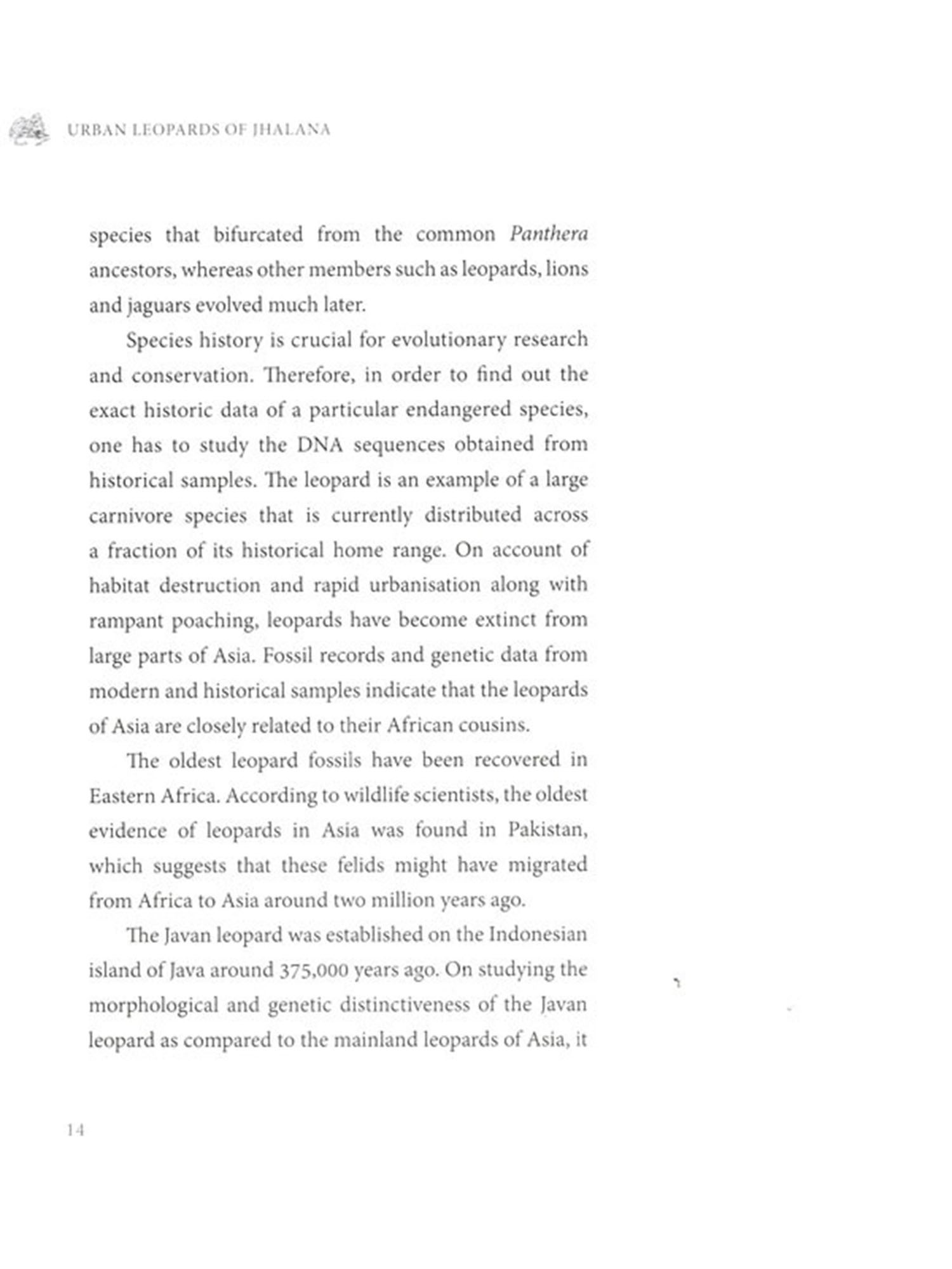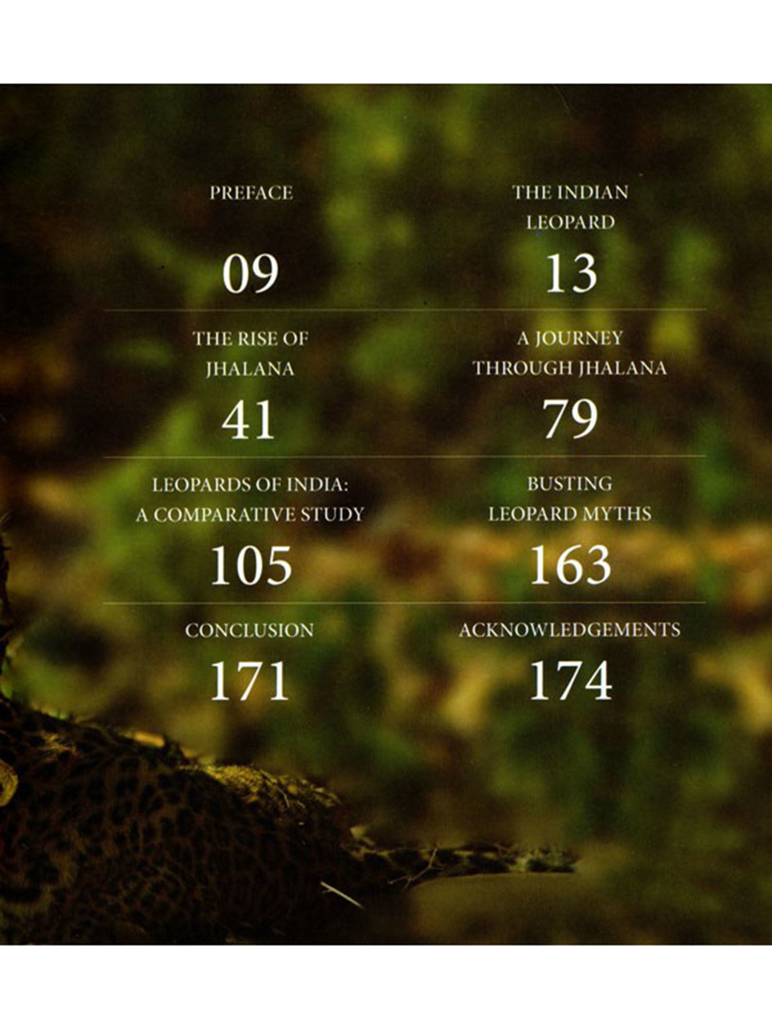 Tam highly thankful to my parents for providing financial support for my I wildlife explorations and encouraging me to follow my passion in this field. I am grateful to my faculty, Dr Erach Bharucha and Dr Shamita Kumar, for the institutional opportunities. I also want to express my endless gratitude to my guide, Dr Kranti Yardi. I would like to especially thank Dr M. Kamalakannan (Sr. Zoological Assistant, Mammal and Osteology section) and the Zoological Survey of India (Kolkata) for helping me with my research analysis. Thank you, Dr G.V. Reddy and the Rajasthan Forest Department for giving me the opportunity to carry out my field work in Jhalana. I am eternally indebted to Mr Sumit Juneja, the experienced leopard tracker who guided me through the whole process and my naturalist, Mr Mahendra, for his hard work and dedication. I will always be grateful to Mr Gurinderjeet Singh, my safari mentor in Rajaji, for persuading me to explore an uncharted part of Rajaji. He is not only a champion tracker but also a gem of a person. Last but not the least, I would like to thank Niyogi Books for believing in my work and encouraging me to get it published through their esteemed platform.