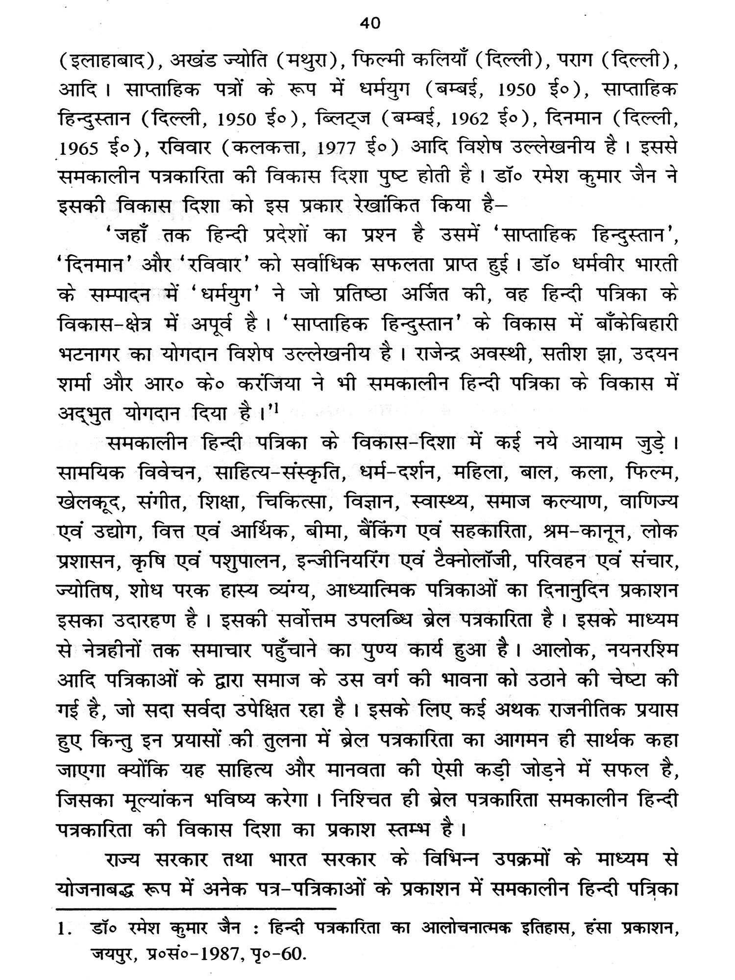 चतुर्थ अध्याय में 'पत्रकारिता के विविध रूप' का अध्ययन दो भागों में विभक्त किया गया है। प्रकाशन की दृष्टि से दैनिक, साप्ताहिक, पाक्षिक, मासिक, वार्षिक पत्रिकाओं का व्योरा देते हुए उसके मूल्यांकन की भूमिका प्रस्तुत की गई है। विषयवस्तु की दृष्टि से पत्रकारिता के अनेक रूप हो सकते थे, किन्तु इन्हें दस भागों में विभक्त किया गया है। अन्य रूपों को इन्हीं विभाजनों में समाहित करने का विनम्र प्रयास है। ब्रेल पत्रकारिता समकालीन पत्रकारिता की अन्यतम उपलब्धि होने के कारण महत्त्वपूर्ण है। इसलिए इससे संबंधित जो भी सामग्री मिल सकी उसकी परिचर्चा मैंने परिचयात्मक रूप में कर दी है। इस अध्याय तक आते-आते परिदृश्य स्पष्ट हो गया है। आगे के सभी अध्यायों में इसका विनिमेय पक्ष मूल्यांकन के साथ उपलब्ध है।