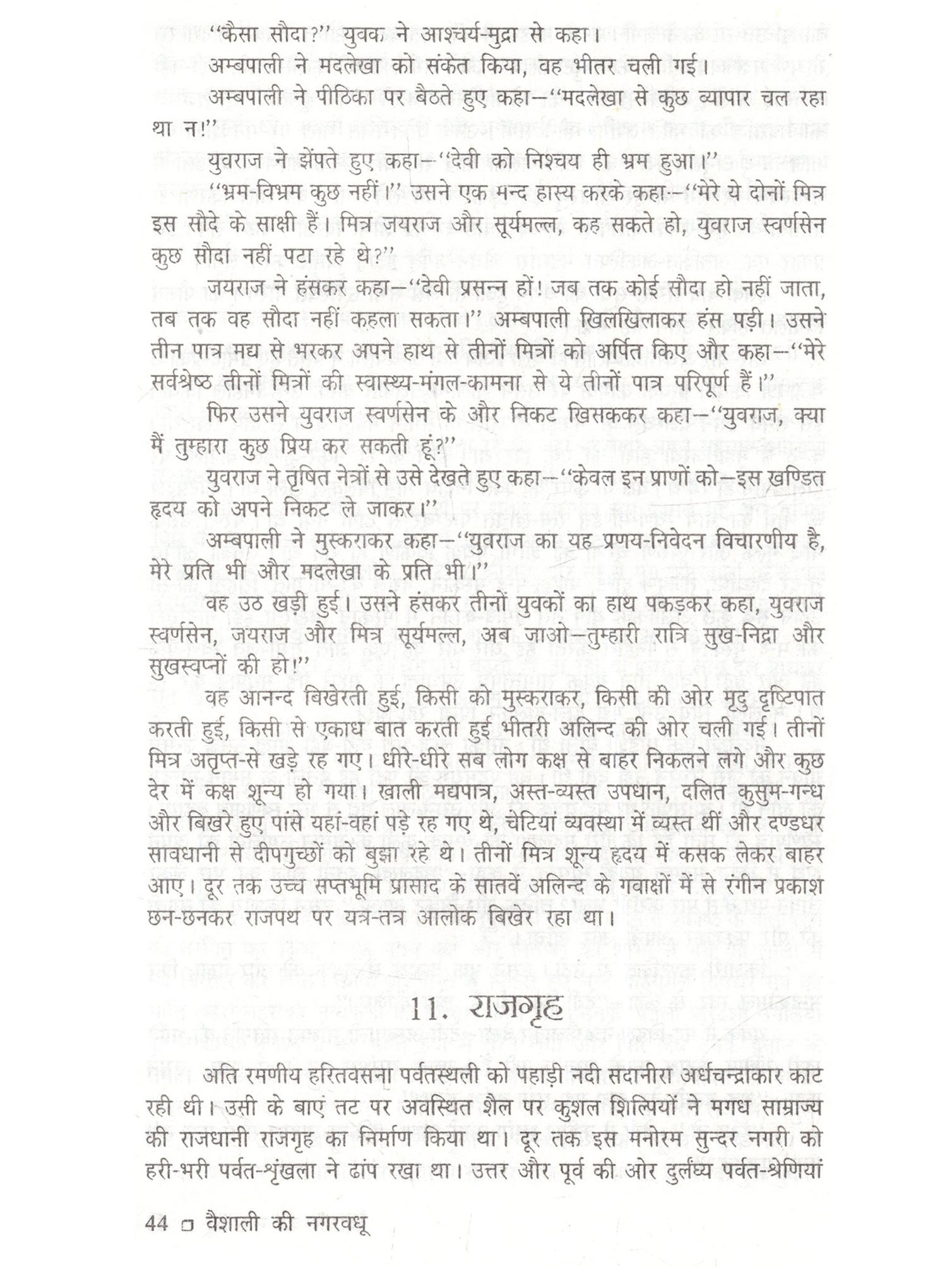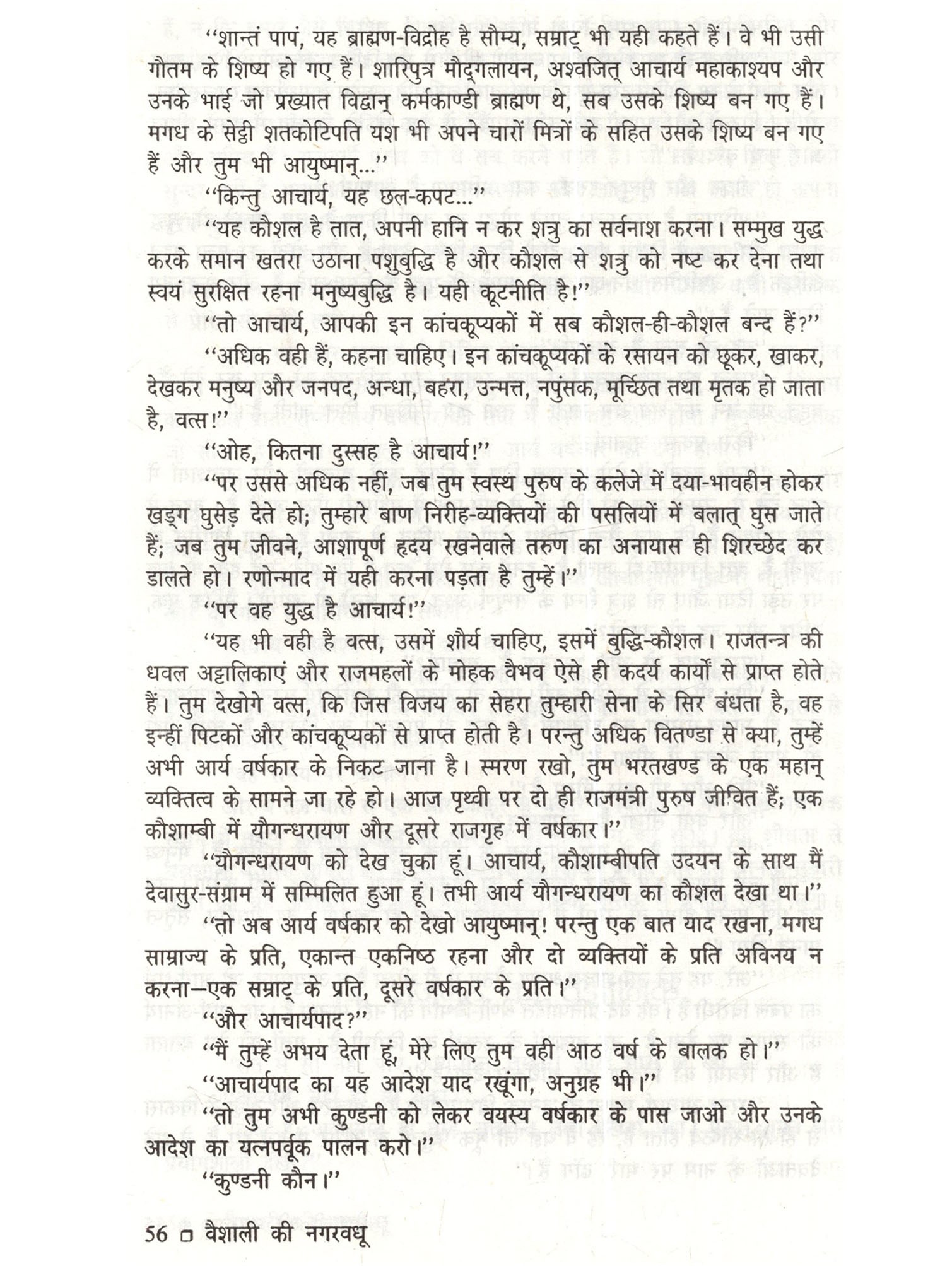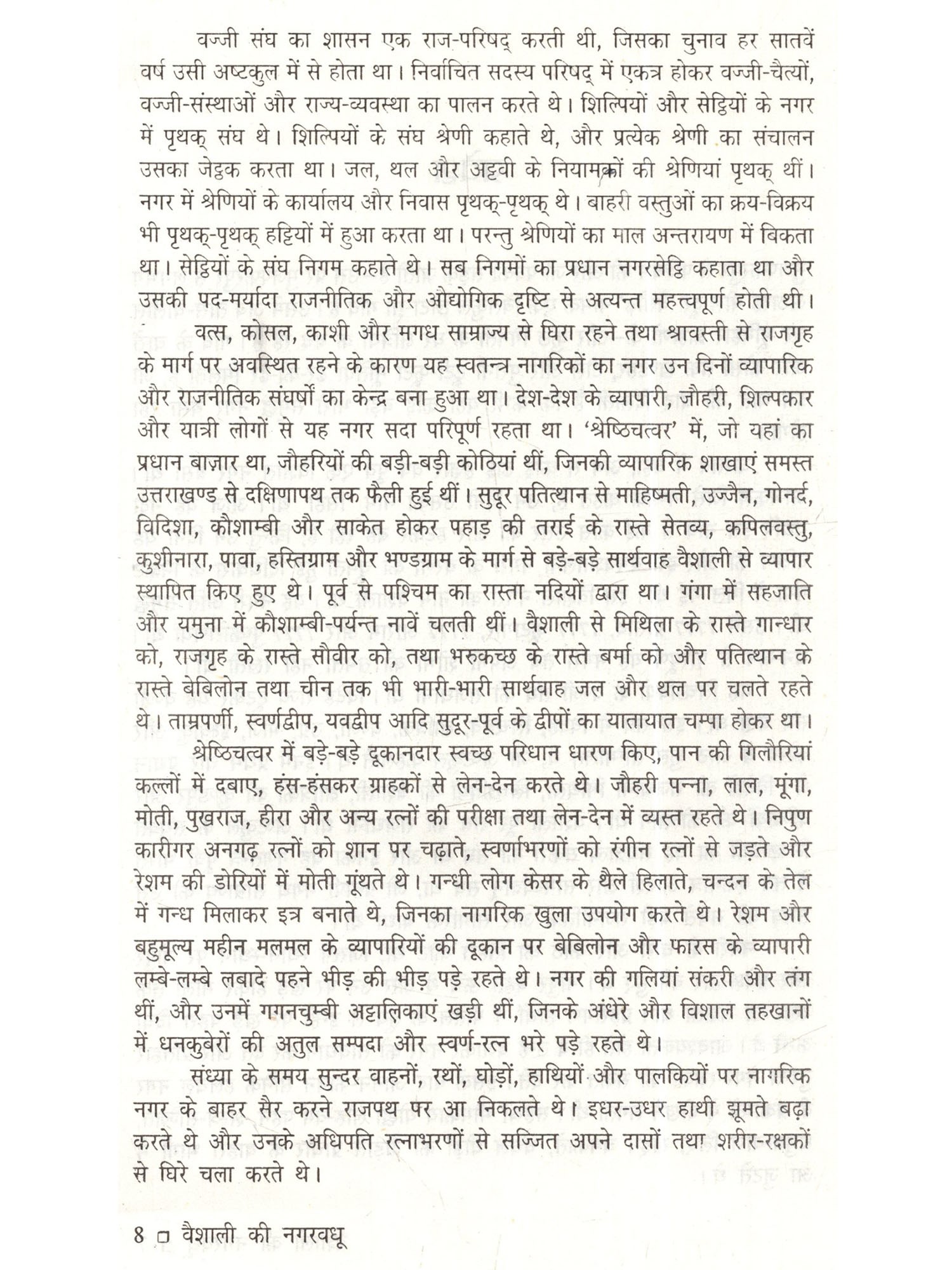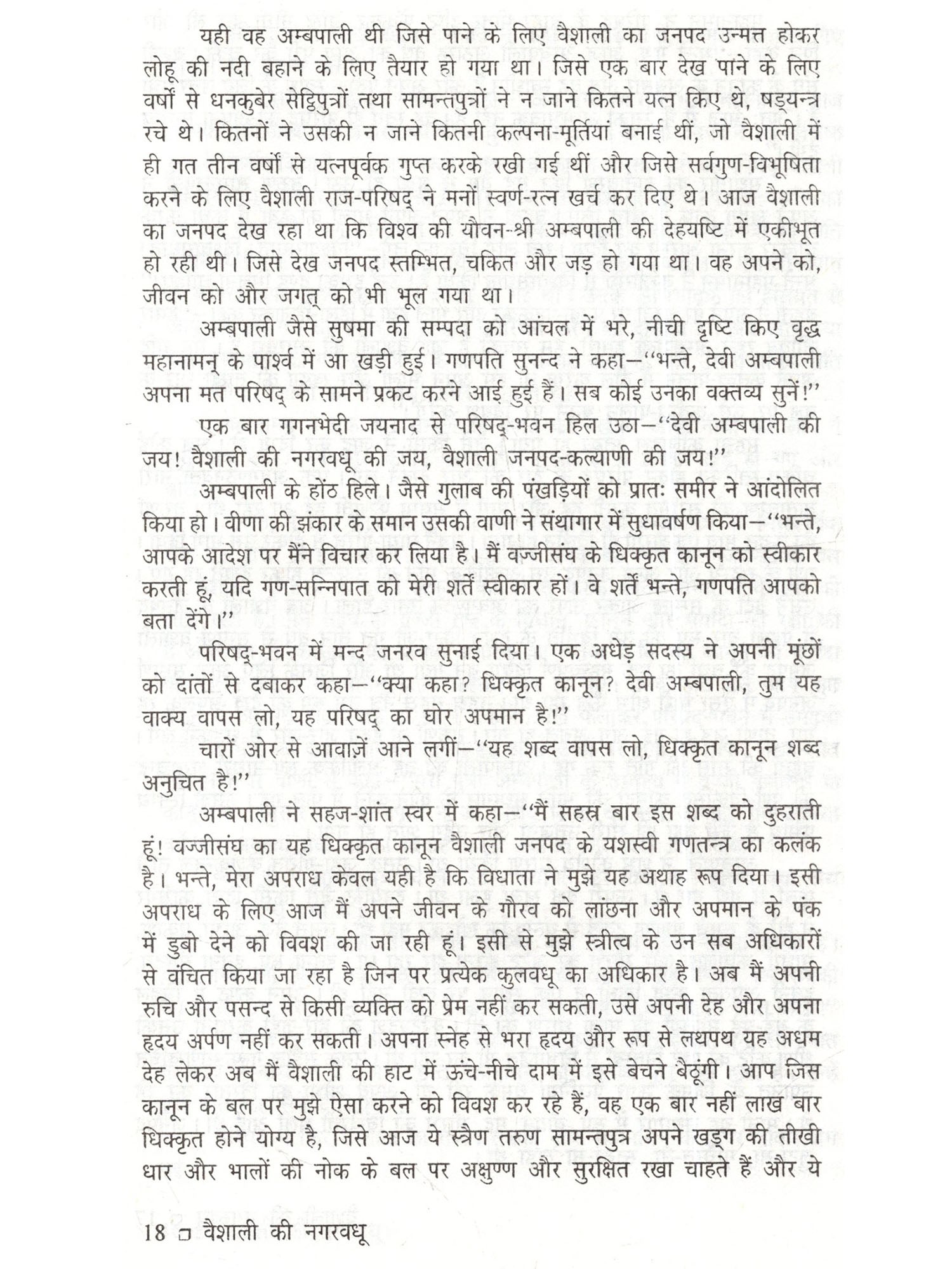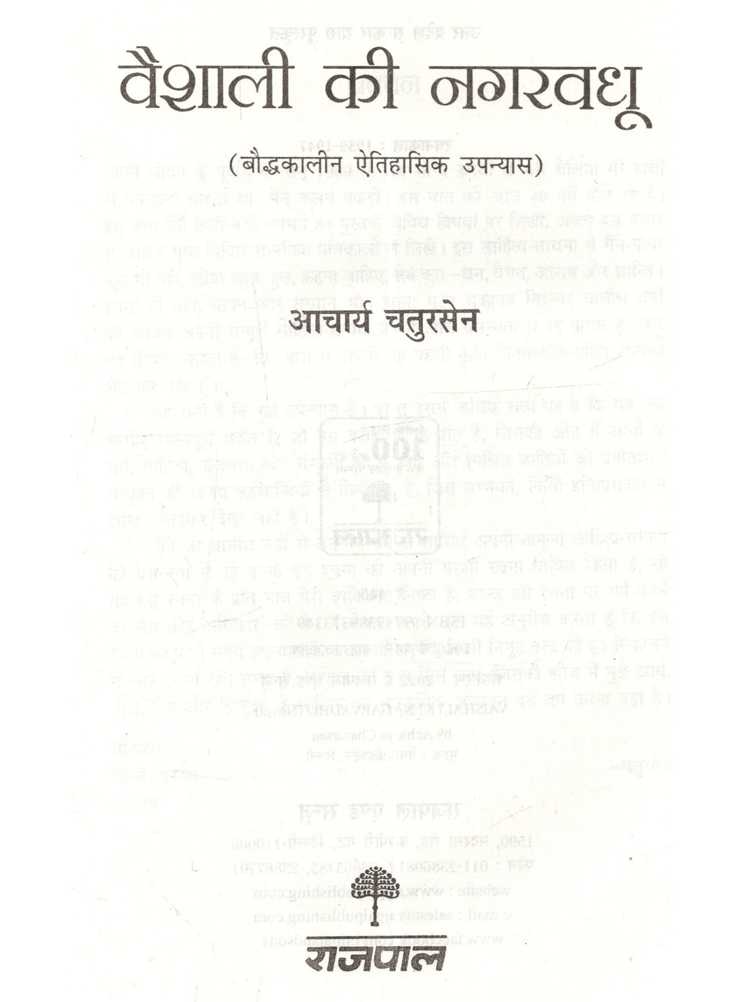 मैं अब तक की अपनी सारी रचनाओं को रद्द करता हूँ," आचार्य चतुरसेन ने वैशाली की नगरवधू पूरा करने के उपरांत कहा था अर्थात् अपनी इस कृति के सम्मुख उन्हें अपनी बाकी रचनाएँ बिल्कुल हल्की लगीं। लेखक की यह स्वीकृति इस उपन्यास के महत्त्व को बयां करती है। इस कालजवी उपन्यास के केन्द्र में है, आज से 2500 वर्ष पूर्व के वैशाली गणतंत्र की राजनर्तकी अम्बापाली। वैशाली में उन दिनों नियम था कि नगर की सबसे सुन्दर नर्तकी को पूरे नगर की वधू माना जाता था। इसीलिए अम्बापाली को नाम दिया गया वैशाली की नगरवधू । इस उपन्यास को लिखने के लिए आचार्य चतुरसेन ने तत्कालीन हिन्दू, जैन और बौद्ध साहित्य का अध्ययन किया और गहन शोध करने के उपरांत ही इस कृति की रचना की। अपने अप्रतिम सौन्दर्य और अंतरंग राजसी संबंधों के कारण शक्ति का केन्द्र रही अम्बापाली बौद्ध धर्म के प्रभाव में आकर अध्यात्म के मार्ग पर चल पड़ती है। एक तरफ़ राजपाट और दूसरी तरफ़ आत्मिक यात्रा इन्हीं दो कथाओं का ताना-बाना है इस उपन्यास में। आचार्य चतुरसेन हिन्दी के सुप्रसिद्ध साहित्यकार हैं जिन्होंने सैकड़ों कहानियाँ और कई चर्चित उपन्यास लिखे हैं। उनका रचनात्मक फ़लक बहुत विशाल था जिसमें उन्होंने धर्म, राजनीति, समाजशास्त्र, स्वास्थ्य और चिकित्सा आदि विषयों पर लिखा। उनकी 150 से अधिक प्रकाशित रचनाएँ हैं जो अपने में एक कीर्तिमान हैं। ऐतिहासिक उपन्यासों के लेखक के रूप में उनकी विशेष प्रतिष्ठा है।