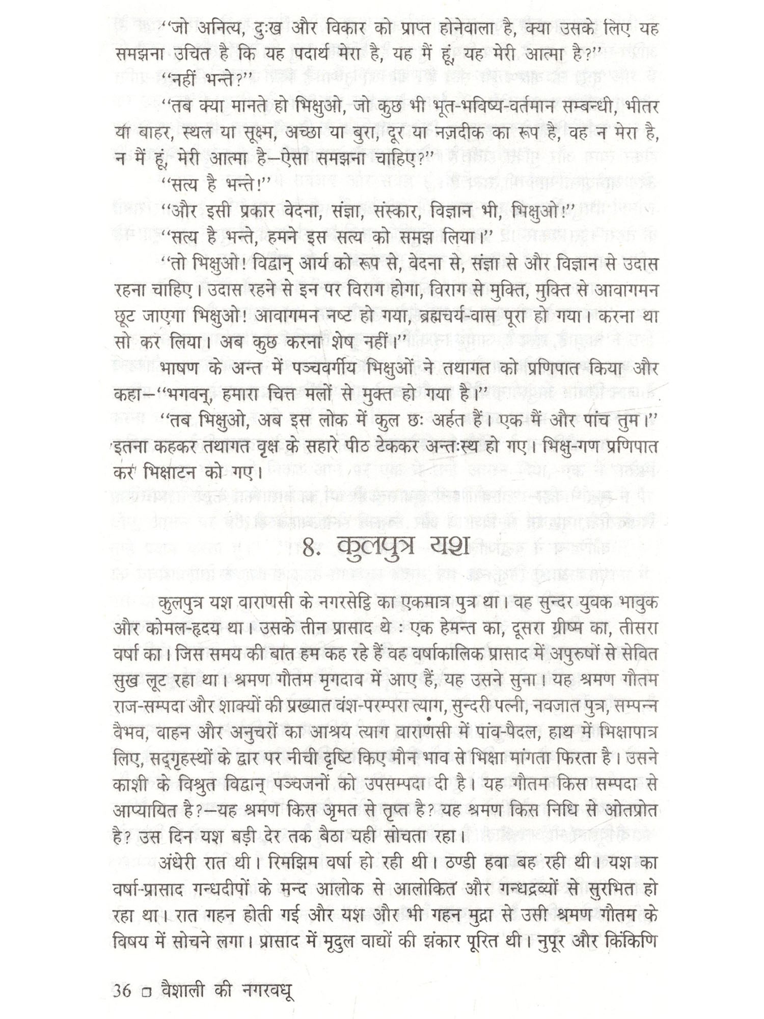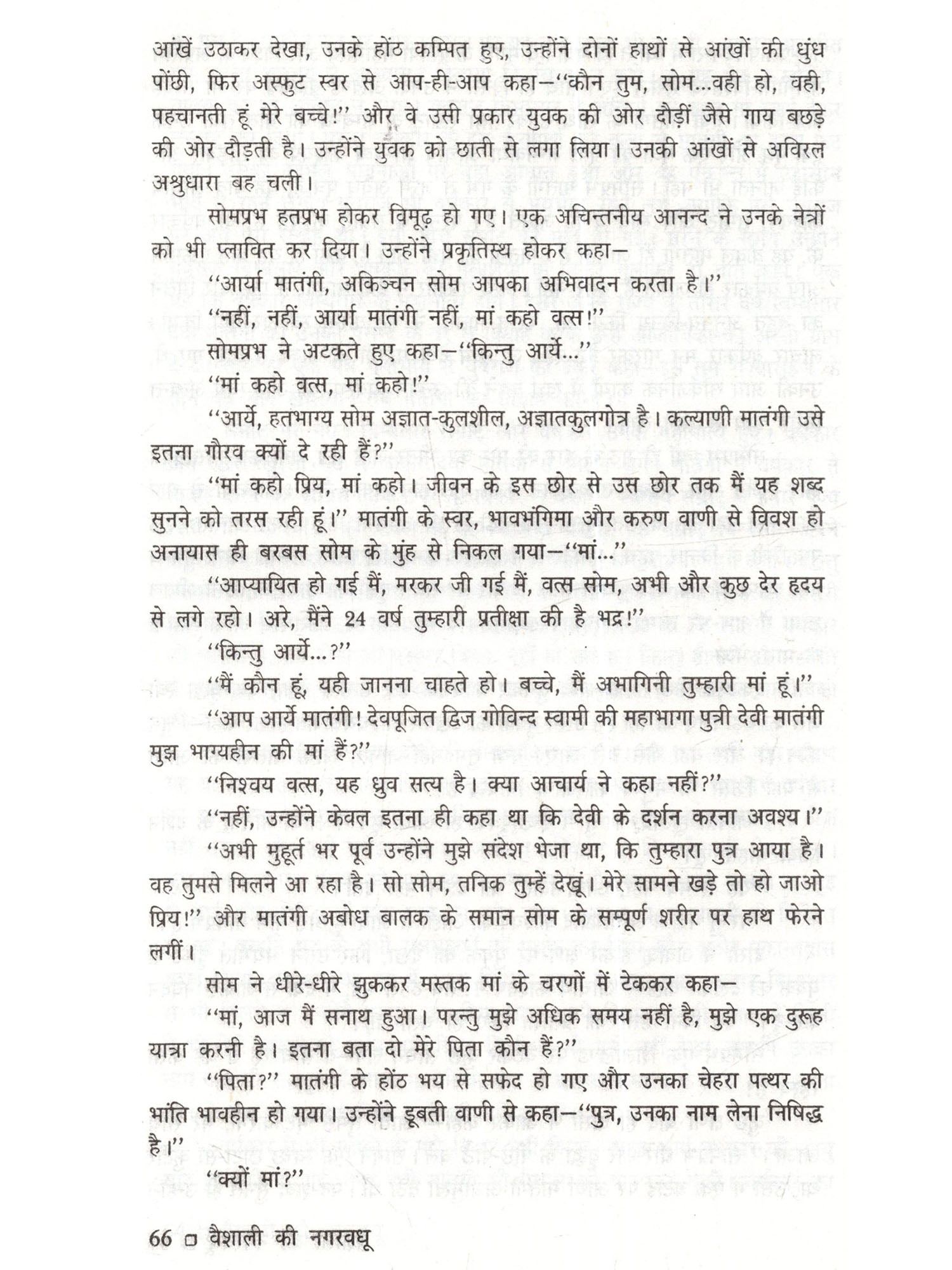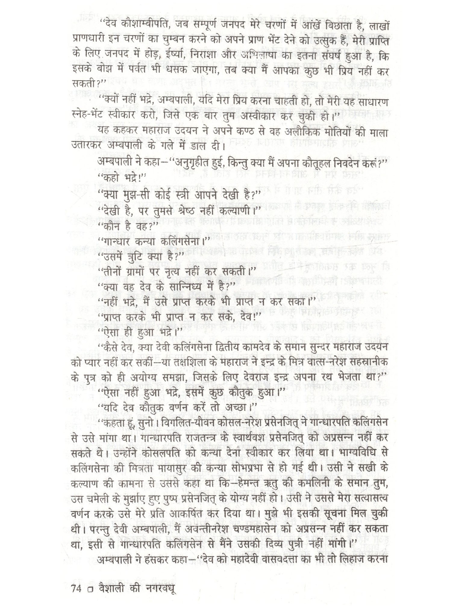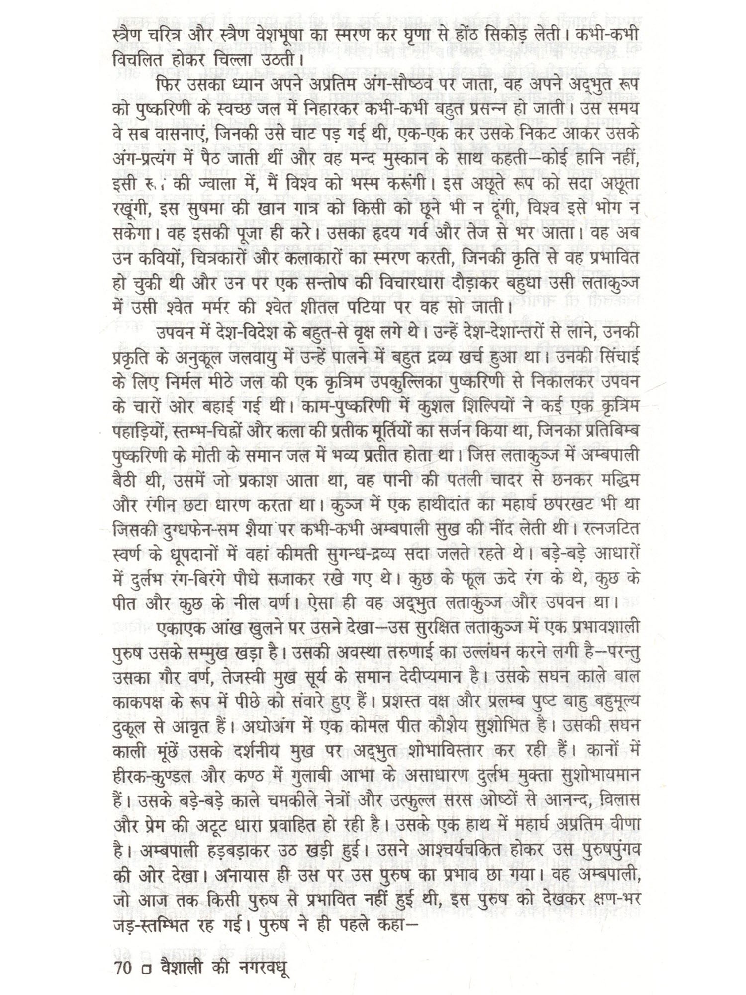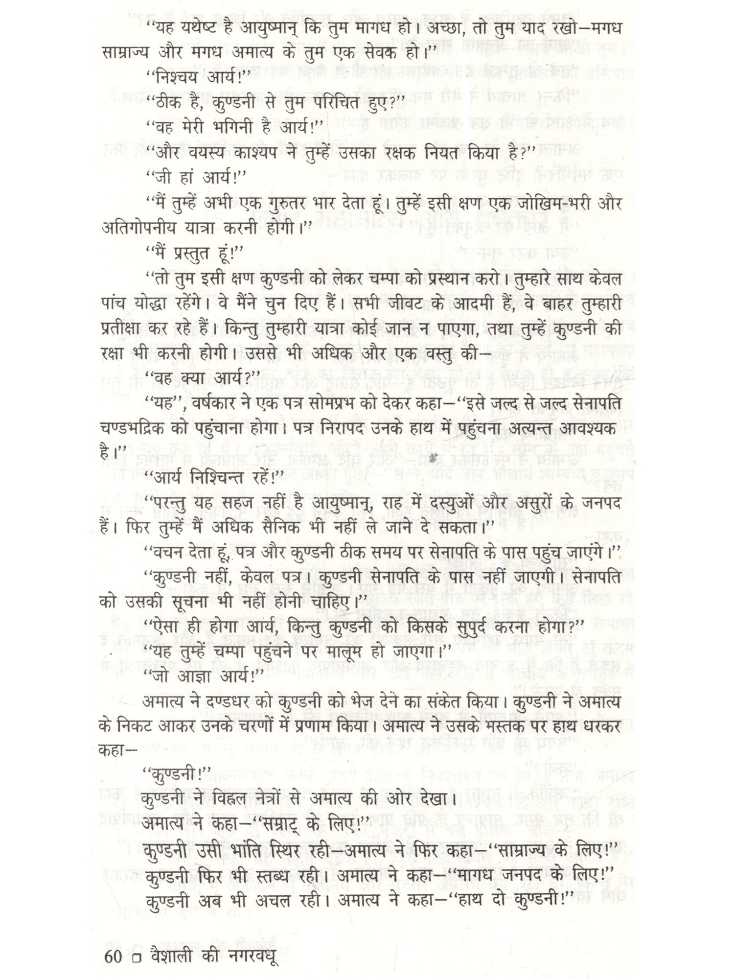 मैं अब तक की अपनी सारी रचनाओं को रद्द करता हूँ," आचार्य चतुरसेन ने वैशाली की नगरवधू पूरा करने के उपरांत कहा था अर्थात् अपनी इस कृति के सम्मुख उन्हें अपनी बाकी रचनाएँ बिल्कुल हल्की लगीं। लेखक की यह स्वीकृति इस उपन्यास के महत्त्व को बयां करती है। इस कालजवी उपन्यास के केन्द्र में है, आज से 2500 वर्ष पूर्व के वैशाली गणतंत्र की राजनर्तकी अम्बापाली। वैशाली में उन दिनों नियम था कि नगर की सबसे सुन्दर नर्तकी को पूरे नगर की वधू माना जाता था। इसीलिए अम्बापाली को नाम दिया गया वैशाली की नगरवधू । इस उपन्यास को लिखने के लिए आचार्य चतुरसेन ने तत्कालीन हिन्दू, जैन और बौद्ध साहित्य का अध्ययन किया और गहन शोध करने के उपरांत ही इस कृति की रचना की। अपने अप्रतिम सौन्दर्य और अंतरंग राजसी संबंधों के कारण शक्ति का केन्द्र रही अम्बापाली बौद्ध धर्म के प्रभाव में आकर अध्यात्म के मार्ग पर चल पड़ती है। एक तरफ़ राजपाट और दूसरी तरफ़ आत्मिक यात्रा इन्हीं दो कथाओं का ताना-बाना है इस उपन्यास में। आचार्य चतुरसेन हिन्दी के सुप्रसिद्ध साहित्यकार हैं जिन्होंने सैकड़ों कहानियाँ और कई चर्चित उपन्यास लिखे हैं। उनका रचनात्मक फ़लक बहुत विशाल था जिसमें उन्होंने धर्म, राजनीति, समाजशास्त्र, स्वास्थ्य और चिकित्सा आदि विषयों पर लिखा। उनकी 150 से अधिक प्रकाशित रचनाएँ हैं जो अपने में एक कीर्तिमान हैं। ऐतिहासिक उपन्यासों के लेखक के रूप में उनकी विशेष प्रतिष्ठा है।