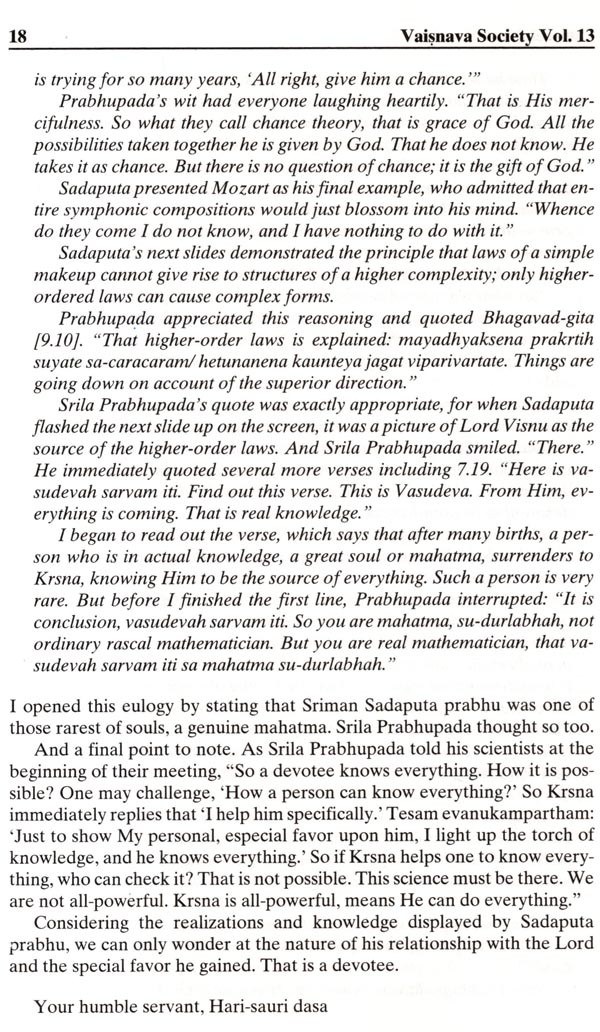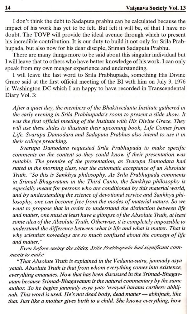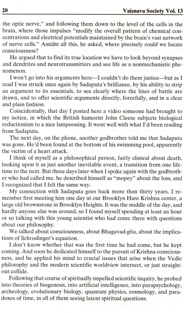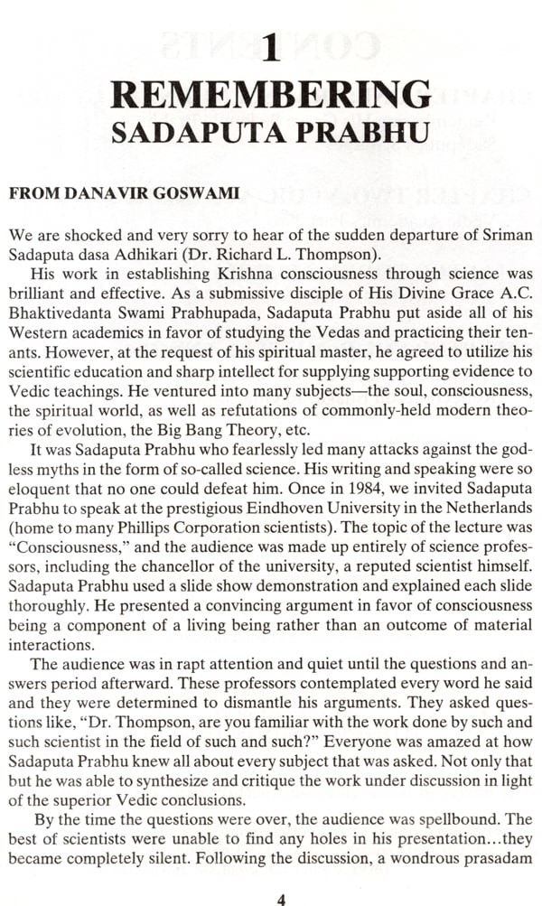 In 1974, Richard L. Thompson received his Ph.D. in mathematics from Cornell University. He specialized in probability theory and statistical mechanics. Later, he conducted research in quantum physics and mathematical biology at the La Jolla Institute in San Diego, the State University of New York at Binghamton, and Cambridge University in the United Kingdom. After becoming an initiated disciple of His Divine Grace A.C. Bhaktivedanta Swami Prabhupada and receiving the spiritual name Sadaputa dasa, he put aside all of his Western academics in favor of studying the Vedas and practicing their tenants. However, at the request of his spiritual master, he agreed to utilize his scientific education and sharp intellect for supplying supporting evidence to Vedic teachings. He ventured into many subjects-the soul, consciousness, the spiritual world, as well as refutations of commonly-held modern theories of evolution, the Big Bang Theory, etc. It was Sadaputa Prabhu who fearlessly led many attacks against the godless myths in the form of so-called science. His writing and speaking were so eloquent that no one could defeat him.