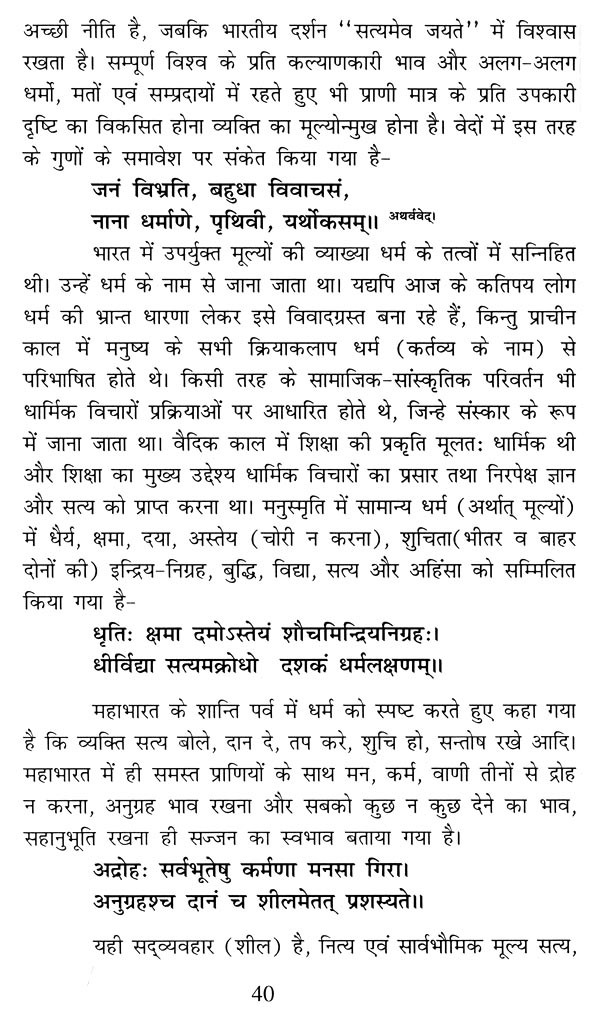 धर्म, नीति और मूल्य ये तीनों संस्कृति के अभिन्न अंग हैं। धर्म का ही व्यावहारिक रूप नीति है और नैतिक धारणा अधिकांशतः मानव मूल्यों के स्पष्टीकरण में सहायक होती है। धर्म और दर्शन नैतिक जीवन के आधार माने गए हैं। भारतीय धर्म एवं सनातन संस्कृति में सहजता, सरलता के कारण सामासिक संस्कृति तथा सबके समावेश के गुण तथा सुदृढ़ता विद्यमान है।