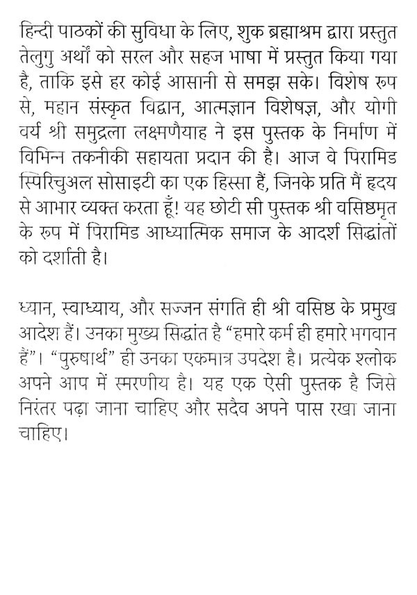 वसिष्ठामृतम् जीवन को गहराई से समझने और आत्मा के वास्तविक स्वरूप को पहचानने की दिशा में एक महत्वपूर्ण मार्गदर्शक है, जो आत्म-संतोष, मानसिक शांति, और आंतरिक जागरूकता की ओर ले जाता है।