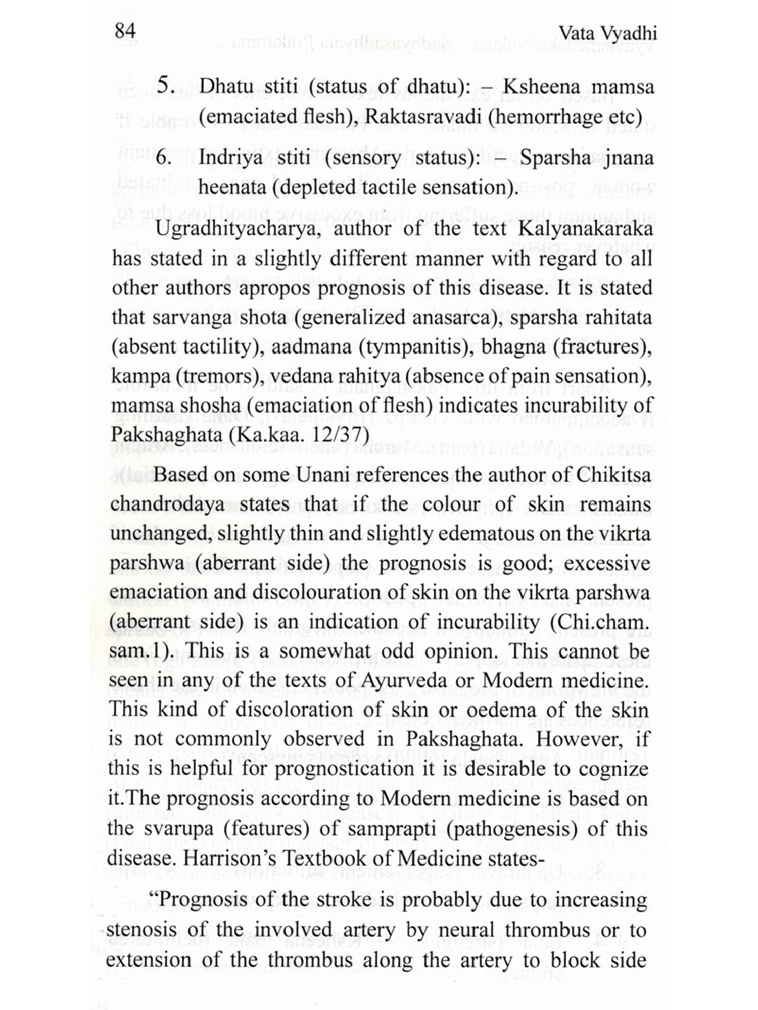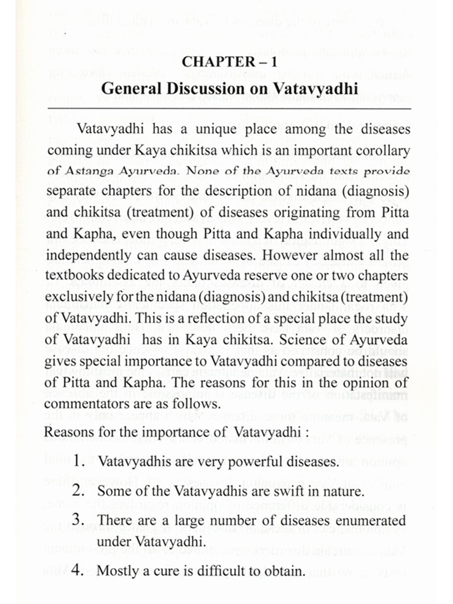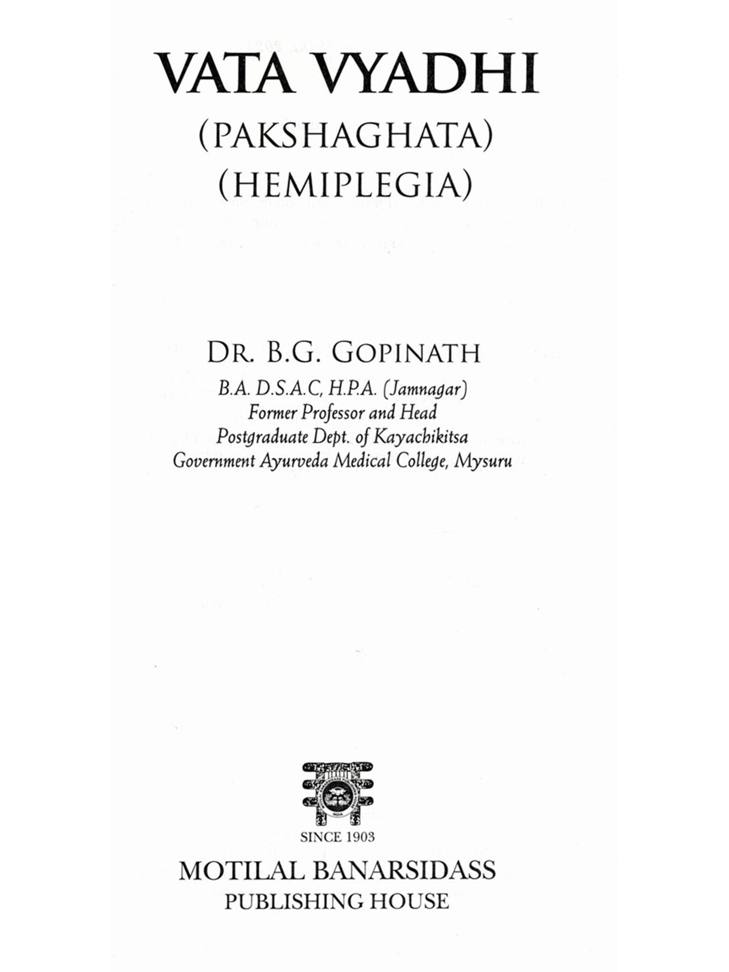It gives me immense pleasure to place this English version of my book 'Vatavyadhi' (Pakshaghata) written in Kannada about three and a half decades ago, which actually became out of print just a year after its publication. Soon after there was a demand from students, teachers and the other Ayurveda fraternity, especially from states outside Karnataka and also students of Ayurveda colleges in Karnataka who were from other states, to bring out this book in English. I too felt the demand was genuine. Since then, it was my cherished desire to bring out an English version of it in order to quench the thirst of knowledge of the younger generations. However, on account of my pre-occupations, serious health hazards beyond my control and also advanced age, I could not make my dream come true for decades. But then destiny wished it to happen and thus it happened. One day my friend and junior colleague Dr. M. Ramesh, a retired Professor from Government Ayurveda Medical College, Bengaluru, contacted me over the phone to enquire about my health. It was certainly a pleasant surprise to me. After preliminary conversations, the matter of translating my book in Kannada to English, which was relegated to the background for a long time, came up and he voluntarily opted to take up this' not so easy job'. My joy knew no bounds to learn this and eventually I gave my heart felt consent on the spot. Dr.Ramesh worked with full devotion and dedication consequent to which this English version of my book is made available to all interested readers so that the knowledge stream can continue to flow for years to come. I regret for not being able to cover all Vatavyadhi's, though initially intended to. Vatavyadhi's are stated to be more than eighty in number, each one of them or quite a few of them are major diseases like Grdhrasi, Vishvachi, Antarayama, Bahirayama, Manyastambha, Apabahuka, Ardhita, Pangu, Udavarta, Aanaha, Aadmana and so on and so forth need to be covered in detail in so far as their diagnostic and therapeutic dimensions are concerned, on the same lines as this book. However if the present translated work motivates younger generations to think and act in this direction so as to keep our precious knowledge and heritage ever growing and glittering, the effort put in here will be really worth it. I hope and trust that my humble desire will fructify in the near future.