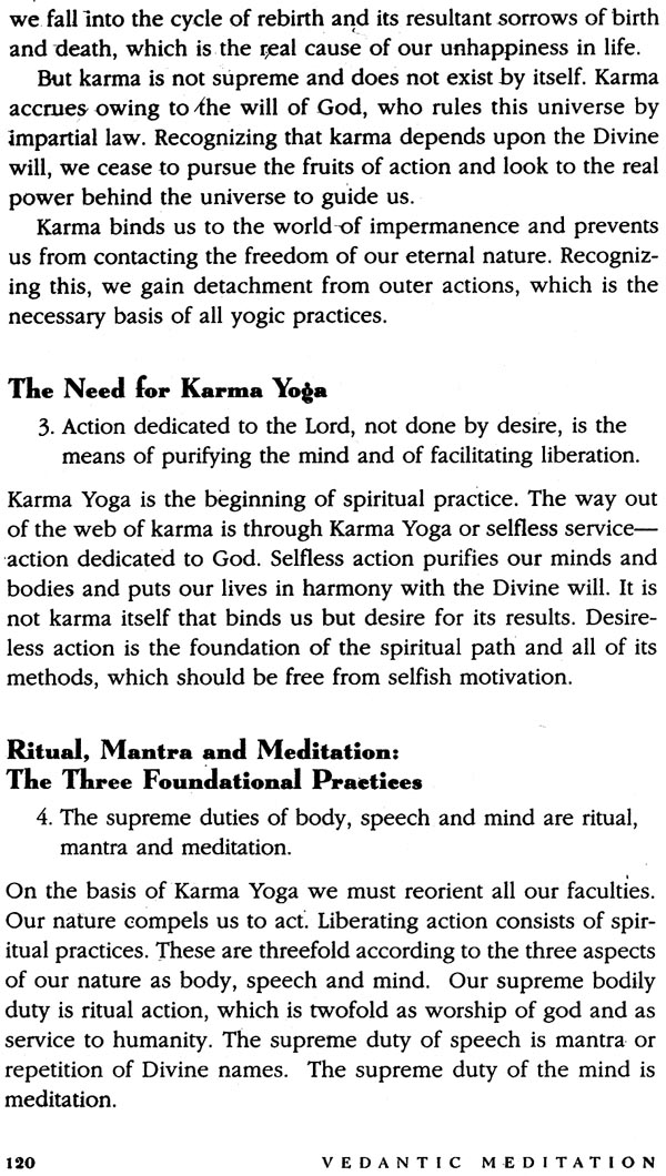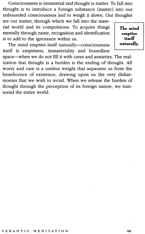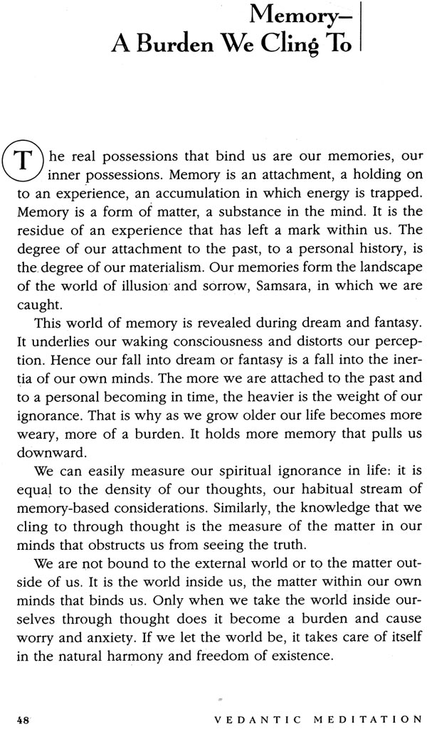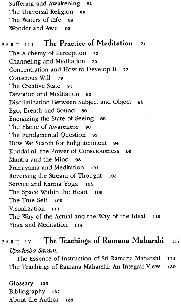 This book emphasizes the practical side of Vedanta as a way of meditation, which is the real essence of the teaching. Its explication of meditation is fluid, showing a many-sided view of Vedanta and the philosophy’s complete understanding of human nature. The Vedantic way of meditative inquiry unfolds through various questions and contemplations. The book is divided into four sections:
