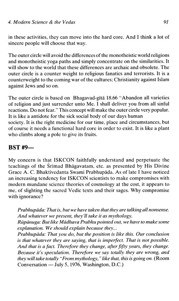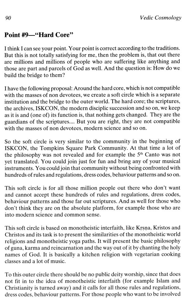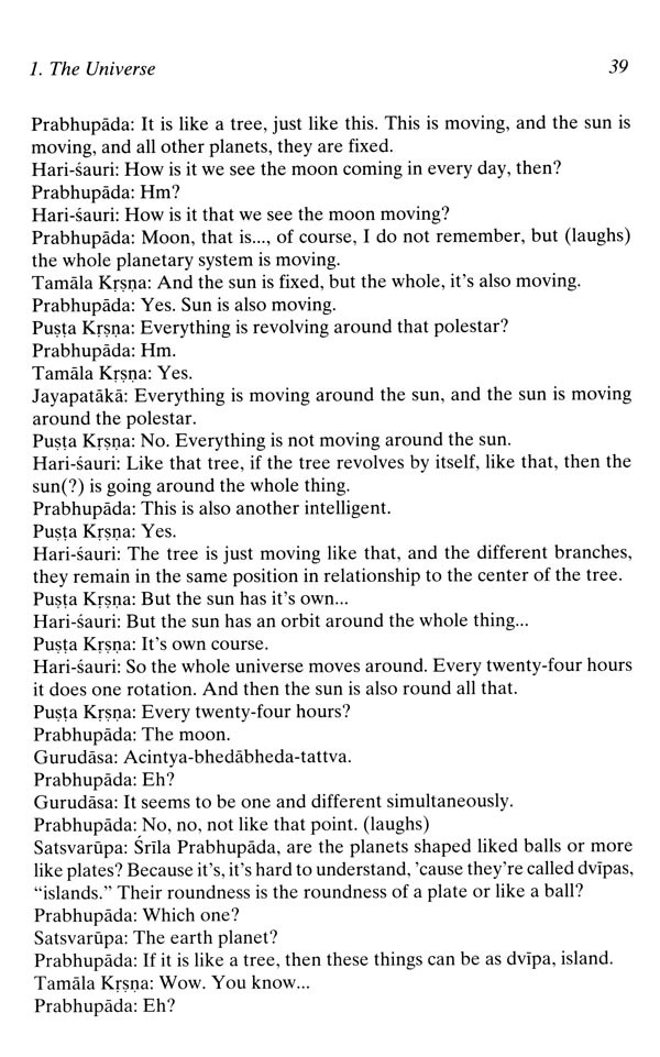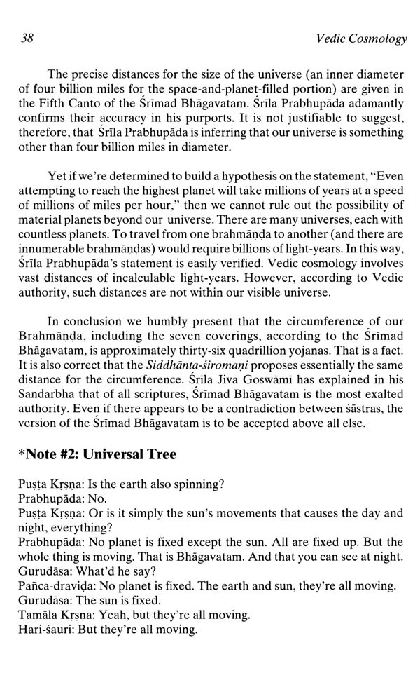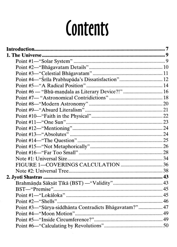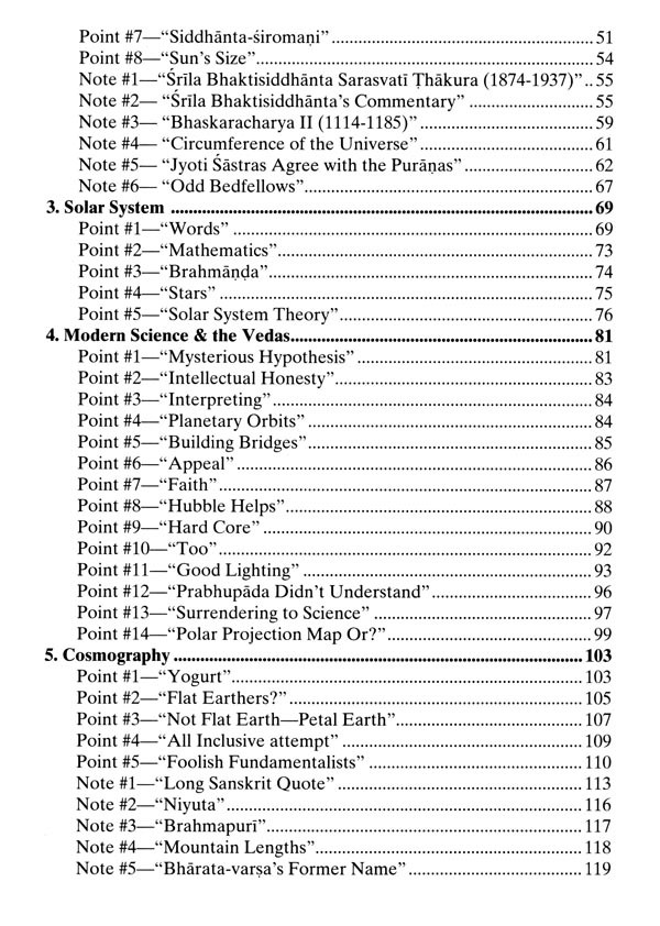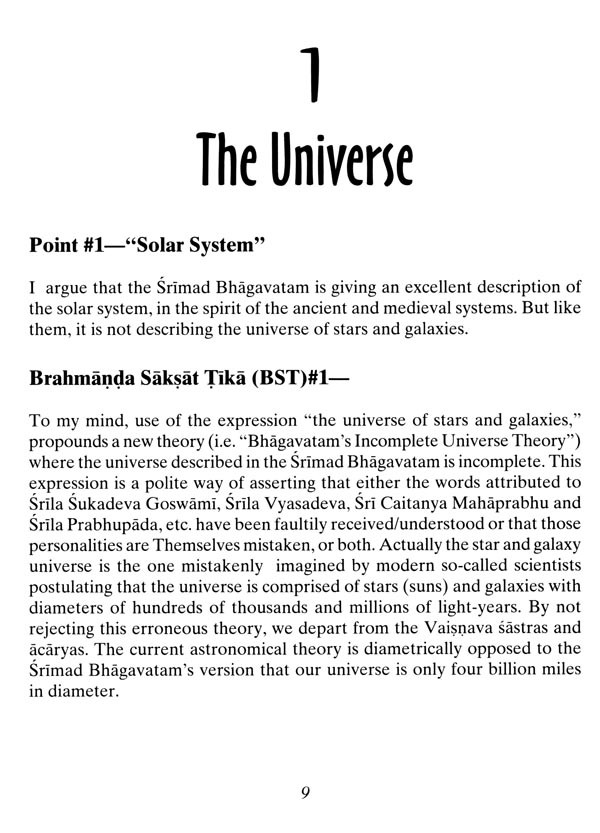 The first eight chapters of Vedic Cosmology primarily take the form of a debate. On one side are the "Points" representing many of today's ostensibly Vedic-scientific theories. The response comes from our humble self in the form of "Brahmanda Sakşat Tika" or "BST" for short, meaning "Vedic Cosmology taken literally." It should be mentioned that the discussions herein are not merely exercises in theoretical argumentation. Indeed the views expressed in "Points" do weigh heavily at present despite the fact that they are influenced by modern scientific theories which contradict Vedic literature. Thus these crucial issues and their conclusions will determine the degree to which we have understood His Divine Grace A.C. Bhaktivedanta Swami Prabhupada's instructions on Vedic cosmology and the means of receiving transcendental knowledge.