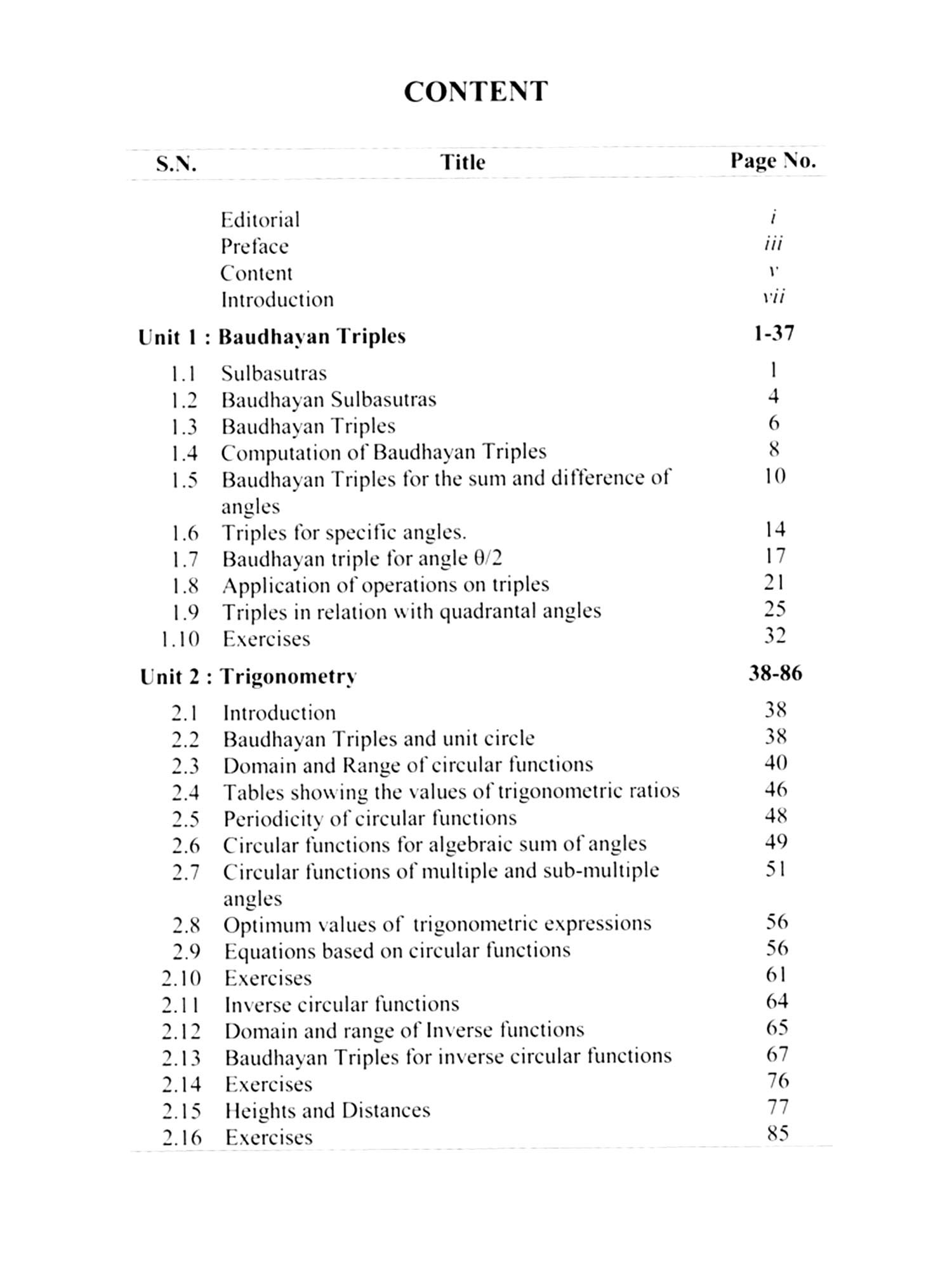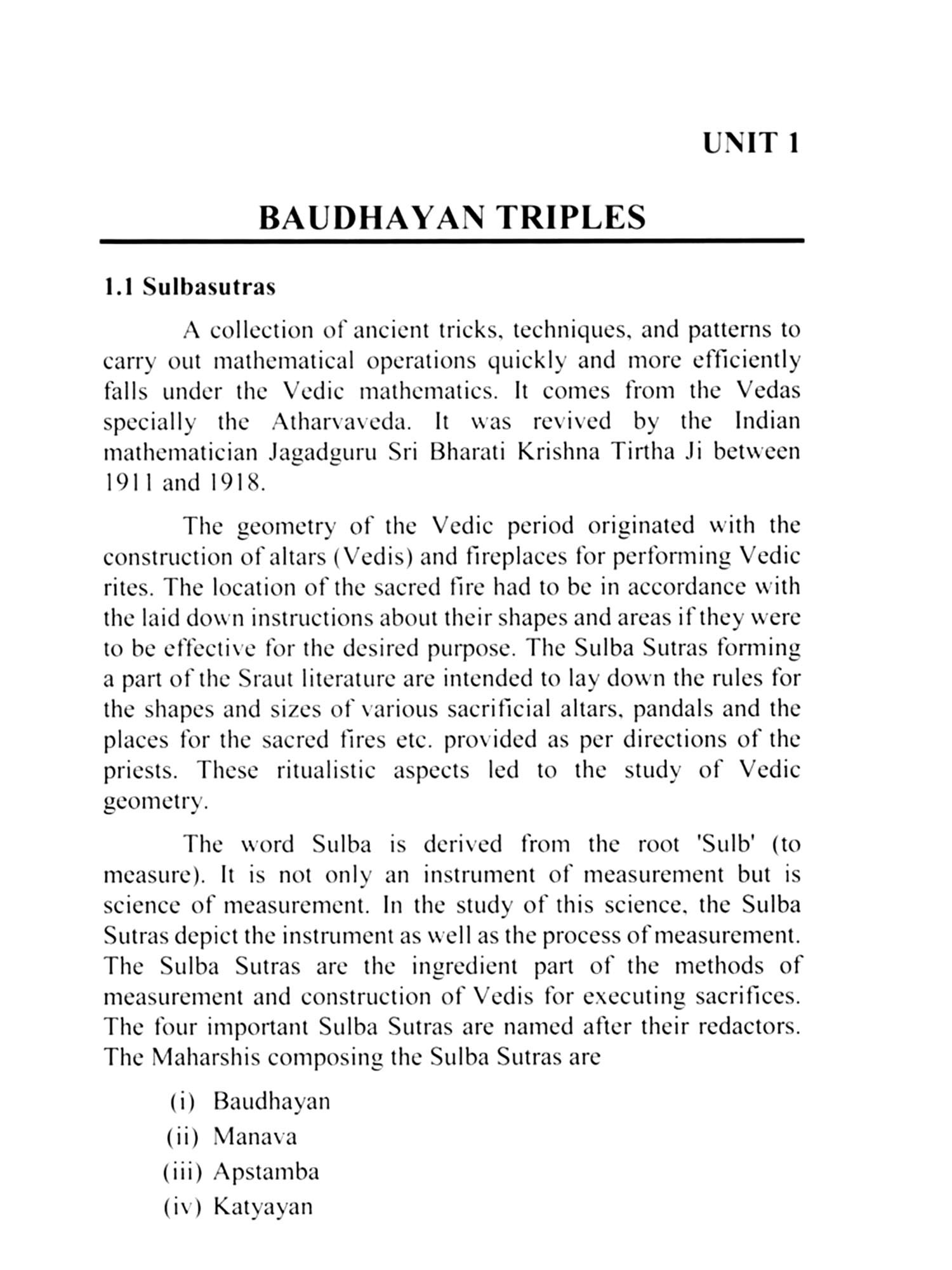 The first unit of the book deals entirely with the formation of Triples in general and elaborate the nature of such triples. The addition and subtraction of triples is defined and is justified geometrically. Based on these operations the triples for multiples of angles are obtained. In particular triples for angles of right-angled triangle, the sides bearing specific relations, are also determined. The operations are interesting, easy and inspiring and prepare a sound base for advanced work in geometry, trigonometry, astronomy etc. Illustrations along with geometrical figures exhibit the clarity of the content of the subject to comprehend.