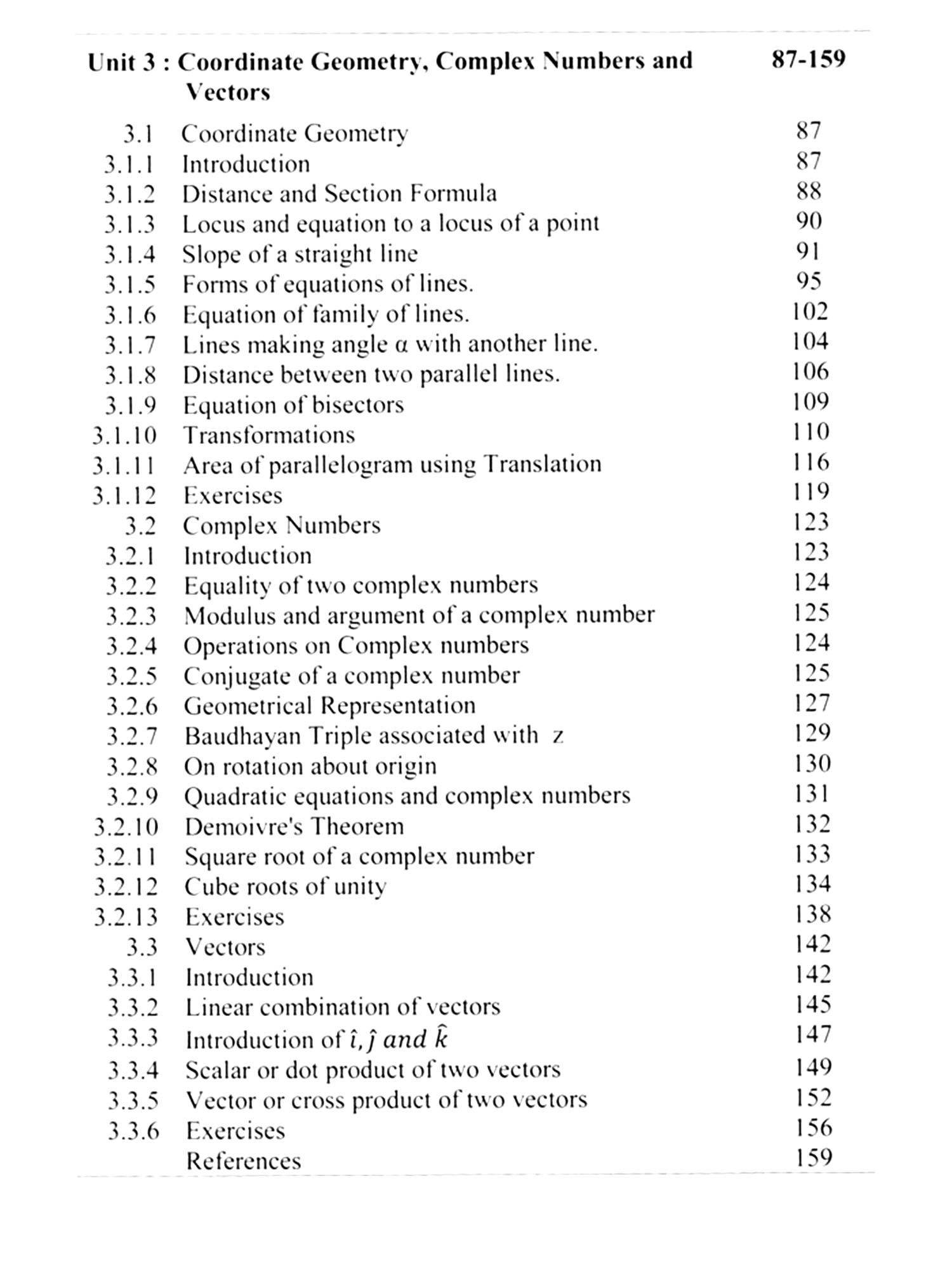 The third unit is on coordinate geometry, vectors and complex numbers. It is endeavored that the new chapters on complex numbers and vectors may easily be assimilated by beginners having no sound background of mathematics at early stages. The triples associated with the line, points and complex numbers help a lot to solve the difficult and cumbersome problems in easy, effective and error free ways. The measurement of area of linear geometrical figures could be obtained in few steps without any chance of errors taking place. The transformations in geometry play a significant role in solving tricky problems. The application of triples makes such solutions easy and takes less time. Such transformations could subsequently be applied in vectors as well as complex numbers. At the end of each unit a set of variety of questions too has been provided to the learners for practice. Further efforts are under way to make the application of triples more effective, inspiring and confidence building tool to deal with the problems of sciences also.