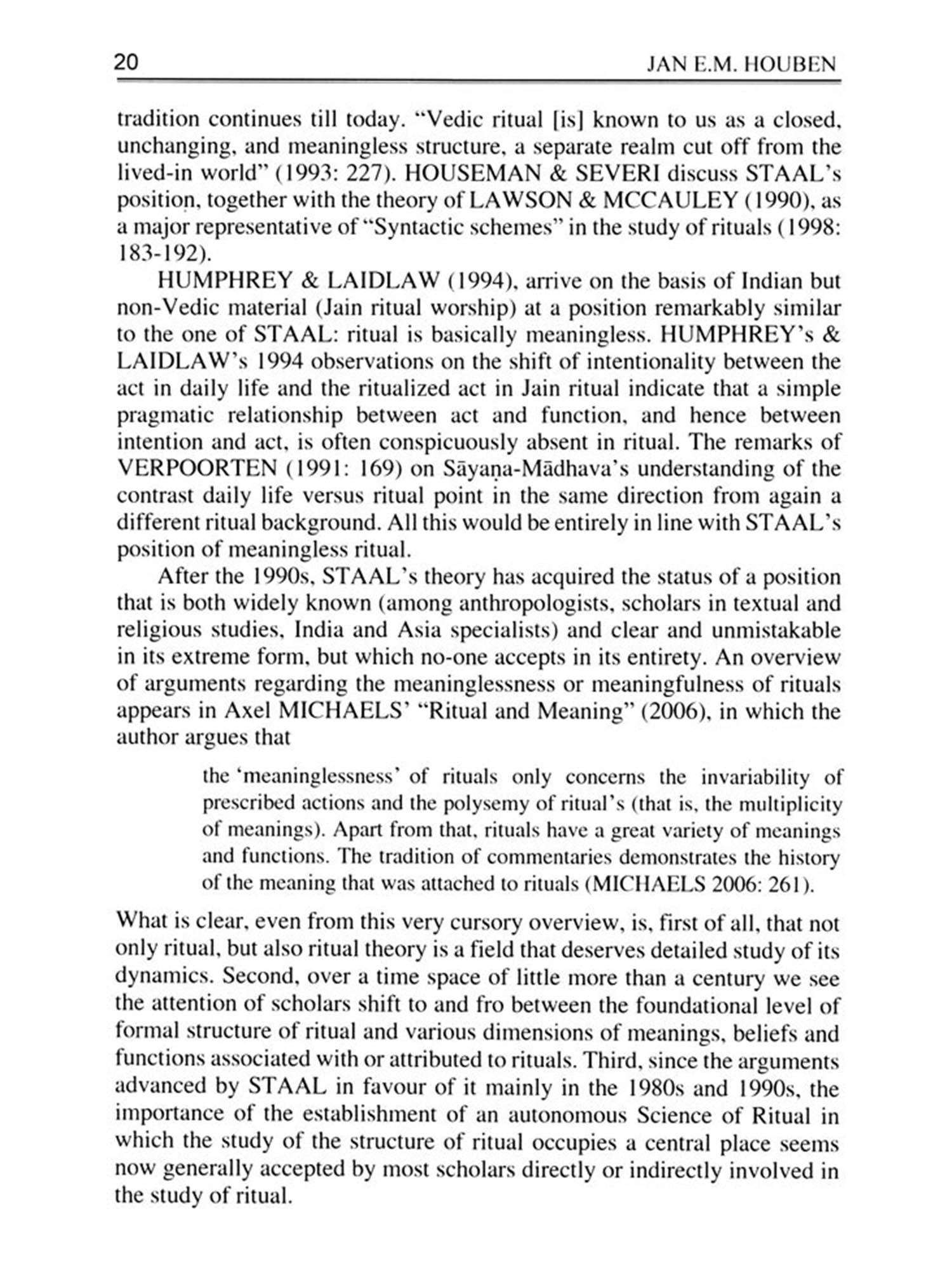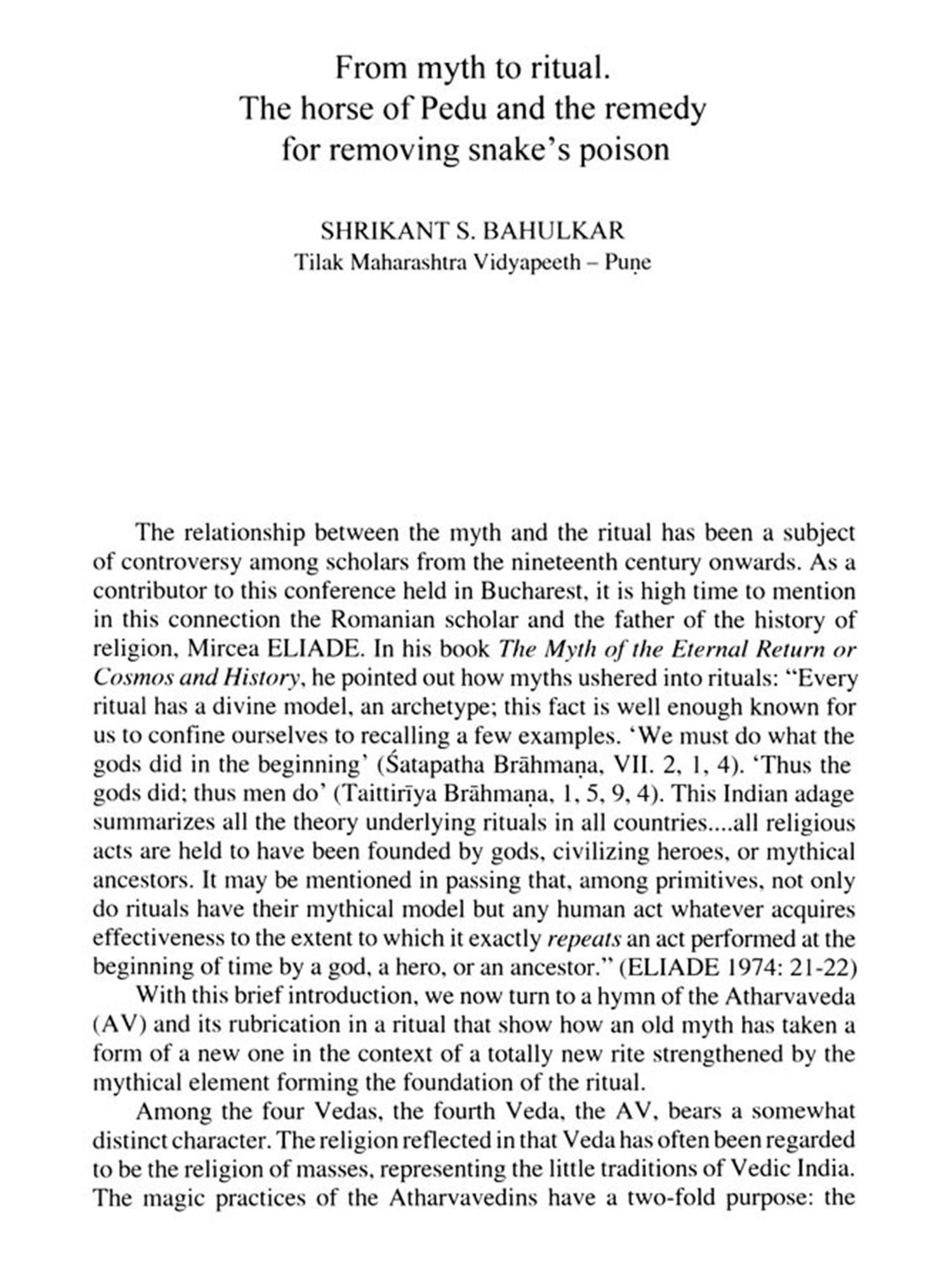 1. As an Introduction to this volume of essays on Vedic Myths and Rituals, I would like to explore here some aspects of the nature and function of myths and rituals, more specifically Vedic myths and rituals. Both myths and rituals play an important role in religious practice, and for students of religion since the end of the nineteenth century the question arose which one is to be regarded as primary, myth or ritual. In this introductory essay I will deal with myth and ritual primarily from the perspective of the experience by the ritual actors. This angle of approach has the advantage of integrating these two valuable but seemingly opposed theoretical approaches, the one which considers ""myth"" as primary and as crucial for the reconstruction of distant and ancient worldviews-a meaning oriented approach adopted by scholars such as James George Frazer (1854-1941) and later on also Mircea Eliade (1907-1986)-and the other which considers ""ritual"" as primary- a formal approach adopt-ed by Sylvain Lévi (1863-1935) and his students Henri Hubert (1872-1927) and Marcel Mauss (1872-1950) and in a somewhat extreme form (radical rejection of meaning in order to focus on ritual structure) by Frits Staal (1930-2012).