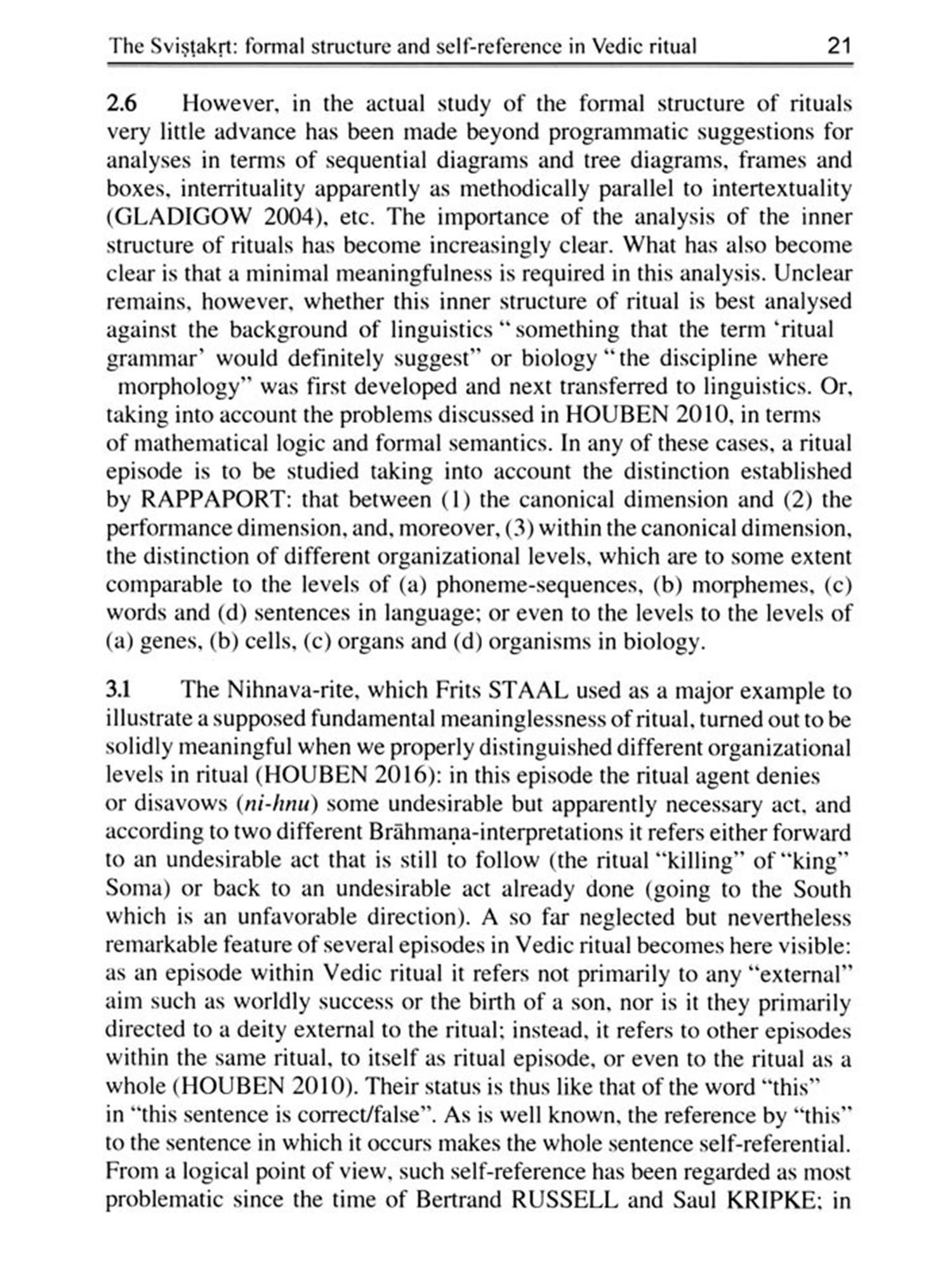 Jan Houben's paper examines the Svistakṛt offering-a regular ele-ment in both the new and full-moon Isti sacrifice and similar rituals-focusing on its position within Vedic ritual structure and its representa-tion in Brähmanas and other ritual texts. To understand the significance of ritual structure analysis, Houben amply reviews ritual theory through various scholars: from Frazer, through Durkheim's sociological school (Hubert and Mauss), to Sanskritists (Lévi, Renou, Caland), to Staal's theory of meaningless ritual, and finally to Rappaport's view of rituals transmitting two message types: canonical (encoded by non-performers) and self-referential (conveying participants' current status). Tracing the core meaning of the ritual in the yajñéna-yajñám type of offering (RV 1.164.50ab10.90.16ab), the paper demonstrates that while the Svistakṛt offering has minimal mythology, it holds significant ritual importance. Its value lies in its structural position, serving to confirm, support, and protect other offerings and itself.