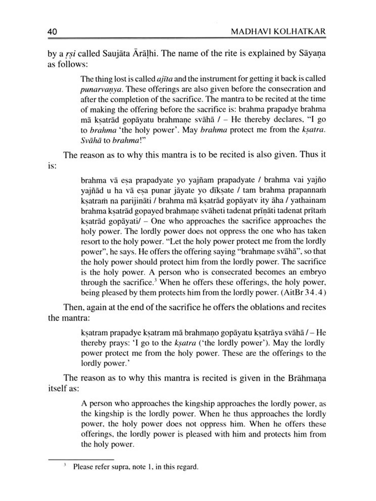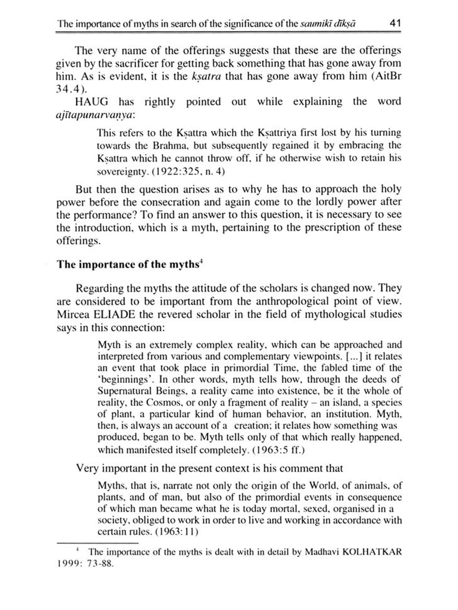 Madhavi Kolhatkar's article explains the significance of the Saumikī dīksä the ritual of initiation or consecration undergone by the sacrificer in the Soma sacrifice to make himself ready and eligible for the rite. She begins by posing key questions: What is the significance of this dīksā? Why must the sacrificer undergo embryogenesis, a process unique to this rite in Vedic śrauta ritual? Why does the birth not occur? The paper traces the myth underlying the rite in the Aitareya Brahmana, chapters 34 to 39, and interprets it through Mircea Eliade's paradigm of embryogeny in the rājasūya: the recreation of the Universe, return to the embryonic state of the sacrificer-sovereign, year-long gestation, and mystical rebirth as Cosmocreator-identified with both Prajapati (the All-God) and the Cosmos. Kolhatkar also examines important related themes, such as the rivalry between ksatriya and brāhmaņa in Vedic literature.