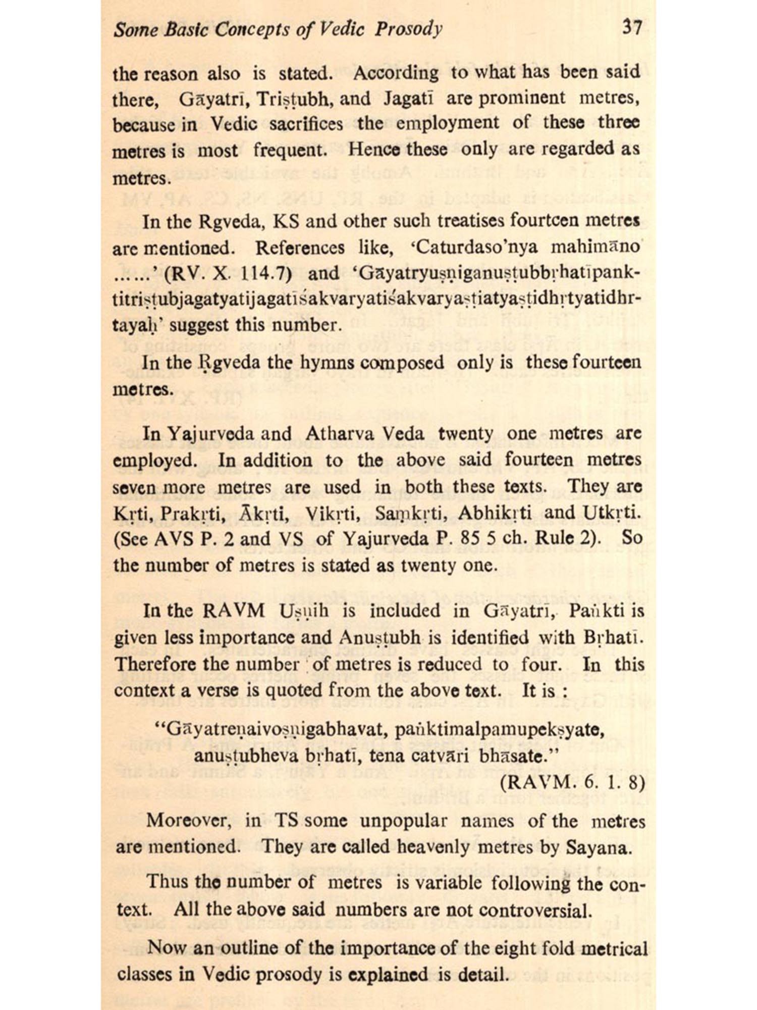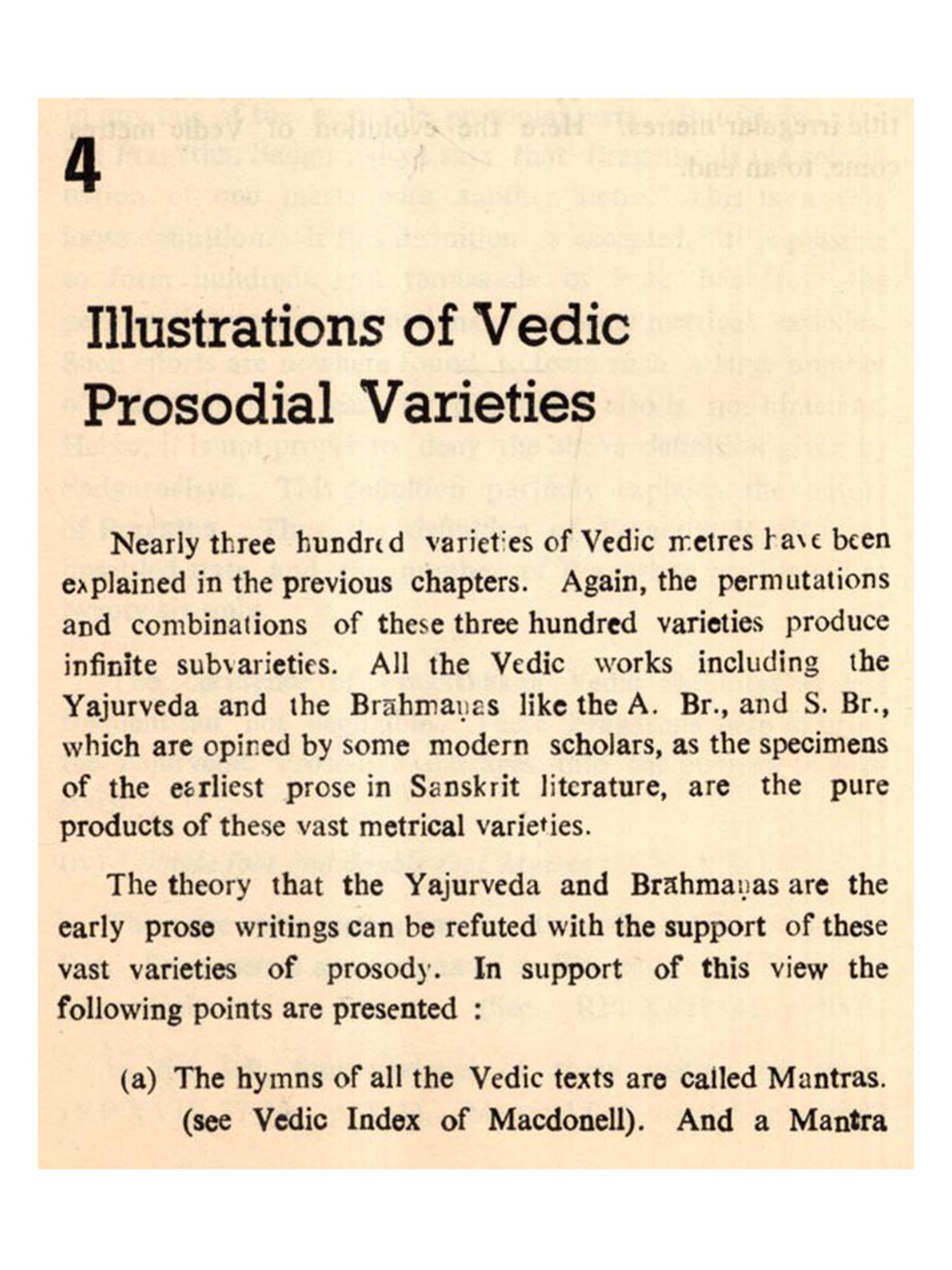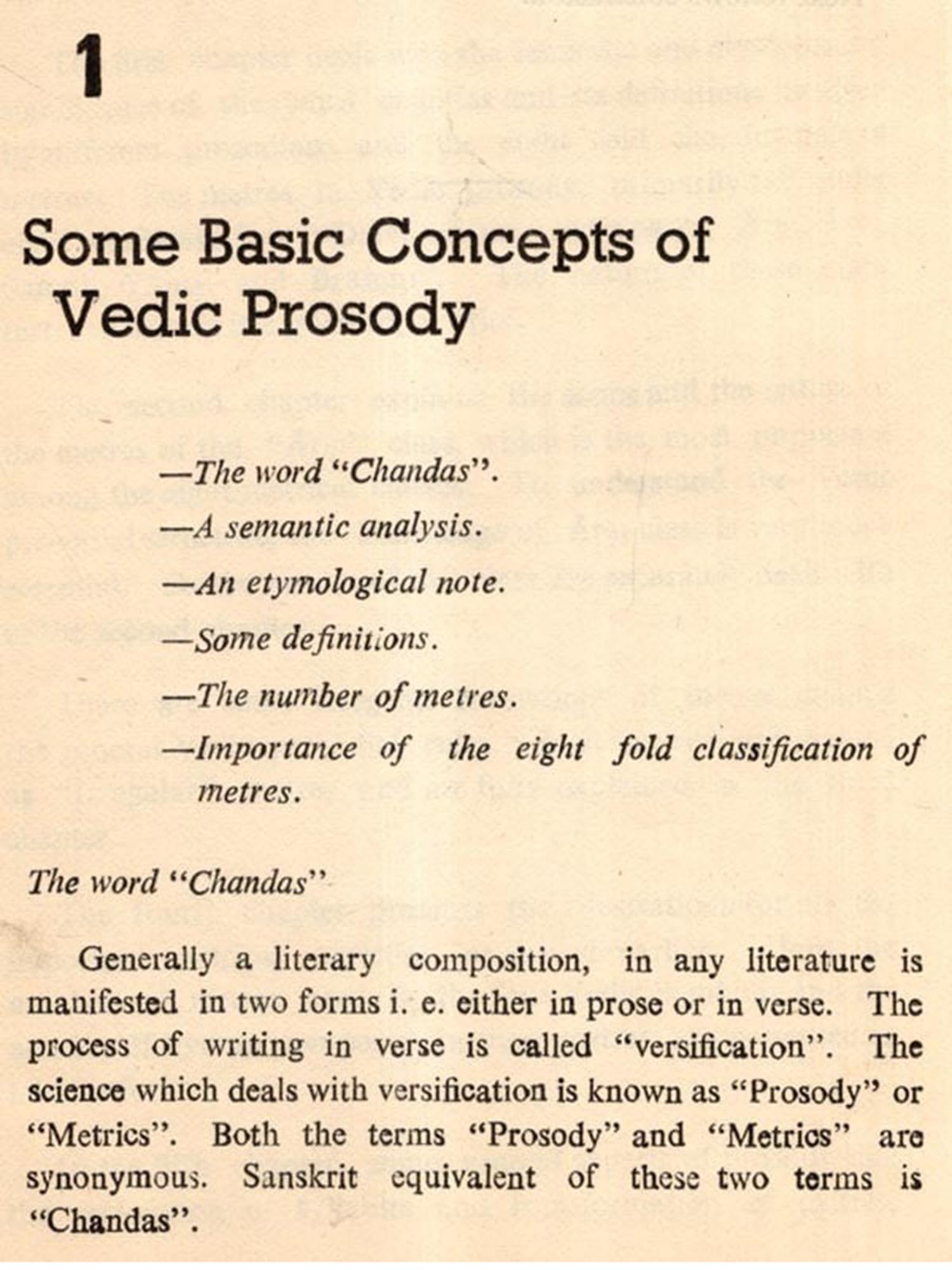 To add dignified rhythm to the sacred injunctions of Vedas, to make noble the thoughts of Smritis, to magnify the verbal structure of the Puranas by adding musical touch, to enrich the charms of expressions of Itihasas by providing them with a novel and melodious order, to assist in portraying a sentiment in kavyas and to serve many such purposes, the most essential element, assistance of which has been taken throughout the literature, is Chandas.