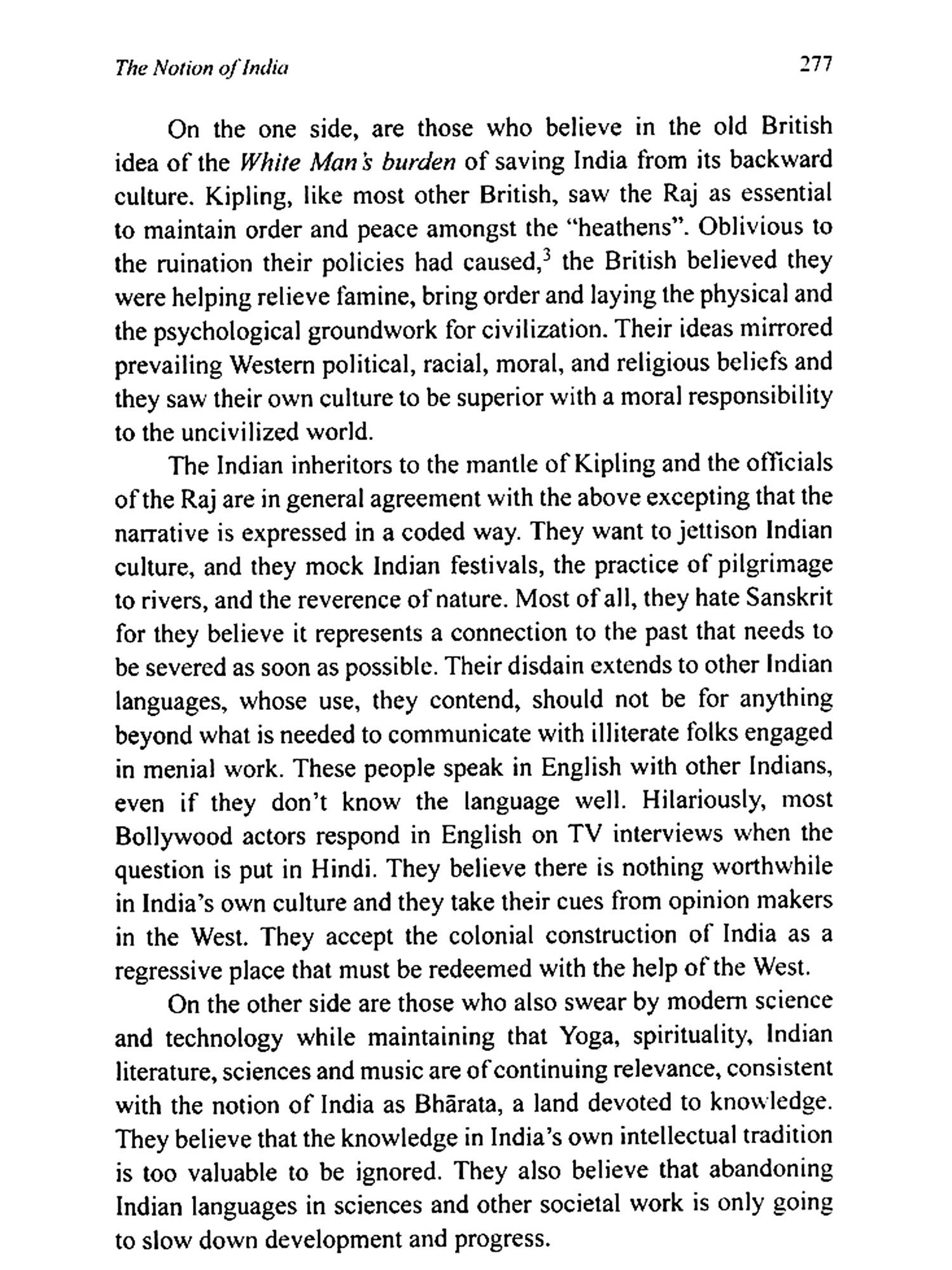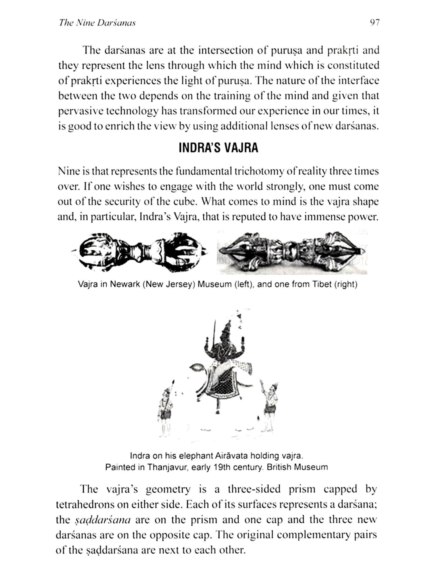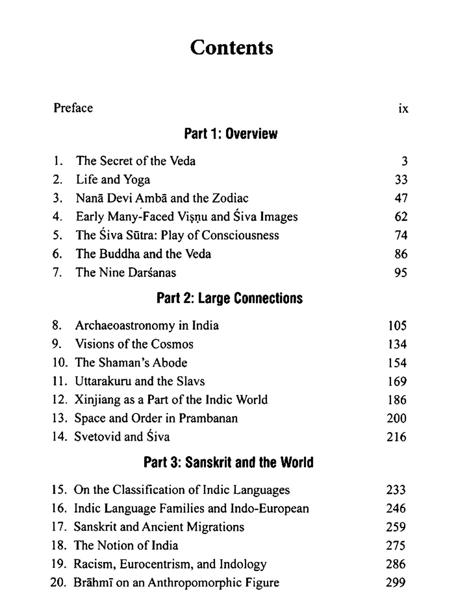 The third part has essays on the Indo-European language family and how it was misused by European scholars to futher nineteenth-century colonial ends. It also has a chapter on the notion of India within the Indian tradition and a reading of Brahmi letters on a figure that has implications for our understanding of the history of Indian writing. The essays of the fourth part are on the notions of space and the design of early temples, the Garbha Upaniṣad, deeper connections between ritual, masks, and sacrifice, and logic in Indian thought. The fifth part begins with an essay on early architecture followed by material on art and cosmology and idea of Panini and Bharata Muni on grammar and art. There is an additional essay on the architecture of the inner cosmos as described by the Sri Cakra.