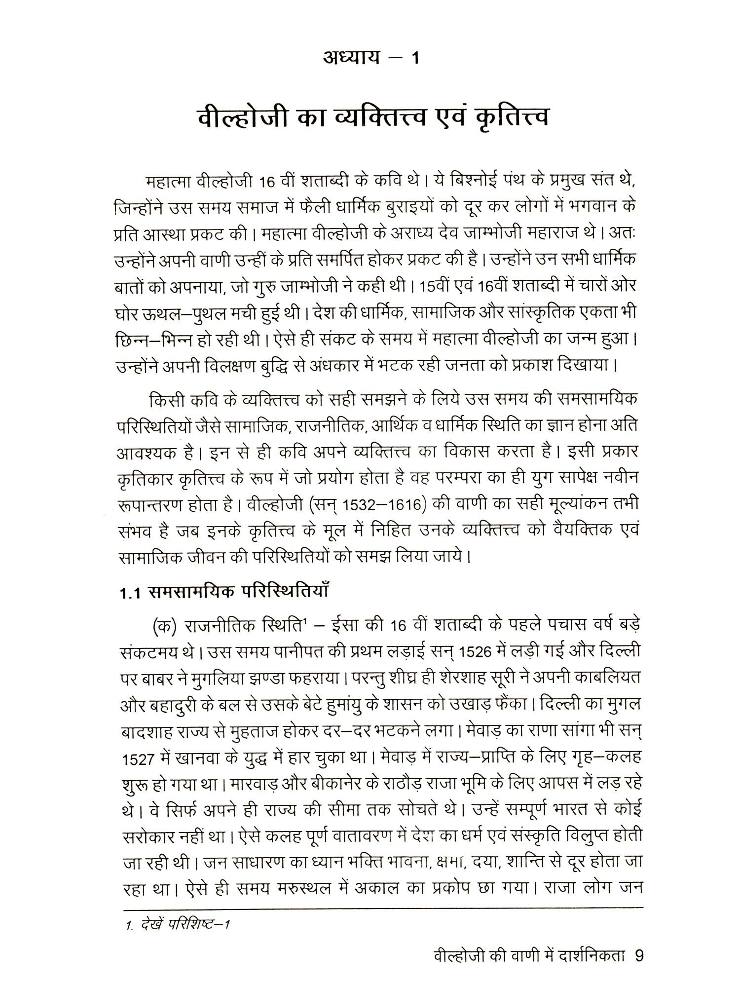 मध्यकालीन सन्त साहित्य में बिश्नोई पंथ के प्रवर्तक गुरु जम्भेश्वर का विशेष स्थान हैं। संतों की सामाजिक परिवर्तन में विशेष भूमिका रही है। जो उपदेश गुरु जम्भेश्वर ने दिये कालान्तर में उनका प्रचार-प्रसार उनके शिष्यों ने किया। श्रुति परम्परा में बिश्नोई सन्तों ने उनकी वाणी को सुरक्षित रखा। गुरु जम्भेश्वर के अन्तर्धान होने के बाद उनकी परम्परा के मुख्य शिष्य वील्होजी ने उनकी शिक्षाओं को आधार मानकर अनेक रचनाऐं की, जिनमें गुरु जम्भेश्वर का चरित्र चित्रण तो है ही, इसके साथ ही हमें इनमें मध्यकालीन भक्ति-साहित्य का प्रवाह भी देखने को मिलता है। एम. फिल. (हिन्दी) में लघु शोध प्रबन्ध लिखने के लिये विषय चयन का प्रश्न जब मेरे सामने उपस्थिति हुआ, तो मेरा ध्यान अनायास ही डॉ. कृष्णलाल बिश्नोई द्वारा लिखित ग्रन्थ 'वील्होजी की वाणी की ओर गया। मैंने सोचा क्यों न इस विषय पर नवीन दृष्टिकोण से लिखा जाए। मेरा जन्म बिश्नोई समाज में होने के कारण मुझे वील्होजी के बारे में प्रारम्भिक जानकारी थी ही, मैंने उनकी साखियों, कथाएँ, हरजस आदि गुरु जम्भेश्वर के जागरण में सुन रखी थी। इसका एक दूसरा कारण यह भी रहा कि वील्होजी का जन्म स्थान रेवाड़ी (हरियाणा) था, परन्तु उनका कर्म क्षेत्र मारवाड़ रहा। यह कैसी विडंबना रही कि ऐसे सन्त पुरुष की वाणी से हम हरियाणा वासी अनभिज्ञ ही रहे। मैंने सोचा क्यों न इस लघु शोध द्वारा मानव मात्र को उनकी वाणी में दार्शनिक तत्त्व का परिचय करवाया जाए। विषय के चयन के सम्बन्ध में जब मेरी बात डॉ. बाबूराम, प्राध्यापक, हिन्दी-विभाग, कुरुक्षेत्र विश्वविद्यालय, हरिणाया से हुई, तो उन्हें भी यह नवीन विषय बहुत पसन्द आया। उनके कुशल निर्देशन में इस लघु शोध प्रबन्ध का कार्य सन् 2000 में सम्पन्न हुआ। जिसके लिए मैं उनका आभार व्यक्त करती हूँ। इसे पुस्तक रूप में प्रकाशित करने की योजना डॉ. कृष्ण लाल विश्नोई की रही है। इस कार्य में उनका दिशा निर्देश हमे समय-समय पर मिलता रहा है। शोध कार्य को वैज्ञानिक एवं व्यवस्थित रूप देने के लिये प्रस्तुत लघु शोध प्रबन्ध को पांच अध्यायों में विभाजित किया गया है।