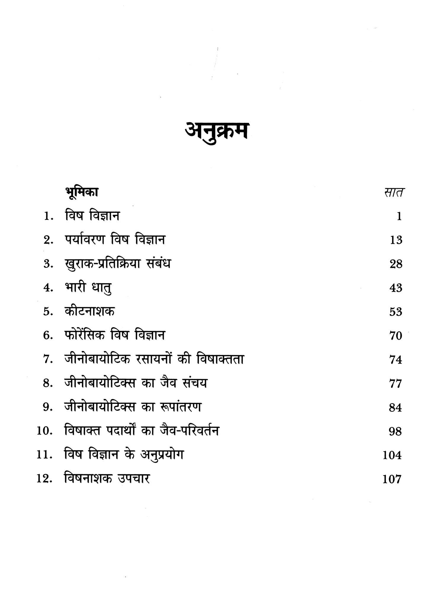 विष विज्ञान एक अंतःविषय है। इसके लिए कई क्षेत्रों के ज्ञान की आवश्यकता होती है। इस पुस्तक में विष विज्ञान का प्रारंभिक स्तर का ज्ञान समाहित किया गया है, जो धीरे-धीरे सभी ज्ञात जहरीले पदार्थों के भौतिक और रासायनिक अध्ययन पर व्यापक जानकारी विकसित करती है। यह पुस्तक आम पाठकों को ध्यान में रखकर लिखी गई है। अतः आशा है कि यह पुस्तक पाठकों का ज्ञानवर्द्धन करने के साथ-साथ उन्हें अवश्य पसंद आएगी।