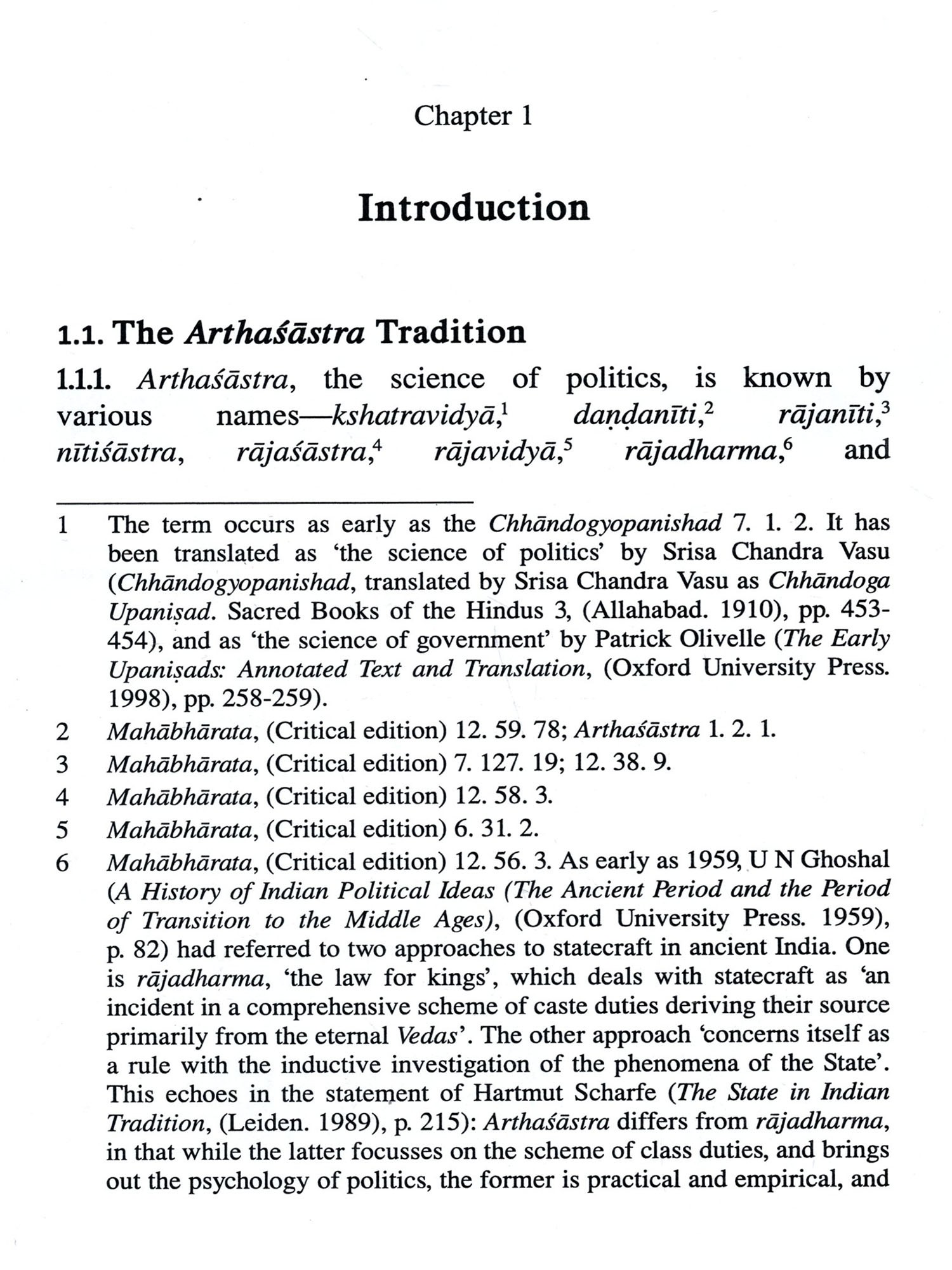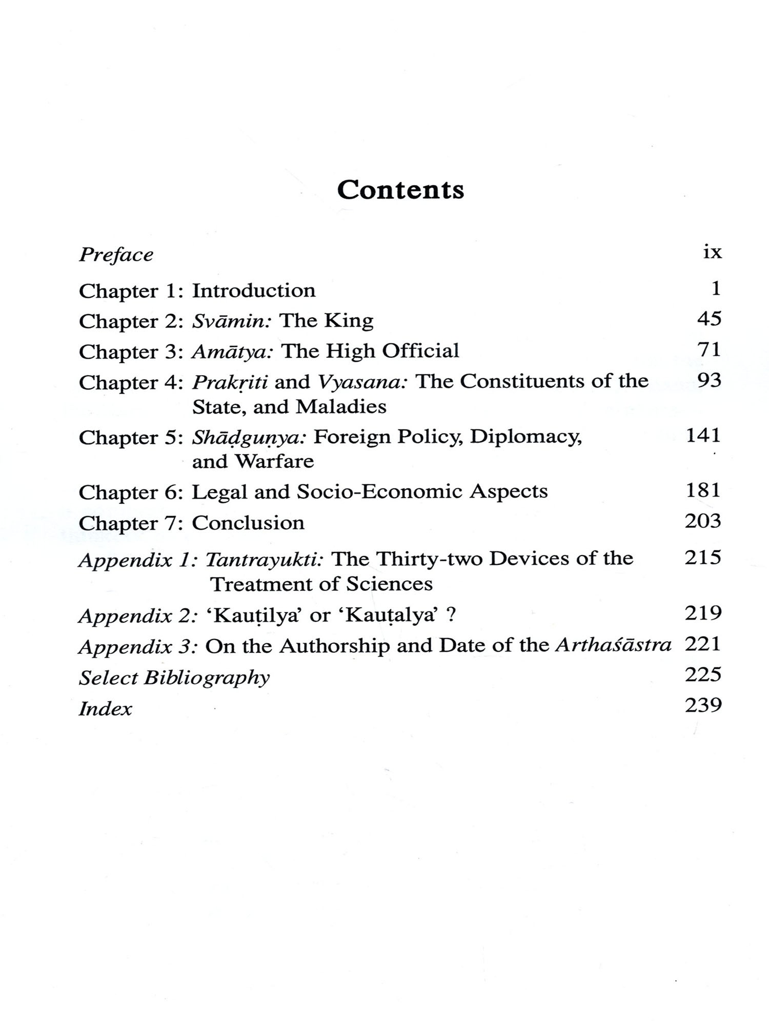 The work is divided into seven chapters. Chapter 1 is Introduction, and consists of five sections: 1.1-The Arthasastra Tradition; 1.2-Pre-Kautilya Thinkers; 1.3-Chronological Order of Pre-Kautilya Thinkers; 1.4 A Note on Acharyah; and 1.5-Enumeration of Vidyas. Chapter 2 is concerned with Svamin: The King, and comprises four sections: 2.1-Relative Merits of Different Types of Rulership; 2.2-Manner in which Danda should be Inflicted by the King; 2.3-Relative Importance of Mantrasakti, Utsahasakti, and Prabhavasakti, and of Sakti, Desa, and Kala; and 2.4-Prince as Potential Danger to the King. Chapter 3 deals with Amatya: The High Official, and has four sections: 3.1-Appointment of Amatyas; 3.2-Upadha: The Secret Tests; 3.3-Mantra (Counsel), and the Maintenance of the Secrecy of Counsel; and 3.4-Actions Recommended for the Amatya, when a Calamity Afflicts the King.