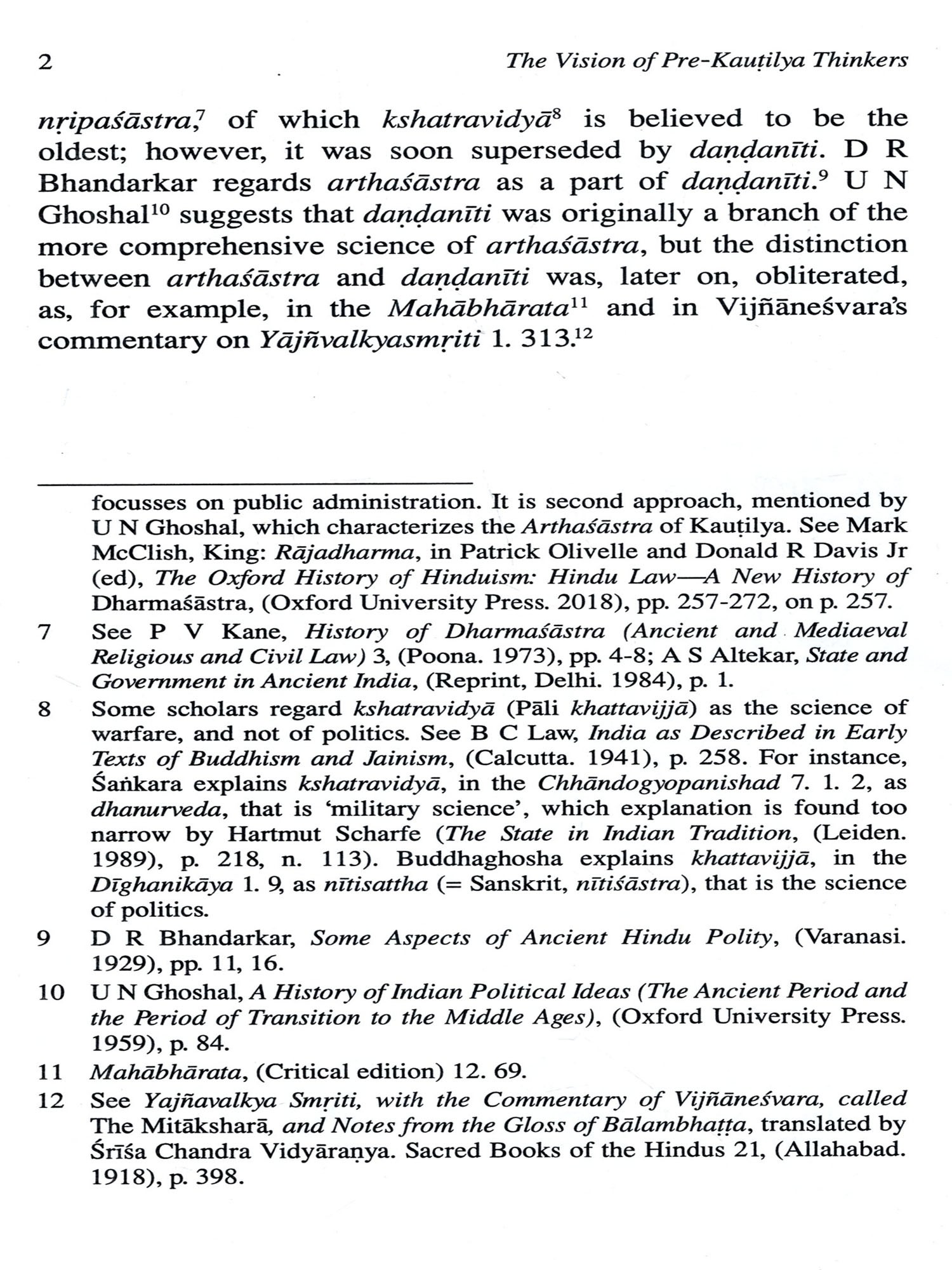 6 Mahabharata, (Critical edition) 12. 56. 3. As early as 1959, UN Ghoshal (A History of Indian Political Ideas (The Ancient Period and the Period of Transition to the Middle Ages), (Oxford University Press. 1959), p. 82) had referred to two approaches to statecraft in ancient India. One is rajadharma, 'the law for kings', which deals with statecraft as 'an incident in a comprehensive scheme of caste duties deriving their source primarily from the eternal Vedas'. The other approach 'concerns itself as a rule with the inductive investigation of the phenomena of the State'. This echoes in the statement of Hartmut Scharfe (The State in Indian Tradition, (Leiden. 1989), p. 215): Arthasastra differs from rajadharma, in that while the latter focusses on the scheme of class duties, and brings out the psychology of politics, the former is practical and empirical, and nripasastra, of which kshatravidya is believed to be the oldest; however, it was soon superseded by dandaniti. D R Bhandarkar regards arthasastra as a part of dandaniti. U N Ghoshalt suggests that dandanīti was originally a branch of the more comprehensive science of arthasastra, but the distinction between arthasastra and dandaniti was, later on, obliterated, as, for example, in the Mahabharata and in Vijnanesvara's commentary on Yajnvalkyasmriti 1. 313.12