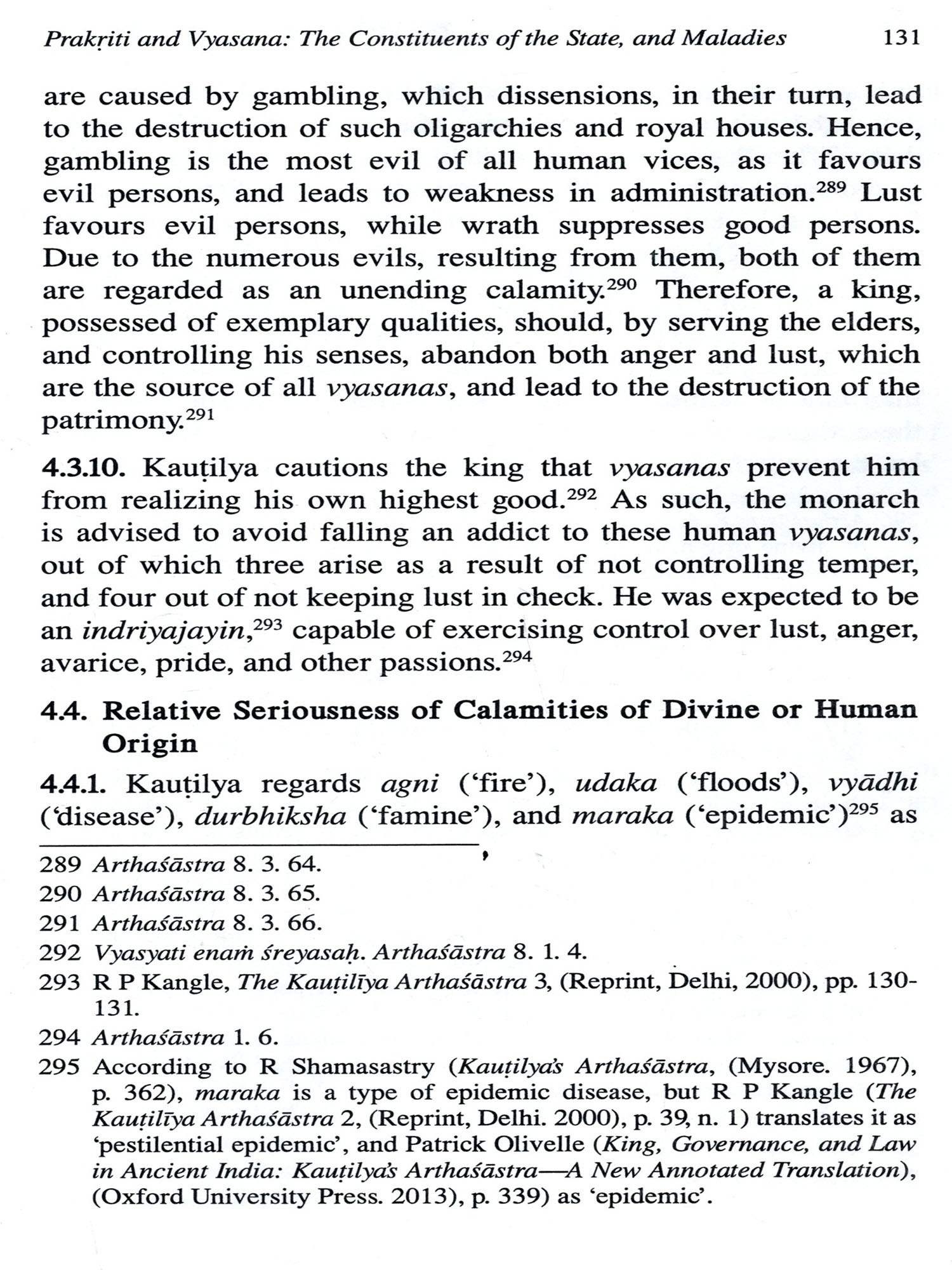 Chapter 4 has Prakriti and Vyasana: The Constituents of the State, and Maladies as its subject, and consists of four sections: 4.1-Saptanga: The Seven Prakritis or Constituent Elements of the State; 4.2-Relative Seriousness of the Vyasanas of the Seven Prakritis; 4.3-The Two Groups of Human Vices, and 4.4 Relative Seriousness of Calamities of Divine or Human Origin. Shadgunya: Foreign Policy, Diplomacy, and Warfare are dealt with in Chapter 5, which consists of seven sections: 5.1-Shadgunya: The Six Measures of Foreign Policy; 5.2-Types of Allies More Advantageous to Secure; 5.3-Choice between Diplomatic Moves and Actual Warfare; 5.4 Occasion for Marching against the Enemy; 5.5-Types of Enemies, against whom it is More Advantageous to March; 5.6-Options Available to a Weaker King, when Threatened by a Stronger King; and 5.7-Battle Formations.