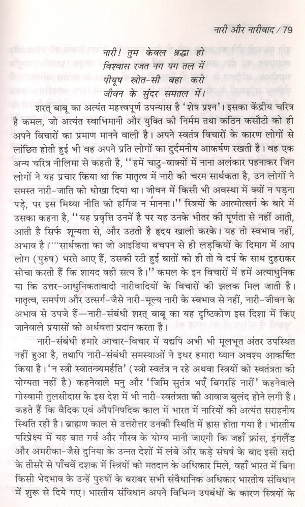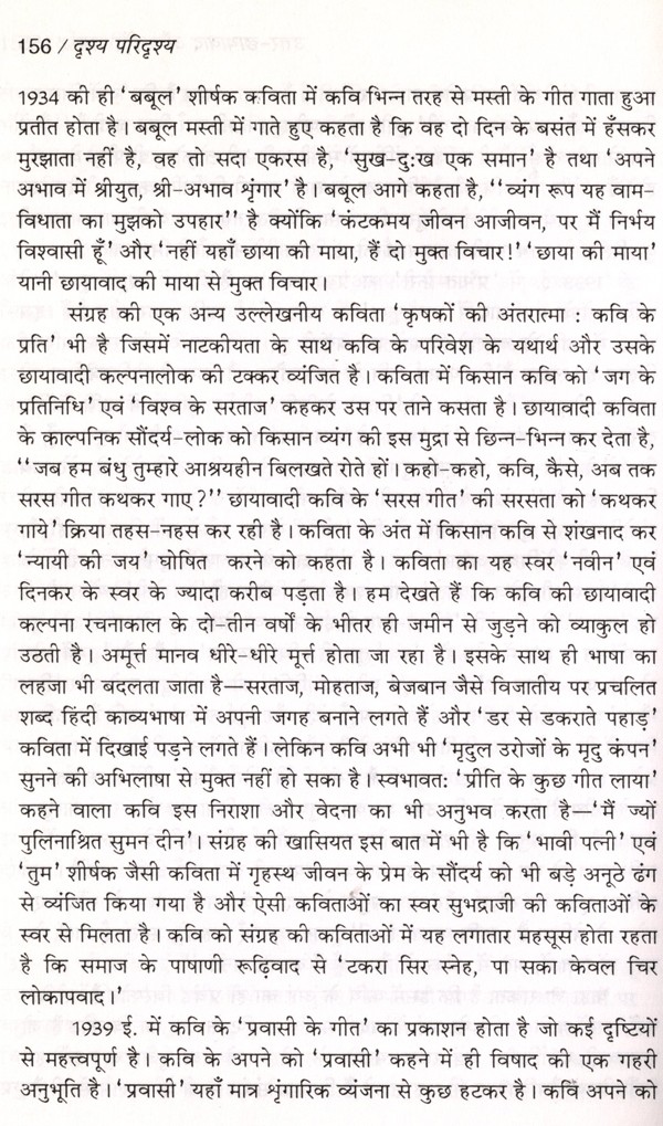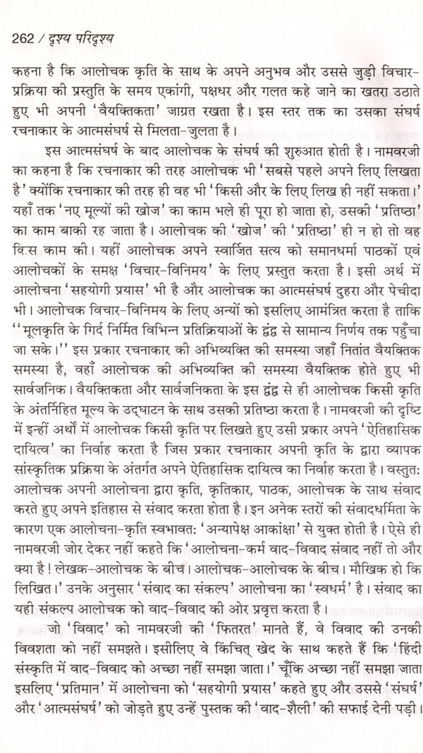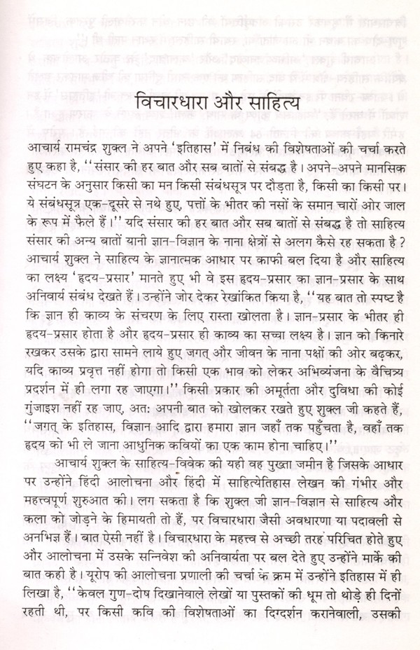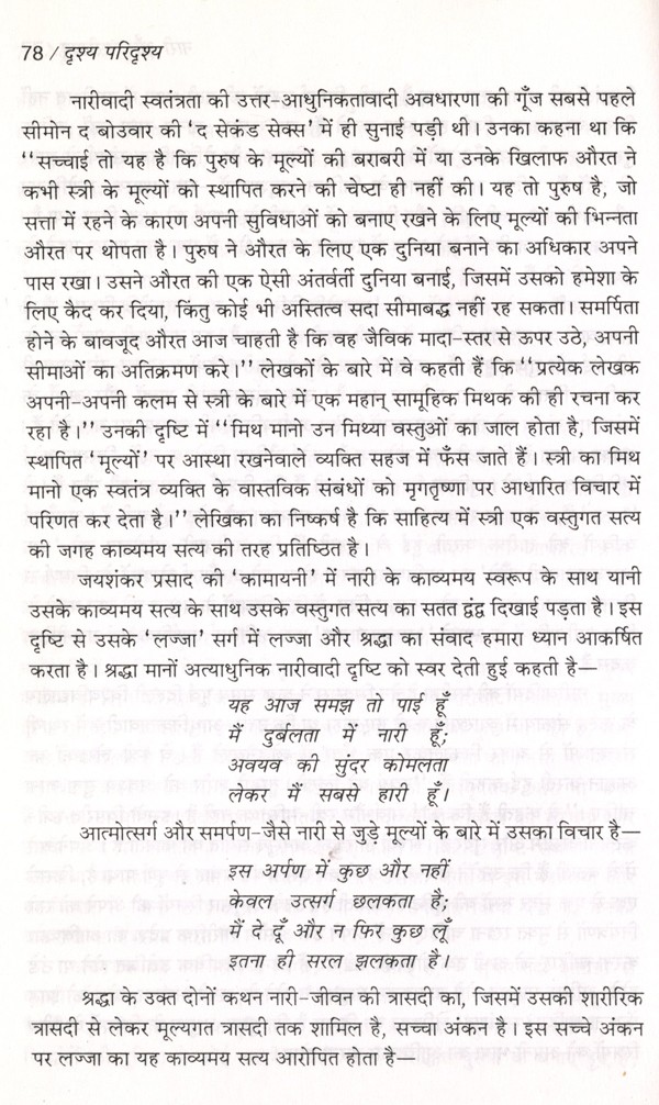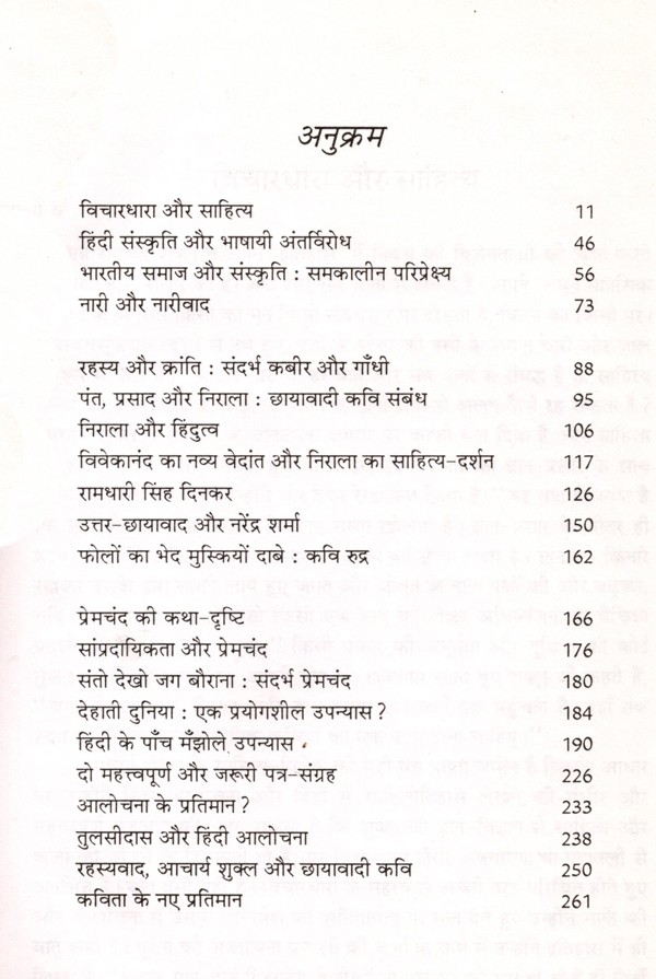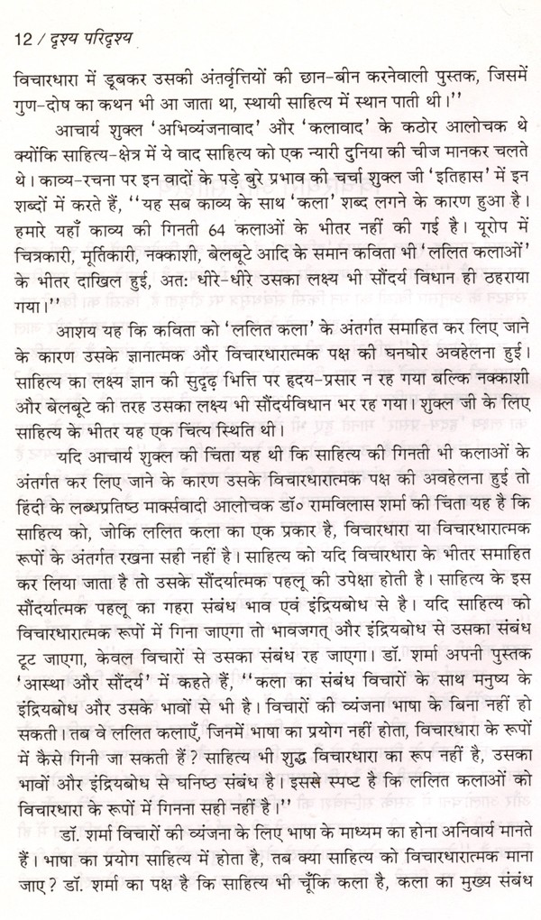 विभिन्न अवसरों पर लिखे गए और विभिन्न पत्र-पत्रिकाओं में प्रकाशित और कुछ पहली बार प्रकाशित आलोचनात्मक लेखों के इस संग्रह में शुरू के चार लेख जहाँ साहित्य के 'परिदृश्य' से संबंधित हैं, वहीं बाकी सामग्री का संबंध प्रत्यक्षतः 'दृश्य' यानी साहित्य से है। विचारधारा के अंत की घोषणा और विचारधाराहीनता की विचारधारा के इस दौर में साहित्य और विचारधारा के संबंध पर पुनर्विचार किये जाने की जरूरत की समझदारी के तहत ही 'विचारधारा और साहित्य' नामक किंचित् दीर्घ और शोधात्मक लेख यहाँ शामिल किया गया है। परिदृश्य पक्ष से जुड़ा दूसरा लेख हिंदी संस्कृति संबंधी बहसों से जुड़ा है। 'नारी और नारीवाद' नामक लेख भी इस संबंध में चली बहसों का नतीजा है। पिछले दिनों संस्कृति और भारतीय संस्कृति भी चर्चा का विषय रही है। 'भारतीय समाज और संस्कृति समकालीन परिप्रेक्ष्य' इसी संदर्भ से उपजा लेख है जो पाँच पुस्तकों की समीक्षा के बहाने लिखा गया है। 'दृश्य' से संबंधित लेखों और टिप्पणियों में से कुछेक के संबंध जहाँ समकालीन वहसों से हैं, वहीं कुछ का संबंध किसी कृतिकार या कृति पर समग्रता से नये सिरे से विचार किए जाने से है। 'रहस्य और क्रांति संदर्भ कबीर और गाँधी' और 'निराला और हिंदुत्व' जहाँ पहली श्रेणी के लेख माने जा सकते हैं, वहीं कवि दिनकर और नरेंद्र शर्मा से जुड़े लेख दूसरी कोटि में रखे जा सकते हैं। वस्तुतः किसी उपयुक्त नाम के अभाव में इन्हें उत्तर-छायावाद का कवि माना जाता है।