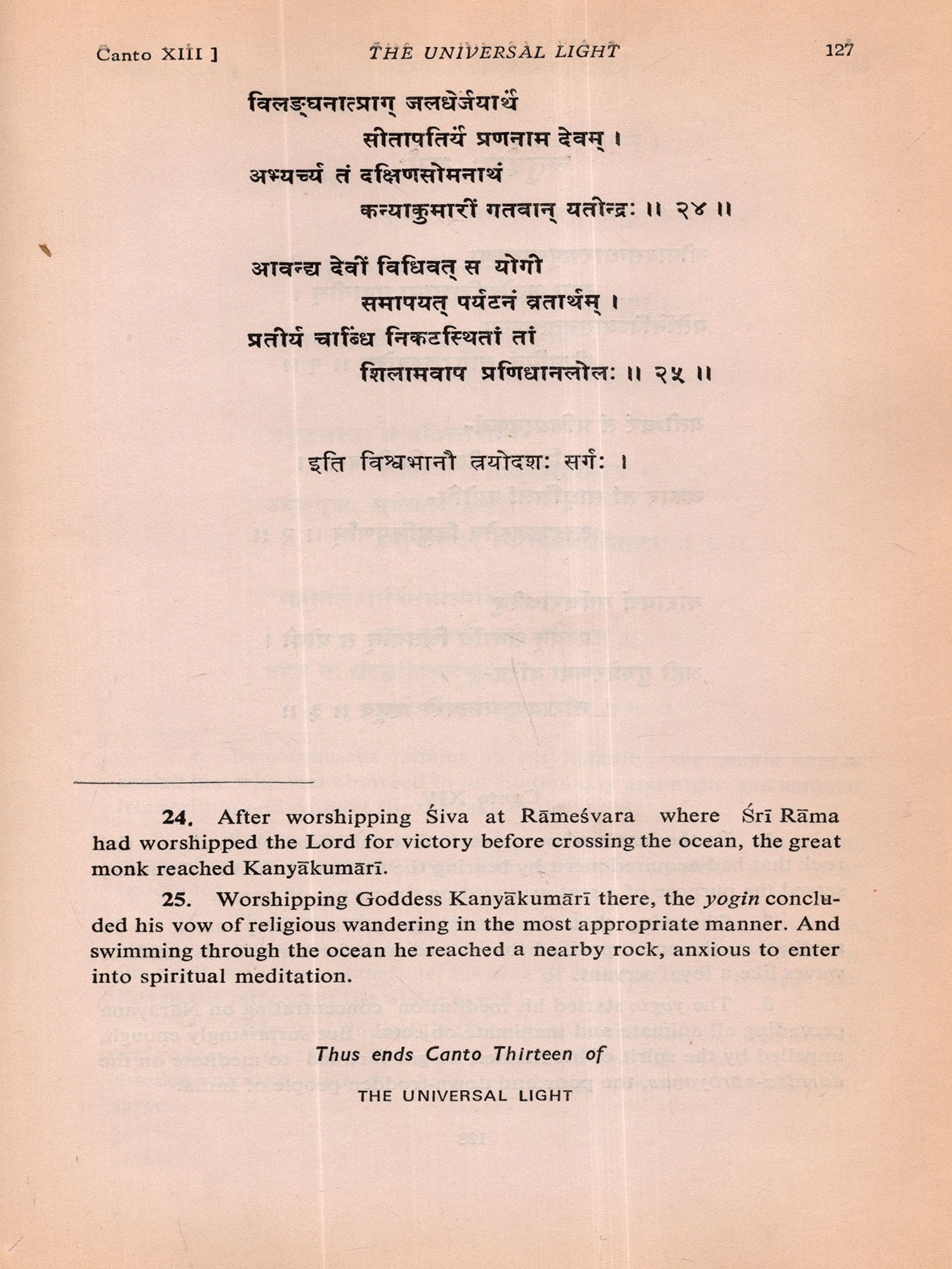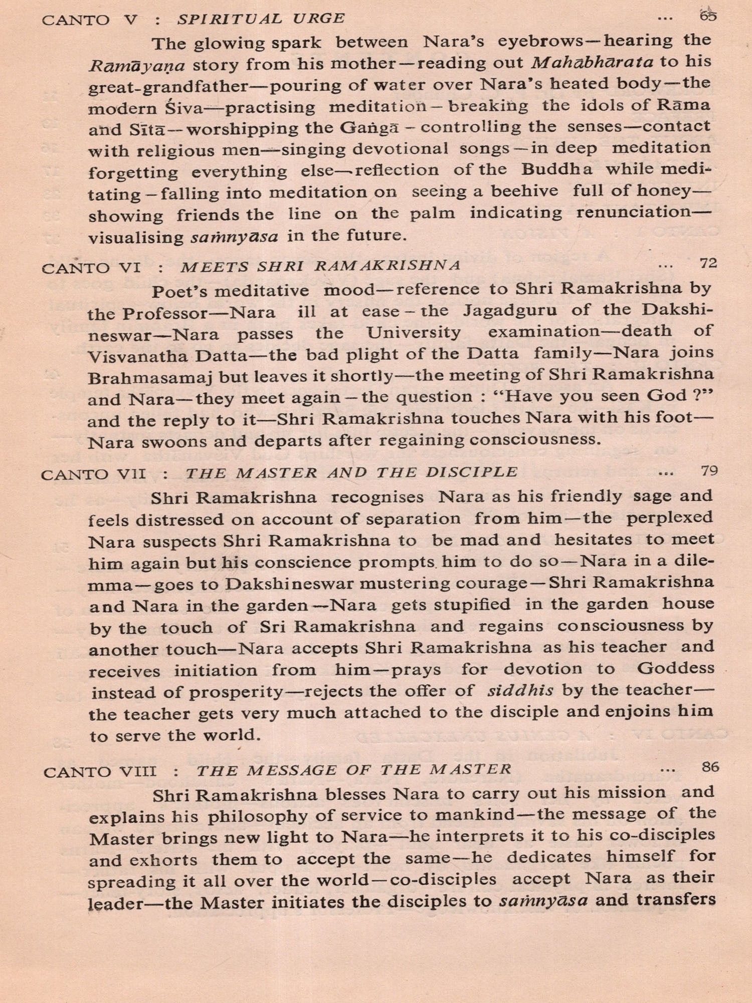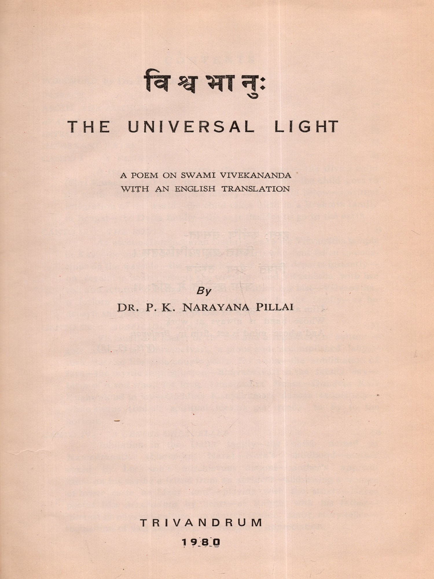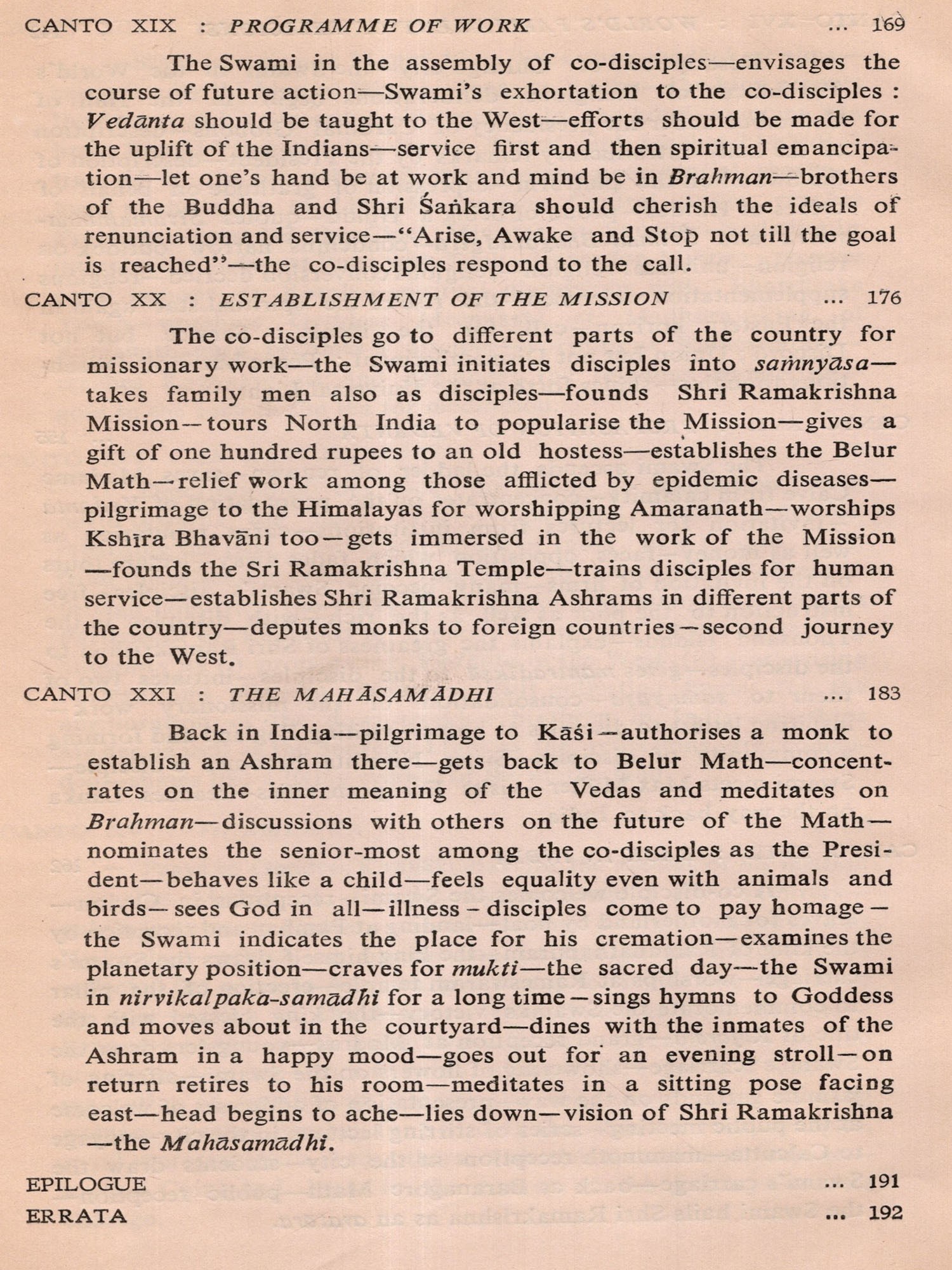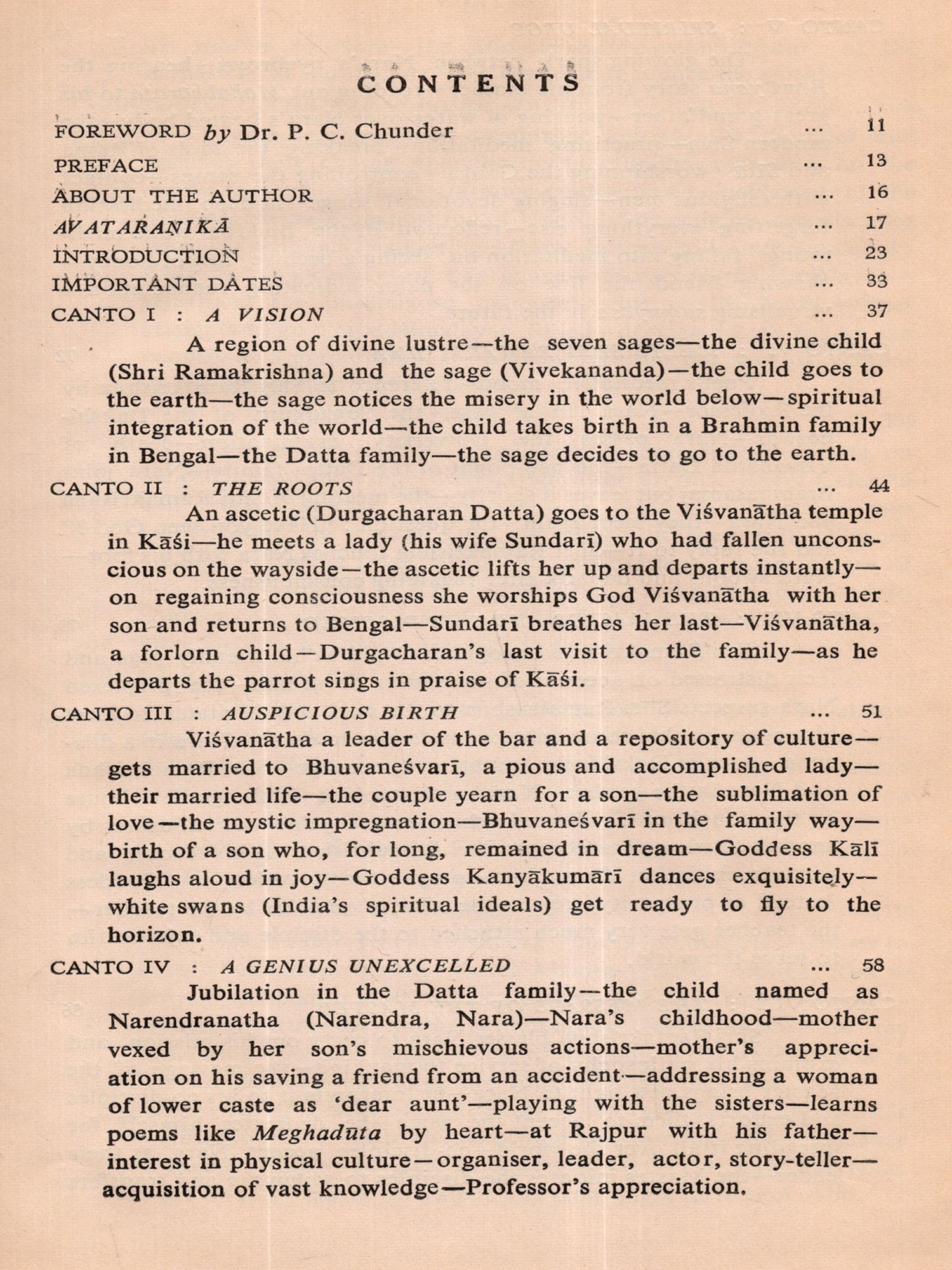 Within a few days after its commencement I almost completed the First Canto of the poem. But my mind began to waver whether I should continue the composition or not. I was not sure whether I would be able to do justice to this sacred theme and recreate the solemn personality of Swami Vivekananda in Sanskrit metre. While I was in this wavering mood I received information that His Holiness Swami Vimalananda Ji Maharaj had come down from Uttara Kaśi for a short stay at Trivandrum. I welcomed this as a godsend and decided to seek the advice of that great Samnyasin of sharp literary perception. The dizzy heights in spiritual realm he has risen to are beyond me either to comprehend or to describe. He is a consummate scholar in Indian thought, an authority on Ramakrishna-Vivekananda literature and also a biographer of Swami Vivekananda. Hence I presented the initial pages of my manuscript to Swami Ji for the favour of perusal, with the firm conviction and faith that he would help me with his dispassionate and enlightened judgement. By that time, I had through the manuscript, Swami Ji graciously blessed me and desired me completed three cantos in spite of my wavering mood. After going to continue and complete the poem. He was also pleased to scrutinise the entire manuscript which I completed on April 4, 1976 and to write a learned and analytical Introduction to the poem at my request. I offer my reverent and grateful prasamas to him for all the kindness and affection he was pleased to shower on me. Here, I also recall with gratitude the encouragement I received in composing this poem at the hands of the late Swami Anantatmananda, President, Shri Ramakrishna Ashram, Trivandrum.