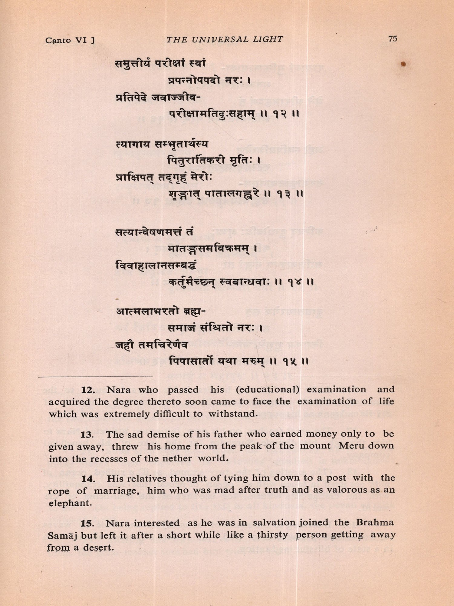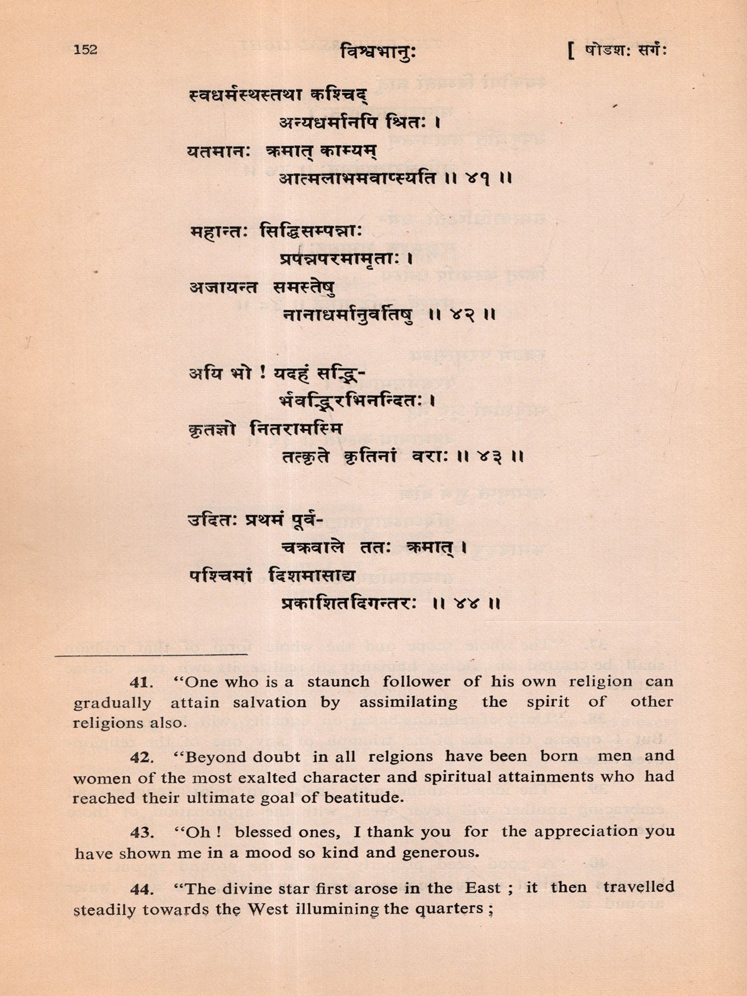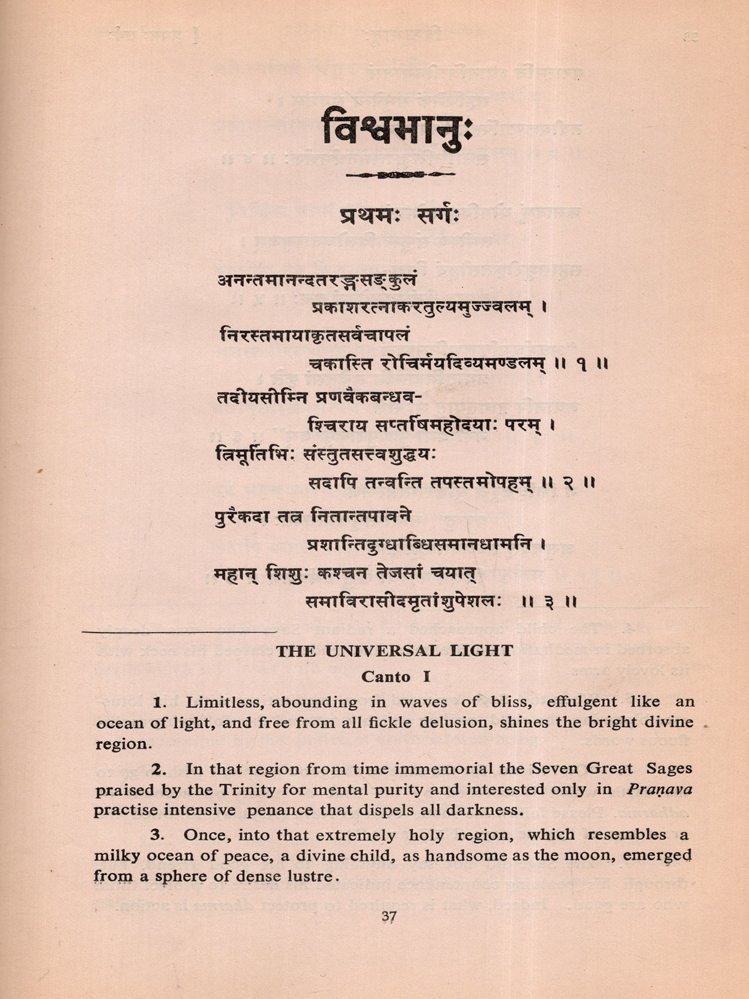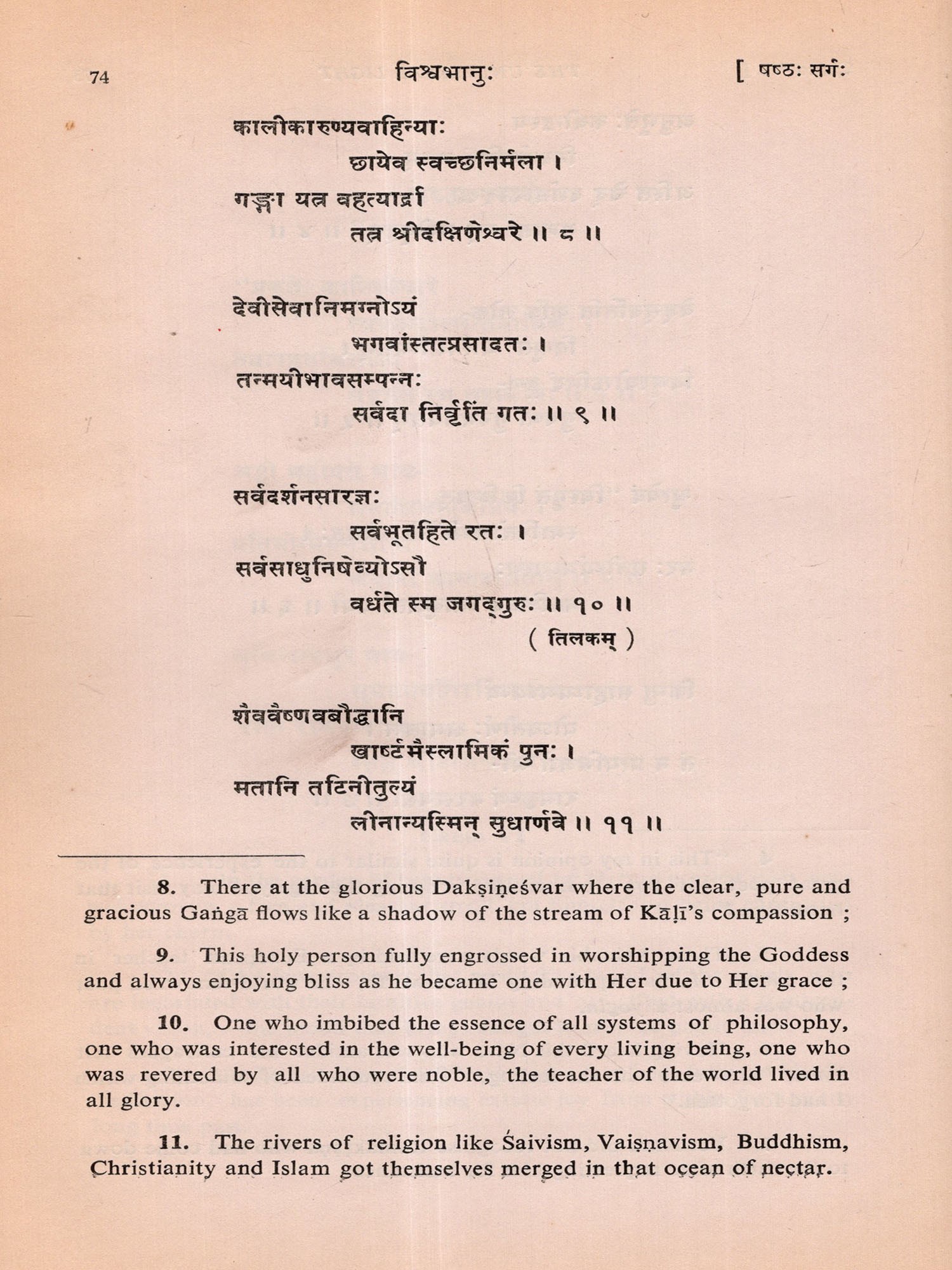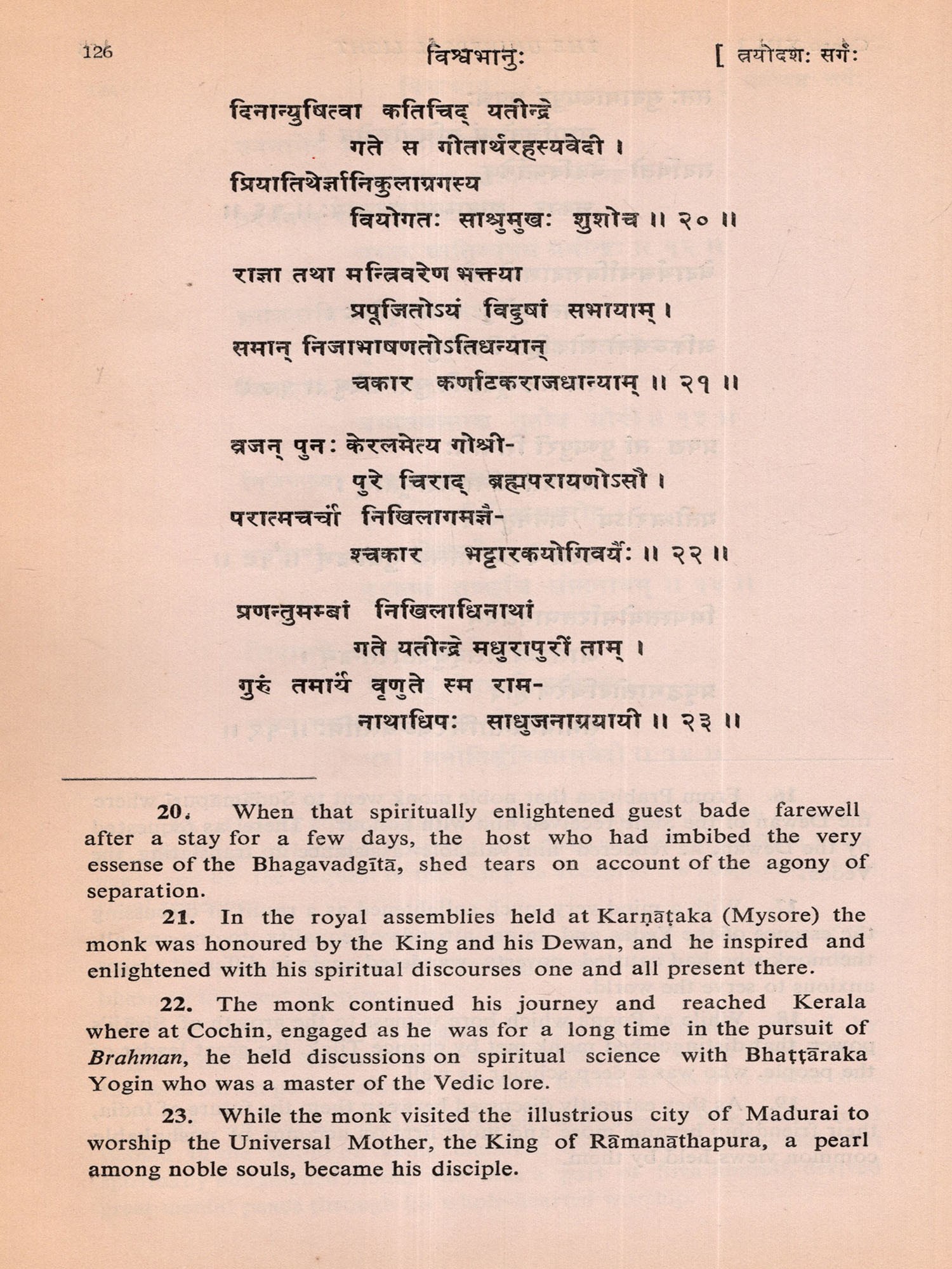 Within a few days after its commencement I almost completed the First Canto of the poem. But my mind began to waver whether I should continue the composition or not. I was not sure whether I would be able to do justice to this sacred theme and recreate the solemn personality of Swami Vivekananda in Sanskrit metre. While I was in this wavering mood I received information that His Holiness Swami Vimalananda Ji Maharaj had come down from Uttara Kaśi for a short stay at Trivandrum. I welcomed this as a godsend and decided to seek the advice of that great Samnyasin of sharp literary perception. The dizzy heights in spiritual realm he has risen to are beyond me either to comprehend or to describe. He is a consummate scholar in Indian thought, an authority on Ramakrishna-Vivekananda literature and also a biographer of Swami Vivekananda. Hence I presented the initial pages of my manuscript to Swami Ji for the favour of perusal, with the firm conviction and faith that he would help me with his dispassionate and enlightened judgement. By that time, I had through the manuscript, Swami Ji graciously blessed me and desired me completed three cantos in spite of my wavering mood. After going to continue and complete the poem. He was also pleased to scrutinise the entire manuscript which I completed on April 4, 1976 and to write a learned and analytical Introduction to the poem at my request. I offer my reverent and grateful prasamas to him for all the kindness and affection he was pleased to shower on me. Here, I also recall with gratitude the encouragement I received in composing this poem at the hands of the late Swami Anantatmananda, President, Shri Ramakrishna Ashram, Trivandrum.