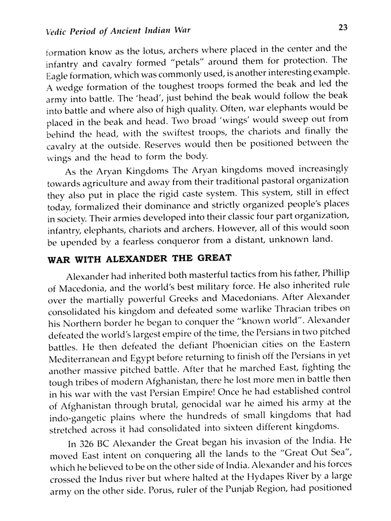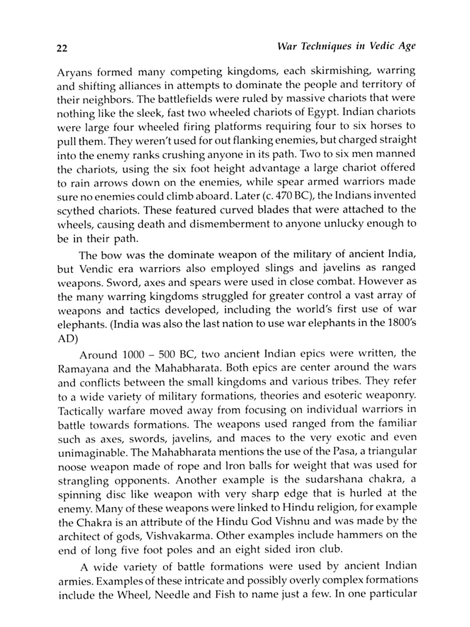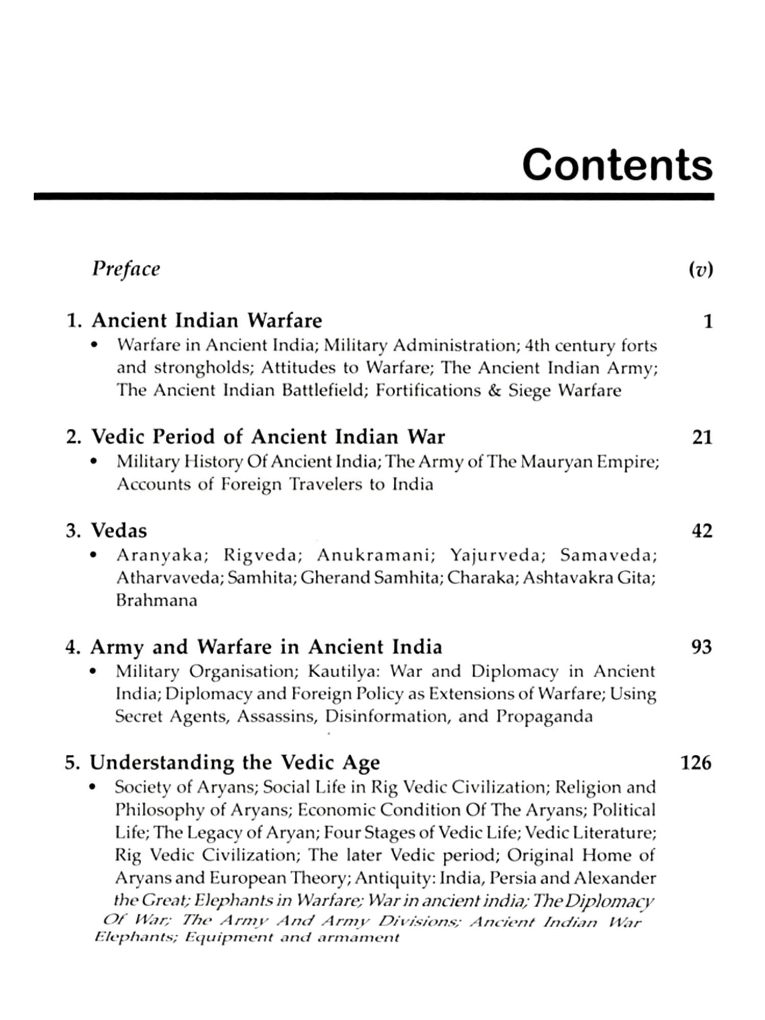 The Rgveda is dedicated to Indra, the God of War, and one-fourth of the hymns eulogize his heroic deeds. A hymn in the Atharvaveda reads "Oh braves! Rise with your standard and be prepared, for your enemies are like killer serpents. They are devils. Subjugate them.... Oh braves! Destroy your enemies and kill their Commander with your army." This work discusses the wars fought in ancient India and the war strategies that came to be developed. Advanced modes of combat were devised and new methods related to the use of various weapons were perfected. The army was composed of four arms (chaturanga)-infantry, cavalry, chariots and elephants. They were all deployed in the field of battle in formation (vyuha), as decided by the commanders, based on factors such as the nature of the terrain and the composition of one's and one's enemy's forces. Great concern was shown to the training of men and animals. The kings and princes were well-trained in the arts of war and leadership, personally led armies and participated in the defence of forts. The History of India begins with the Indus Valley Civilization and the coming of the Aryans. These two phases are generally described as the pre-Vedic and Vedic periods. The earliest literary source that sheds light on India's past is the Rig Veda. It is difficult to date this work with any accuracy on the basis of tradition and ambiguous astronomical information contained in the hymns. It is most likely that Rig Veda was composed between 1,500 B.C. and 1,000 B.C. In the fifth century, large parts of India were united under Ashoka. Strategies were both defensive and offensive. The ancient Indian thinkers insisted on war as a means for increasing royal glory and outright conquest. Offensive strategies were thus devised which could allow the conqueror's army to traverse large distances and either overawe the adversary into submission, or to defeat him on the battlefield if he chose it that way. Different armies would be stationed in different directions to deal with enemies in the concerned area From India, military thinking on the use of war elephants spread westwards between Europeans and the Persian war elephants occurred at the Alexander's came to influence the campaigns of Alexander the Great. The first confrontation Battle of Gaugamela (331 BCE), where the Persians deployed fifteen elephants These elephants were placed at the centre of the Persian line and made such an impression on the Macedonian troops that Alexander felt the need to sacrifice to the God of Fear the night before the battle-but according to some sources the elephants ultimately failed to deploy in the final battle owing to their long march the day before. Alexander won resoundingly at Gaugamela, but was deeply impressed by the enemy elephants and took these first fifteen into his own army, adding to their number during his capture of the rest of Persia. The exponents of Vedas were happy and enthusiastic persons. They are called Aryas. They laid down norms to lead our personal life, social life, national life and the world as a whole. These norms are contained in 20, 516 verses in four Vedas ie. Rig-Veda, Atharveda, Yajurveda and Samaveda. The four Vedas have mostly common subjects and special subjects like Rig-Veda deals with prayers, science and nature; Yajurveda Karma (work) and society, Samaveda system of prayer and music and Atharveda the system of treatment and knowledge of money. The four Vedas are like Sun giving light to live and to lead a happy and prosperous life. This book traces the evolution of India's military tactics and strategy uring the ancient period and till the eleventh century ad by examining available ources from a dispassionate, professional military perspective.