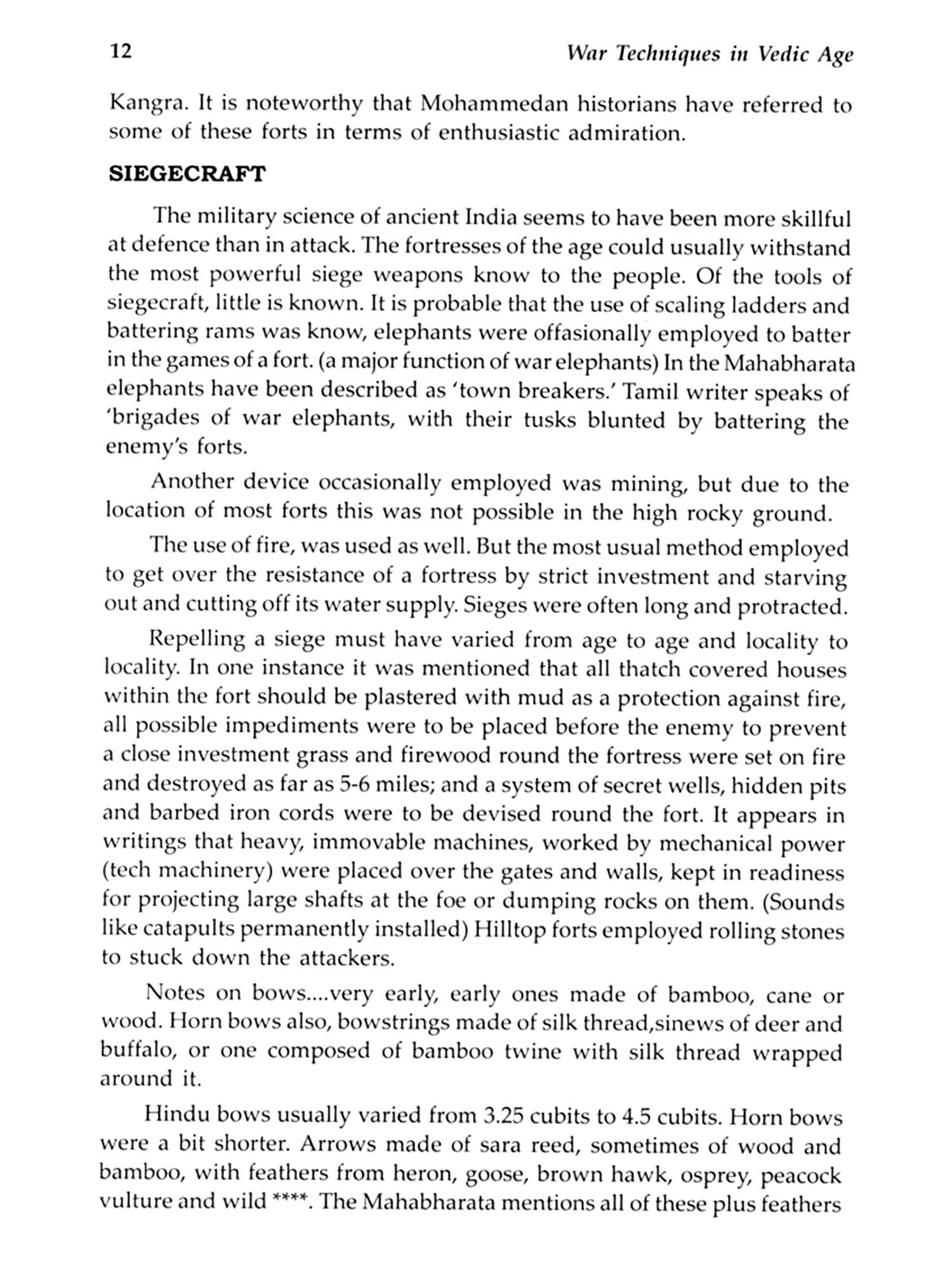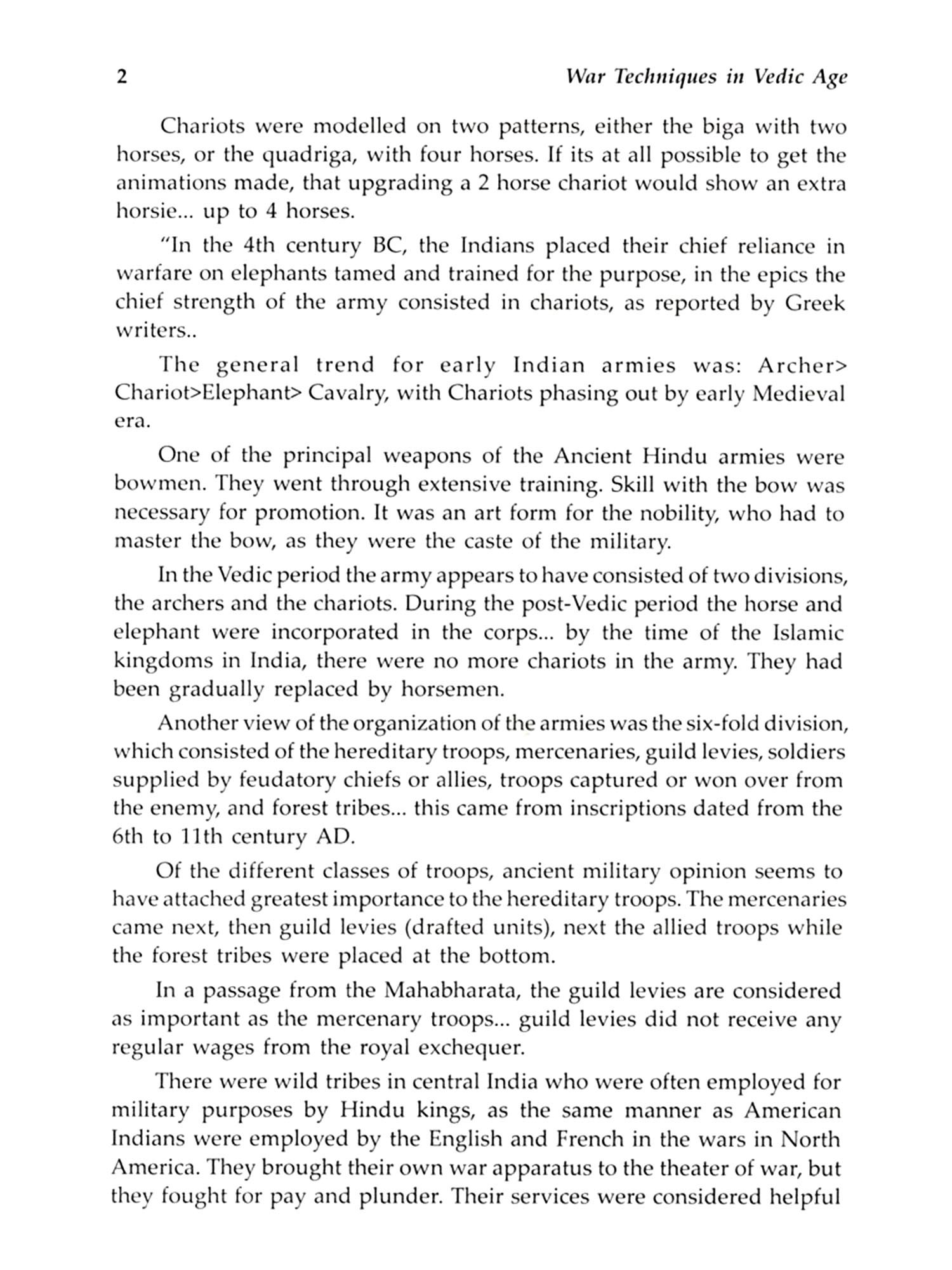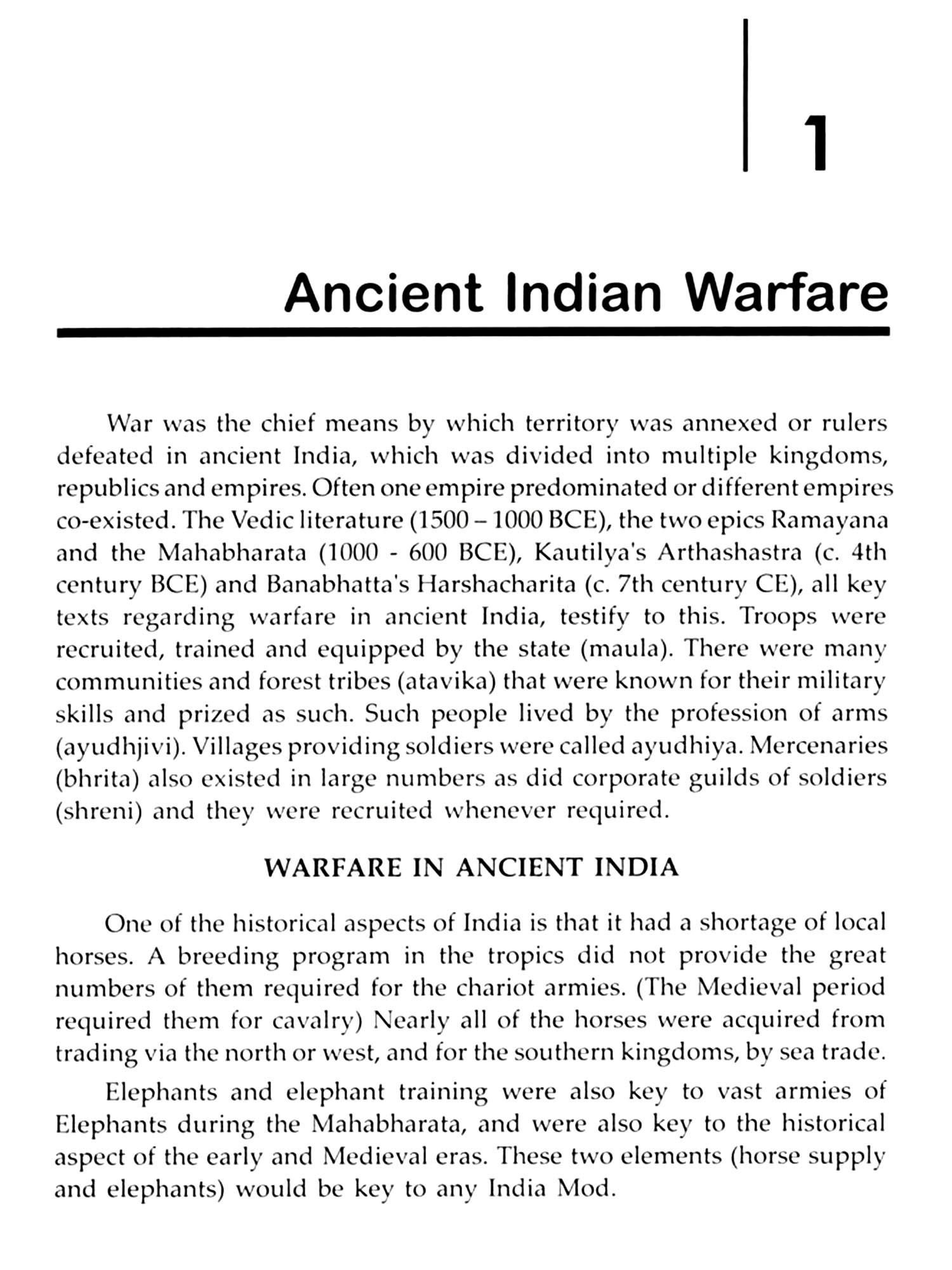 The Rgveda is dedicated to Indra, the God of War, and one-fourth of the hymns eulogize his heroic deeds. A hymn in the Atharvaveda reads "Oh braves! Rise with your standard and be prepared, for your enemies are like killer serpents. They are devils. Subjugate them.... Oh braves! Destroy your enemies and kill their Commander with your army." This work discusses the wars fought in ancient India and the war strategies that came to be developed. Advanced modes of combat were devised and new methods related to the use of various weapons were perfected. The army was composed of four arms (chaturanga)-infantry, cavalry, chariots and elephants. They were all deployed in the field of battle in formation (vyuha), as decided by the commanders, based on factors such as the nature of the terrain and the composition of one's and one's enemy's forces. Great concern was shown to the training of men and animals. The kings and princes were well-trained in the arts of war and leadership, personally led armies and participated in the defence of forts. The History of India begins with the Indus Valley Civilization and the coming of the Aryans. These two phases are generally described as the pre-Vedic and Vedic periods. The earliest literary source that sheds light on India's past is the Rig Veda. It is difficult to date this work with any accuracy on the basis of tradition and ambiguous astronomical information contained in the hymns. It is most likely that Rig Veda was composed between 1,500 B.C. and 1,000 B.C. In the fifth century, large parts of India were united under Ashoka. Strategies were both defensive and offensive. The ancient Indian thinkers insisted on war as a means for increasing royal glory and outright conquest. Offensive strategies were thus devised which could allow the conqueror's army to traverse large distances and either overawe the adversary into submission, or to defeat him on the battlefield if he chose it that way. Different armies would be stationed in different directions to deal with enemies in the concerned area From India, military thinking on the use of war elephants spread westwards between Europeans and the Persian war elephants occurred at the Alexander's came to influence the campaigns of Alexander the Great. The first confrontation Battle of Gaugamela (331 BCE), where the Persians deployed fifteen elephants These elephants were placed at the centre of the Persian line and made such an impression on the Macedonian troops that Alexander felt the need to sacrifice to the God of Fear the night before the battle-but according to some sources the elephants ultimately failed to deploy in the final battle owing to their long march the day before. Alexander won resoundingly at Gaugamela, but was deeply impressed by the enemy elephants and took these first fifteen into his own army, adding to their number during his capture of the rest of Persia. The exponents of Vedas were happy and enthusiastic persons. They are called Aryas. They laid down norms to lead our personal life, social life, national life and the world as a whole. These norms are contained in 20, 516 verses in four Vedas ie. Rig-Veda, Atharveda, Yajurveda and Samaveda. The four Vedas have mostly common subjects and special subjects like Rig-Veda deals with prayers, science and nature; Yajurveda Karma (work) and society, Samaveda system of prayer and music and Atharveda the system of treatment and knowledge of money. The four Vedas are like Sun giving light to live and to lead a happy and prosperous life. This book traces the evolution of India's military tactics and strategy uring the ancient period and till the eleventh century ad by examining available ources from a dispassionate, professional military perspective.