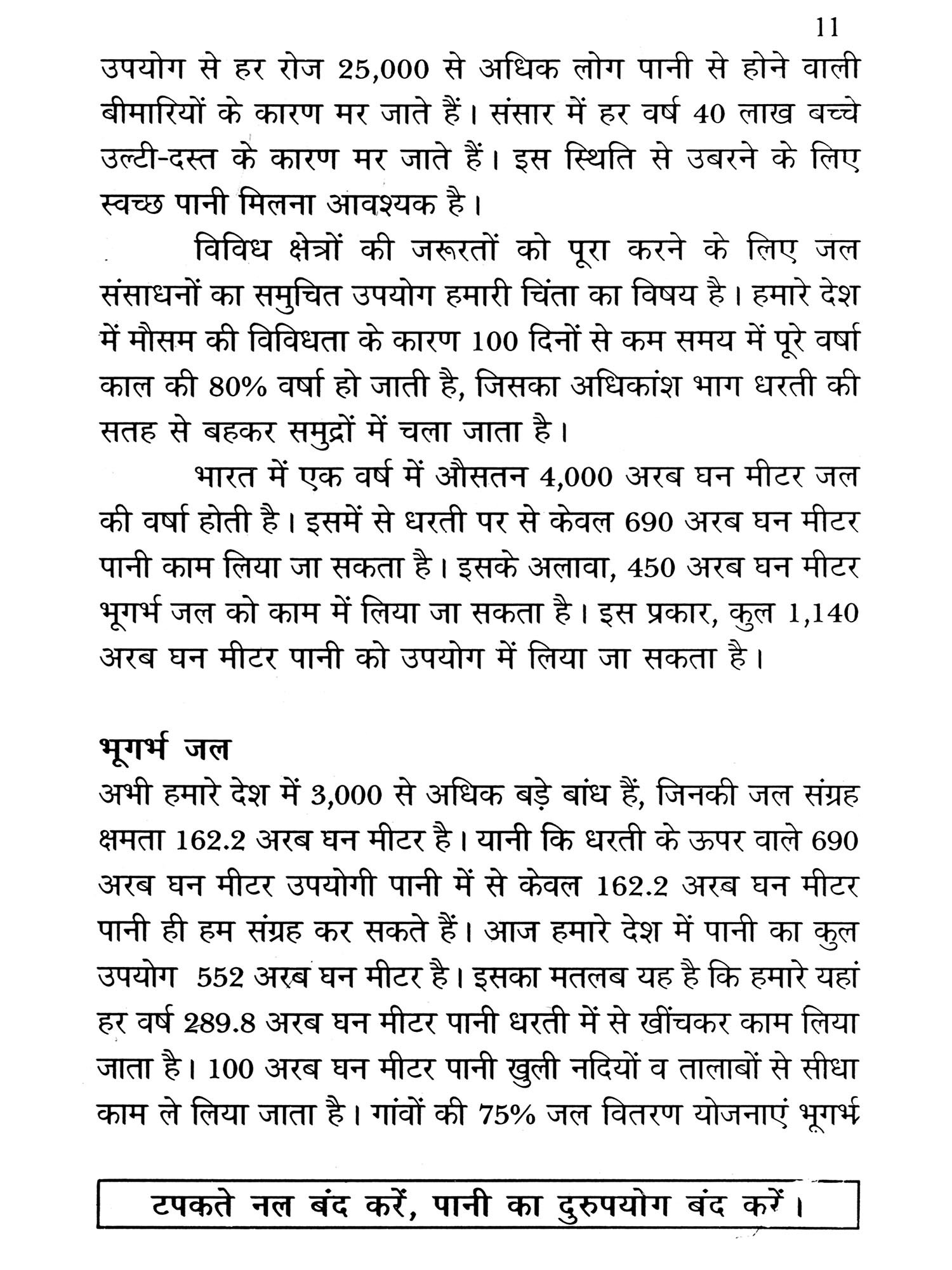 'बूंद-बूंद से सरोवर भर जाता है' कहावत के अनुसार बूंद-बूंद से सरोवर खाली भी हो जाता है, यह स्मरण रखने योग्य बात है। पानी का दुरुपयोग आखिरकार पानी की कमी उत्पन्न करता है।