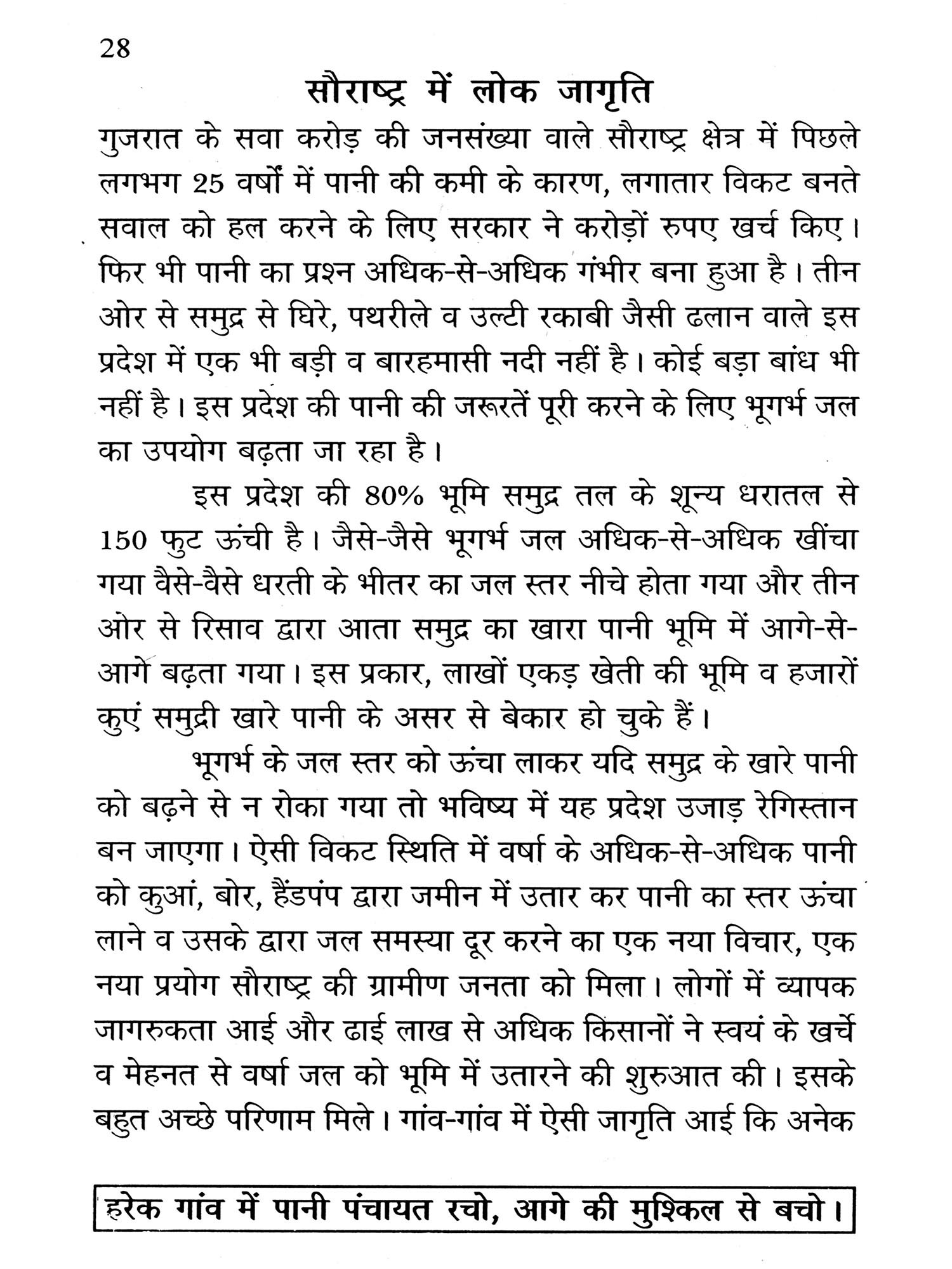 सामान्यतया आम आदमी ऐसा सोचता है कि पैसा, सरकारी सहायता या जनता से बड़ी सहायता के बिना कोई कार्य कैसे हो सकता है? परंतु बात ऐसी नहीं है। बजट के अनुसार सरकार कार्य तो करती ही है। देश-विदेश की सहायता व जनता की मदद से अनेकानेक स्वैच्छिक संस्थाएं भी कार्य कर रही हैं। आजादी मिलने के बाद से ही यह सब हो रहा है। फिर भी आज जन-सहयोग व जन-जागृति की आवश्यकता सभी स्वीकार करते हैं। पानी के रखरखाव के लिए यह मूल मुद्दा है।