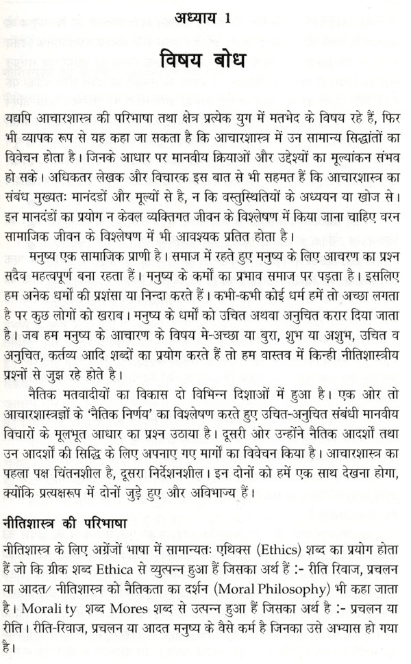 वैसे तो हिन्दी में अनेक पाठ्य-पुस्तके छात्रो को सुलभ है किन्तु नीतिशास्त्र की भाषा की क्लिष्टता तथा विचारों की जटिलता के स्थान पर सरल भाषा में पुस्तक प्रस्तुत किया है। महान नीतिशास्त्रीय विचारको के विचारो और सिद्धांतो को अवगत कराने व उनकी प्रारम्भिक समझ उत्पन्न करवाने की दिशा में एक कदम है। वे दार्शनिक जिनके विचार अत्यन्त महत्वपूर्ण तो है किन्तु कम चर्चित रहे है। उन पर विस्तार से चर्चा की गयी है। नीतिशास्त्र के विभिन्न आयामा से विद्यार्थियों को अवगत कराना इस पुस्तक का ध्येय है।