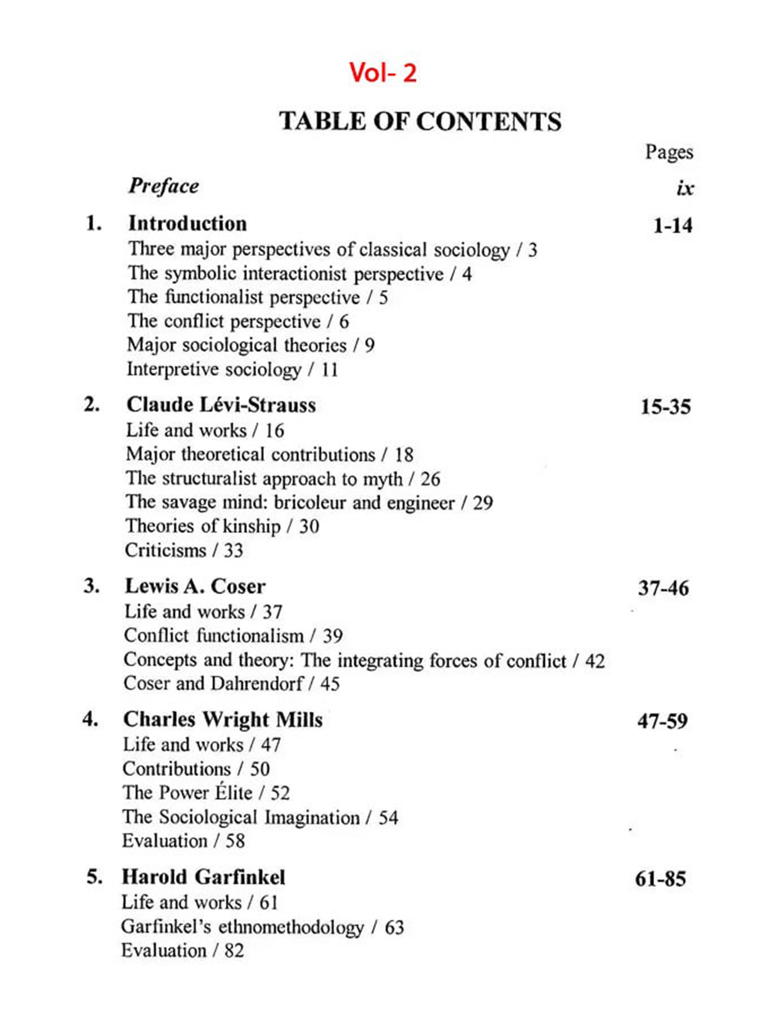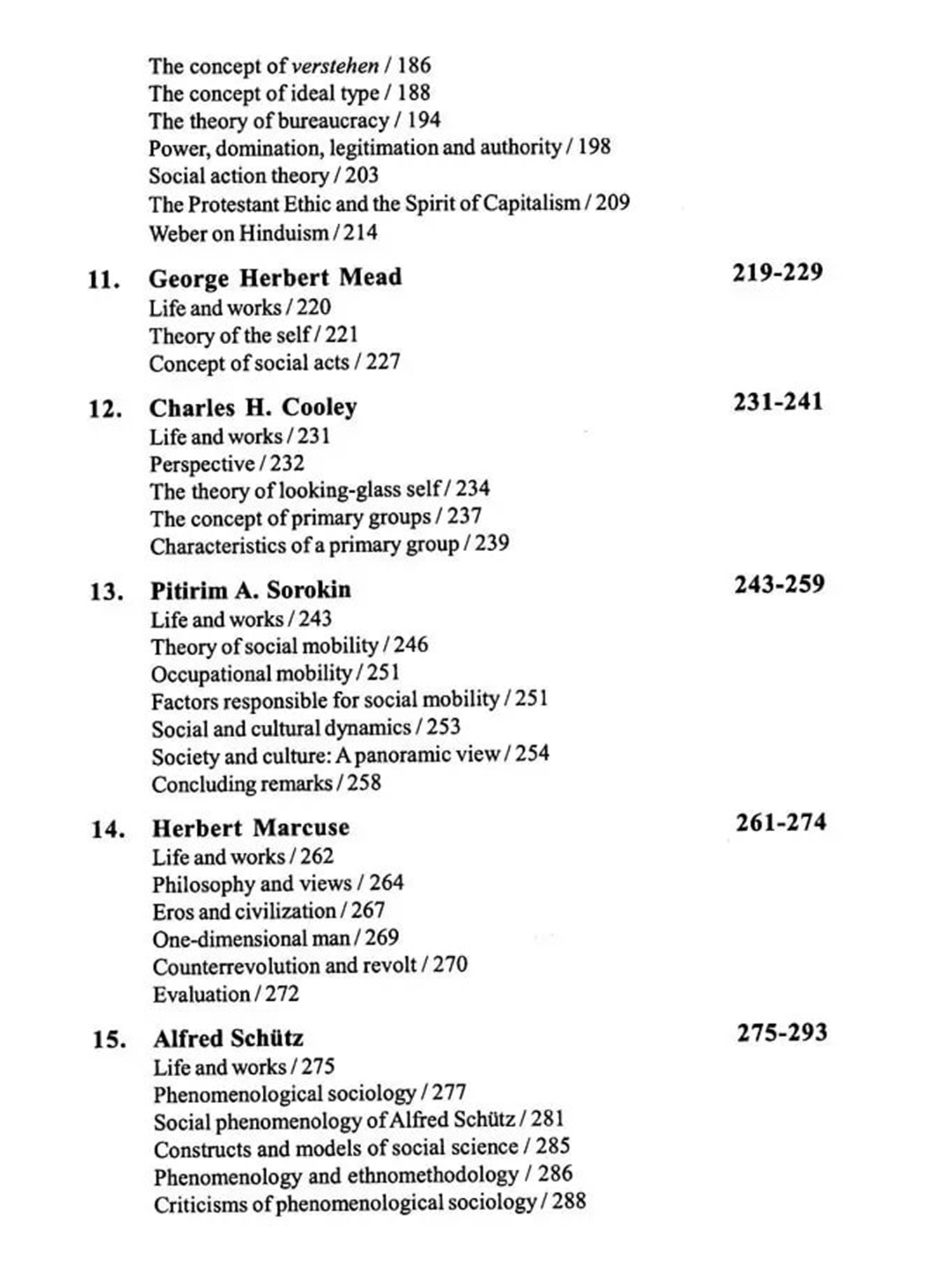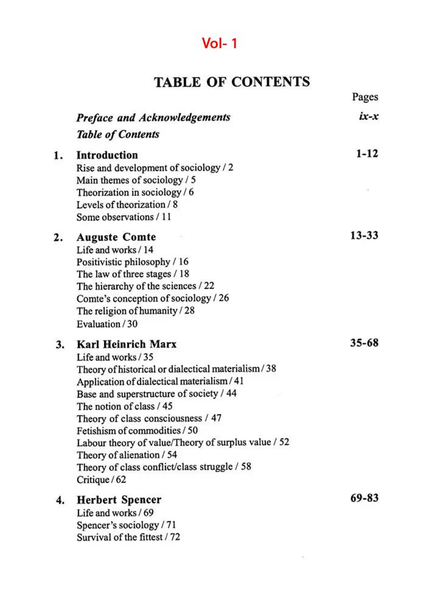 This is a book on a widely acclaimed topic of sociology. It attempts to deal with eighteen exponents of sociology in a chronological fashion who have rightly come to be regarded as masters of social thought. The book critically examines the major social thinkers from Auguste Comte to Robert K. Merton. The sociological thinkers covered are Auguste Comte, Karl Marx, Herbert Spencer, Vilfredo Pareto, Ferdinand Tönnies, Thorstein Bunde Veblen, David Émile Durkheim, Georg Simmel, Maximilian Karl Emil Weber, George Herbert Mead, Charles Horton Cooley, Pitirim A. Sorokin, Herbert Marcuse, Alfred Schütz, Herbert Blumer, Talcott Parsons, George C. Homans, and Robert K. Merton.